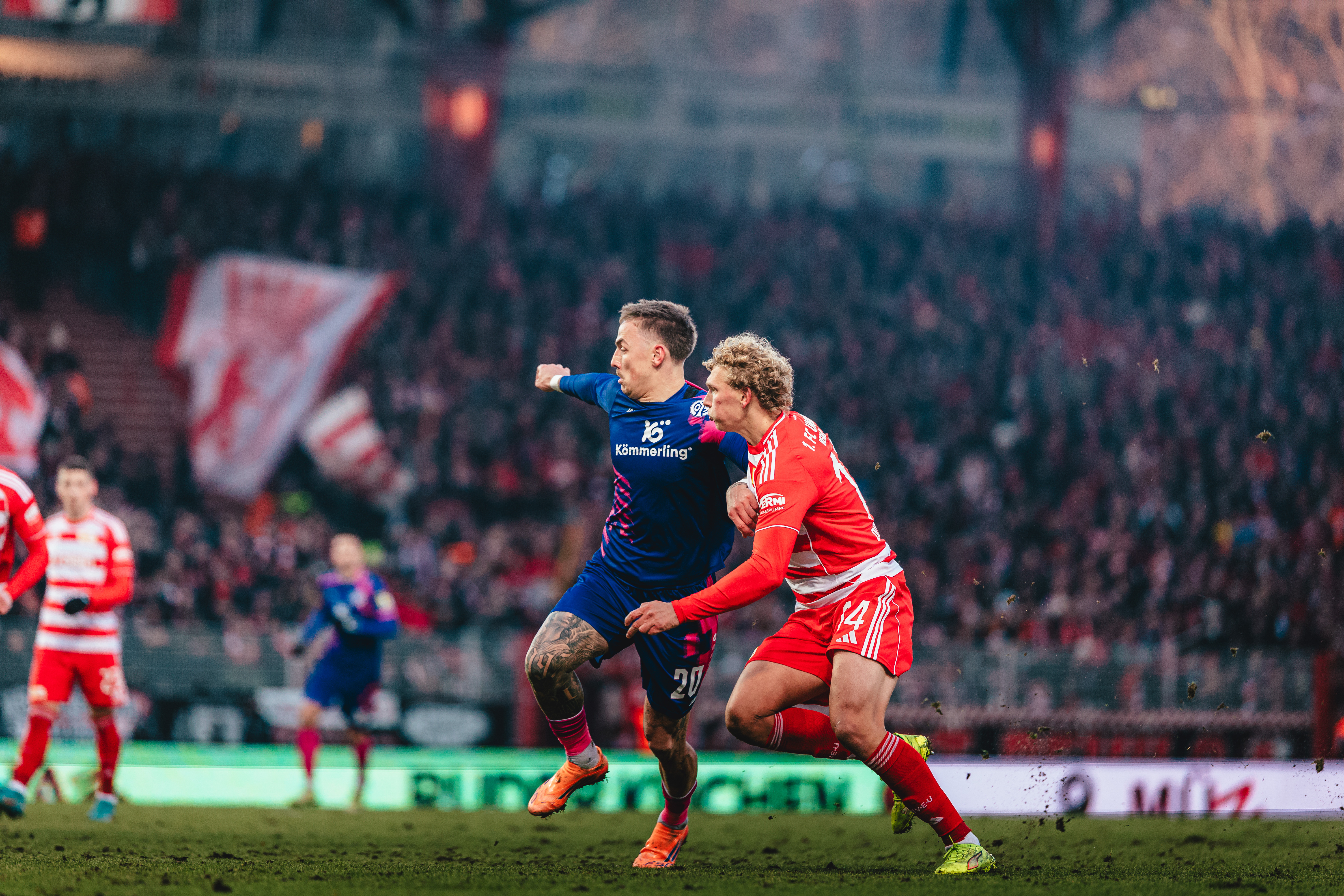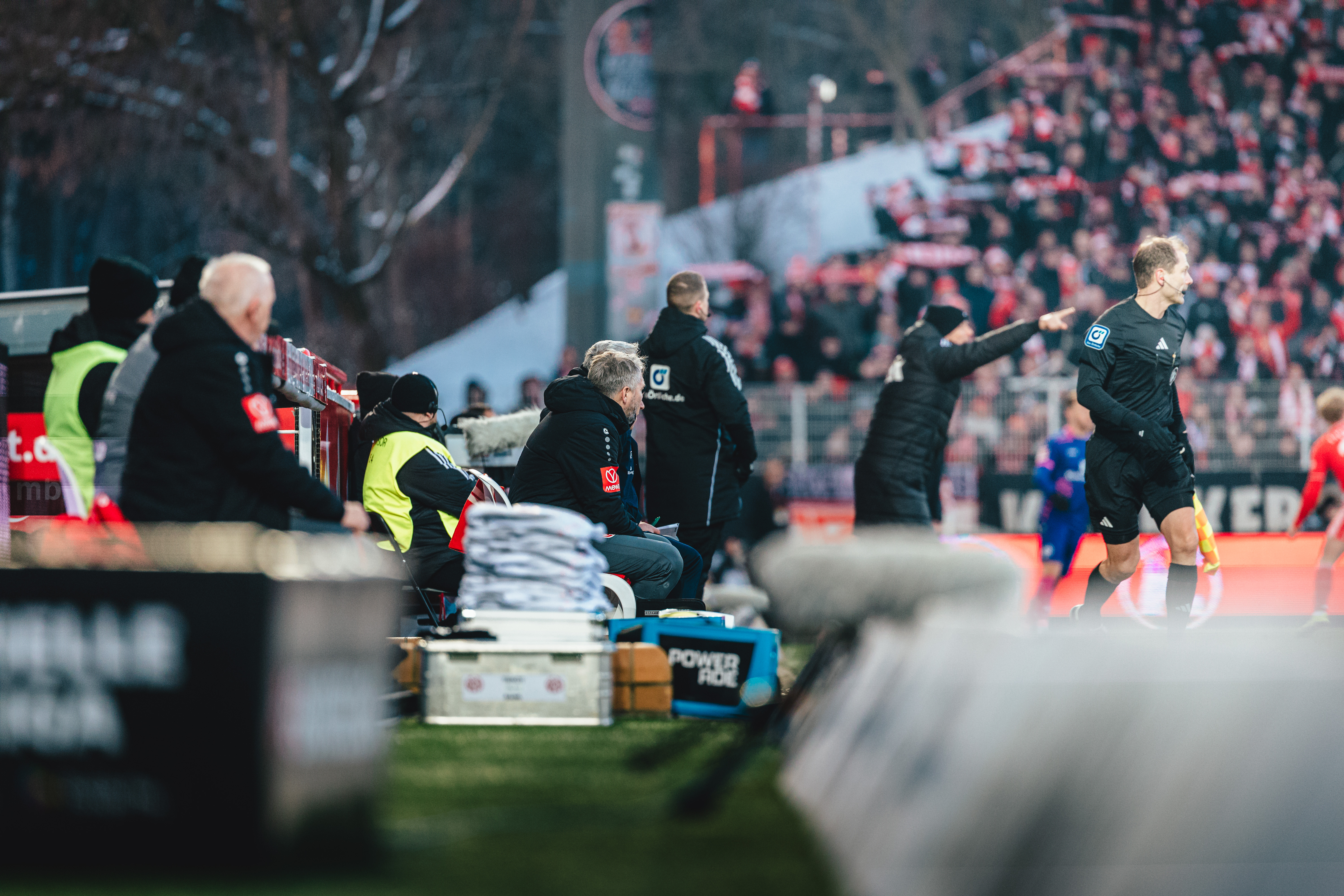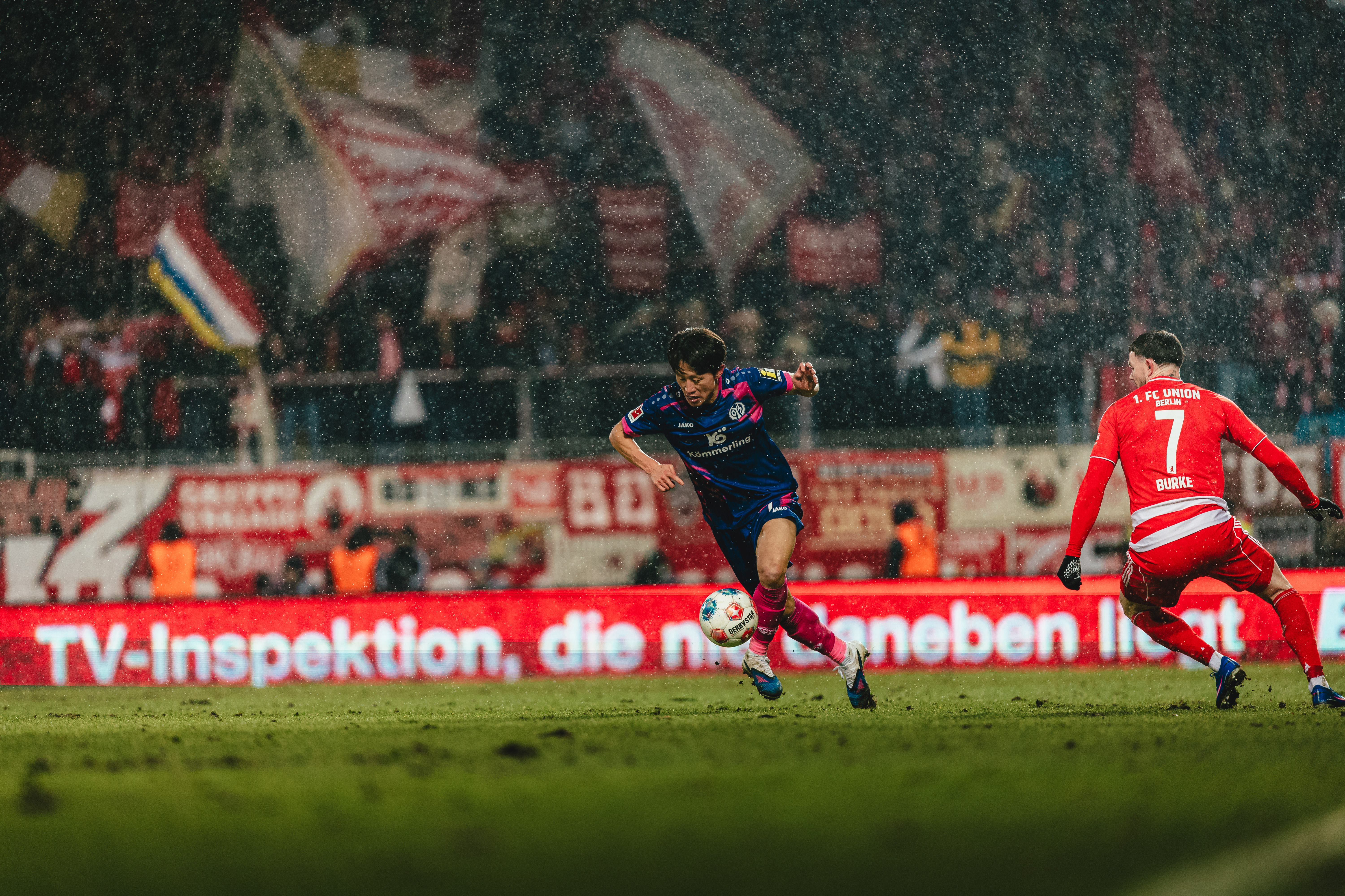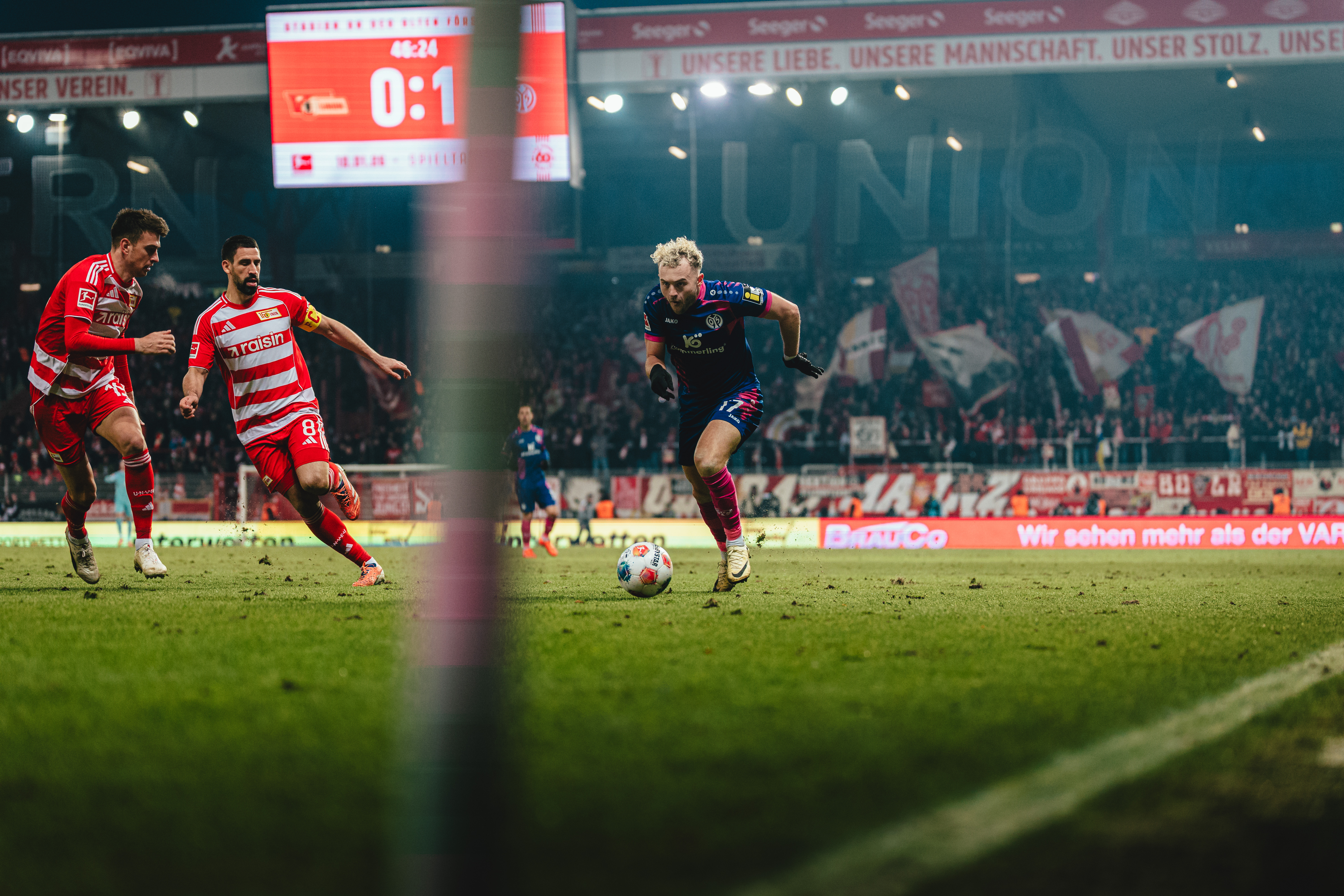 Beide Trainer verzichteten mit Wiederbeginn auf personelle Wechsel. Auf dem immer schwerer bespielbaren, tiefen Rasen präsentierte sich jedoch ein unverändertes Bild. Berlin versuchte viel, fand aber kaum Lücken, die Mainzer agierten diszipliniert und warteten auf Umschaltoptionen in einem kraftraubenden Kräftemessen. Die erste Chance hatten die Unioner nach einer Stunde, als ein langer Ball durchrutschte zu Burke, der aus halblinker Position an Batz Schienbein scheiterte (60.). Und auch vier Minuten später war Batz zur Stelle, nachdem erneut Burke abgezogen hatte (64.). Weil Union vorne keine Durchschlagskraft entfalten konnte, waren es die Gäste, die fünf Minuten später mit der ersten Gelegenheit nach Wiederbeginn auf 2:0 stellten. Und wieder war es Lee, der dem Tor den Weg ebnete. Der Südkoreaner schickte Veratschnig auf links Richtung Grundlinie, der Österreicher flankte mit dem ersten Kontakt flach vors Tor, wo ausgerechnet der ehemalige Berliner Hollerbach freistehend sein erstes Bundesliga-Tor als 05ER markierte (69.). Fast hätte der Angreifer binnen kürzester Zeit den Doppelpack geschnürt, setzte seinen Abschluss aus 14 Metern wenig später aber nur an den Querbalken (72.). Während die Mainzer damit die Vorentscheidung verpasst hatten, läutete Union mit dem Anschluss nach 77 Minuten eine hochspannende Schlussphase ein, in der den Mainzern die Kräfte auszugehen schienen: Derrick Köhn hatte Silvan Widmer stehen lassen, präzise ins Zentrum geflankt, wo Jeong Batz aus sechs Metern keine Chance ließ.