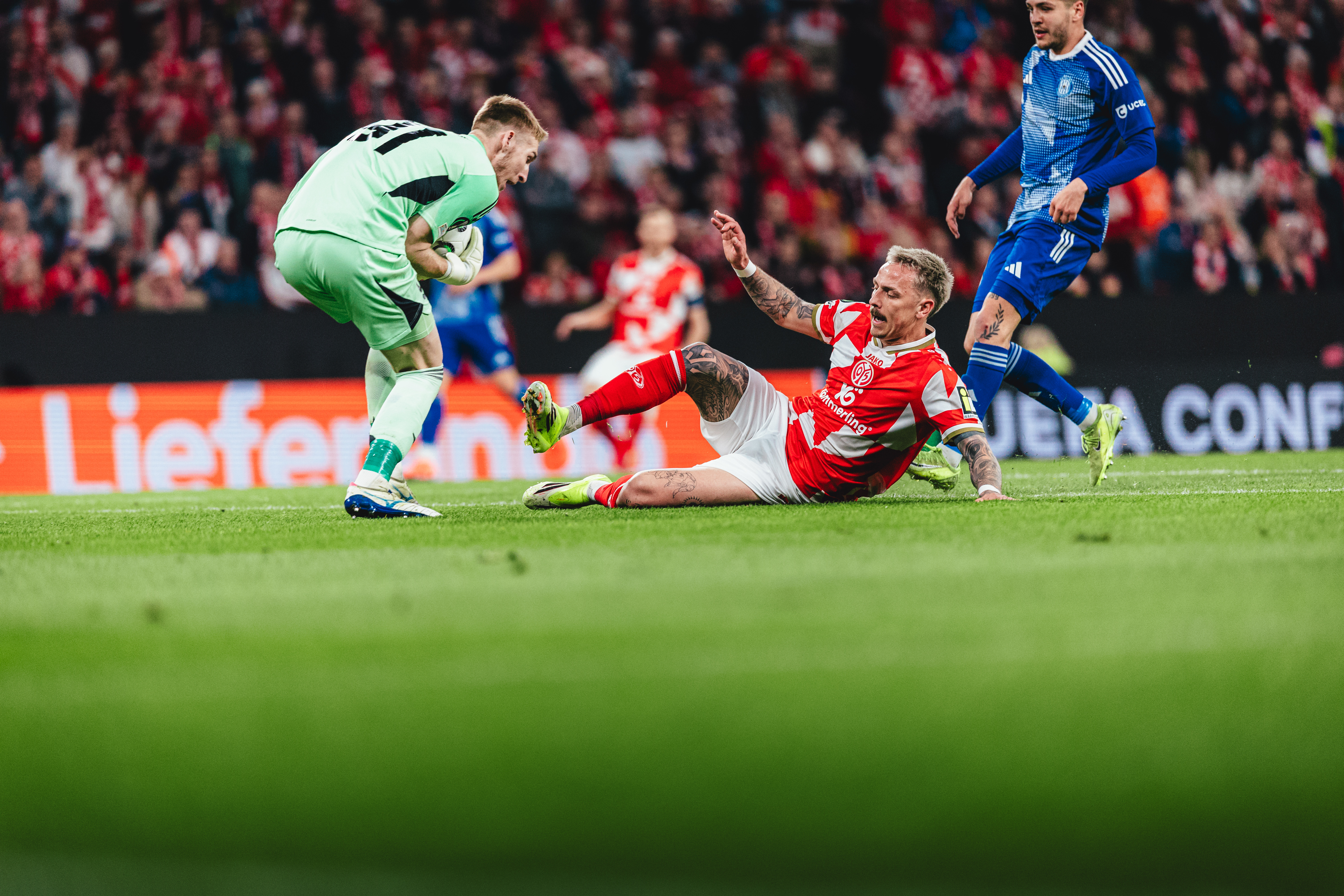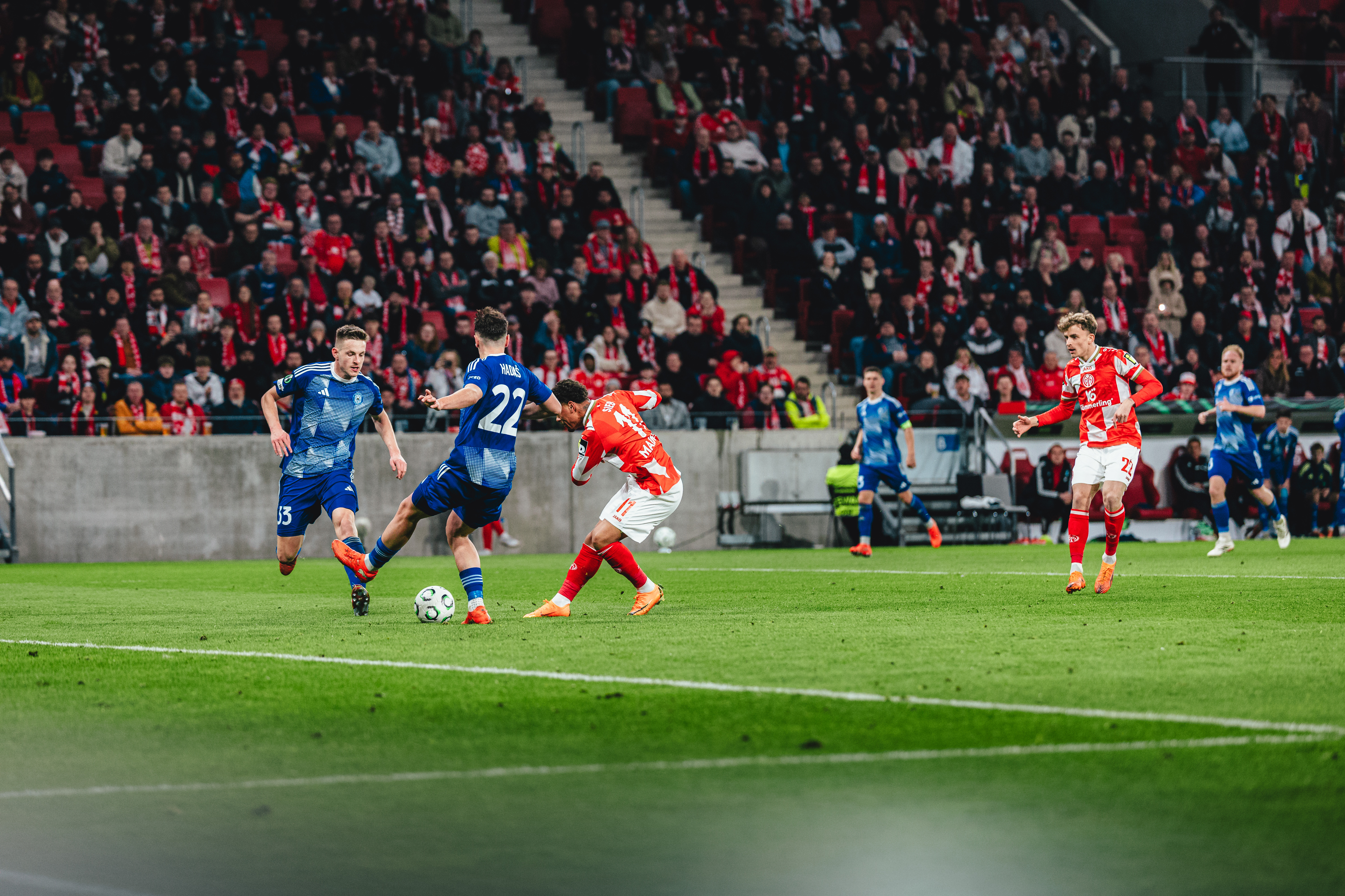 Die Partie gestaltete sich im Anschluss etwas ausgeglichener. Zwar lag die Spielkontrolle weiterhin auf Mainzer Seite, aber erst in der 35. Minute sorgten die Rheinhessen wieder für Gefahr. Tietz hatte sich auf dem rechten Flügel durchgesetzt und den freistehenden Phillip Mwene auf der linken Seite gesehen. Der Außenverteidiger zog nach innen und schlenzte den Ball knapp neben den rechten Pfosten. Kurz vor dem Pausenpfiff erhöhte die Fischer-Elf nochmal den Druck. Ein Kopfball von Jae-sung Lee (43.), der Schuss von Tietz (44.), der Kopfball seines Sturmpartners Weiper und Mwenes Linksschuss fanden jedoch nicht den Weg ins Tor. Es blieb beim torlosen Unentschieden zur Halbzeit in der stimmungsvollen MEWA ARENA, weil die Chancenverwertung der Gastgeber noch zu wünschen übrig ließ.