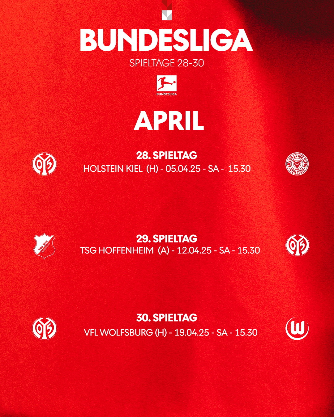 Die Deutsche Fußball Liga hat am Donnerstagvormittag weitere zeitgenaue Ansetzungen bekanntgegeben. Demnach ist der 1. FSV Mainz 05 an den Spieltagen 28, 29 und 30 jeweils zur traditionellen Bundesliga-Anstoßzeit gefordert.