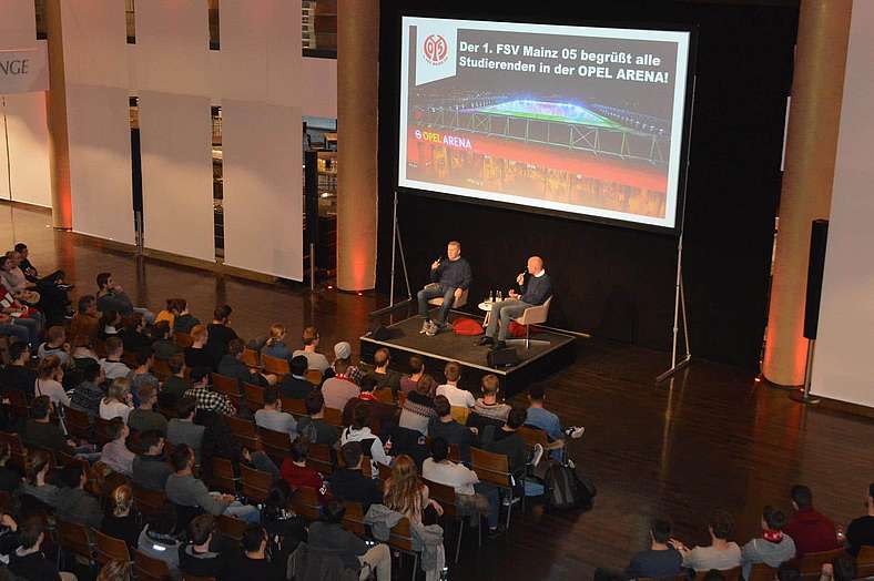 Im Rahmen der rund 90-minütigen Veranstaltung wurden dabei u.a. aktuelle Themen wie der Videobeweis diskutiert, allgemeine Fragen zur Transferpolitik der 05er beantwortet sowie der sportliche Wettbewerb in der Bundesliga analysiert. "Wir freuen uns über den Zuspruch und das Interesse der Studierenden, für die Mainz in den kommenden Jahren zum Lebensmittelpunkt werden wird", sagte Sportvorstand Schröder. "Unsere Aufgabe und unser Anspruch ist es, alle Bewohner dieser schönen Stadt mit Bundesliga-Fußball zu unterhalten. Nicht nur aufgrund der geographischen Lage des Campus, der die Schnittstelle zwischen dem Bruchweg und der OPEL ARENA markiert, ist der enge Kontakt zur Johannes Gutenberg-Universität für uns als Verein nur logisch. Von den knapp 210.000 Einwohnern der Stadt sind fast 20 Prozent Studierende, Semester für Semester kommen neue hinzu. Viele sind schon Fußballfans, viele werden Fans von Mainz 05. Wir freuen uns über jeden neuen Fan, der den kurzen Weg zu uns in die OPEL ARENA antritt", so Schröder weiter.