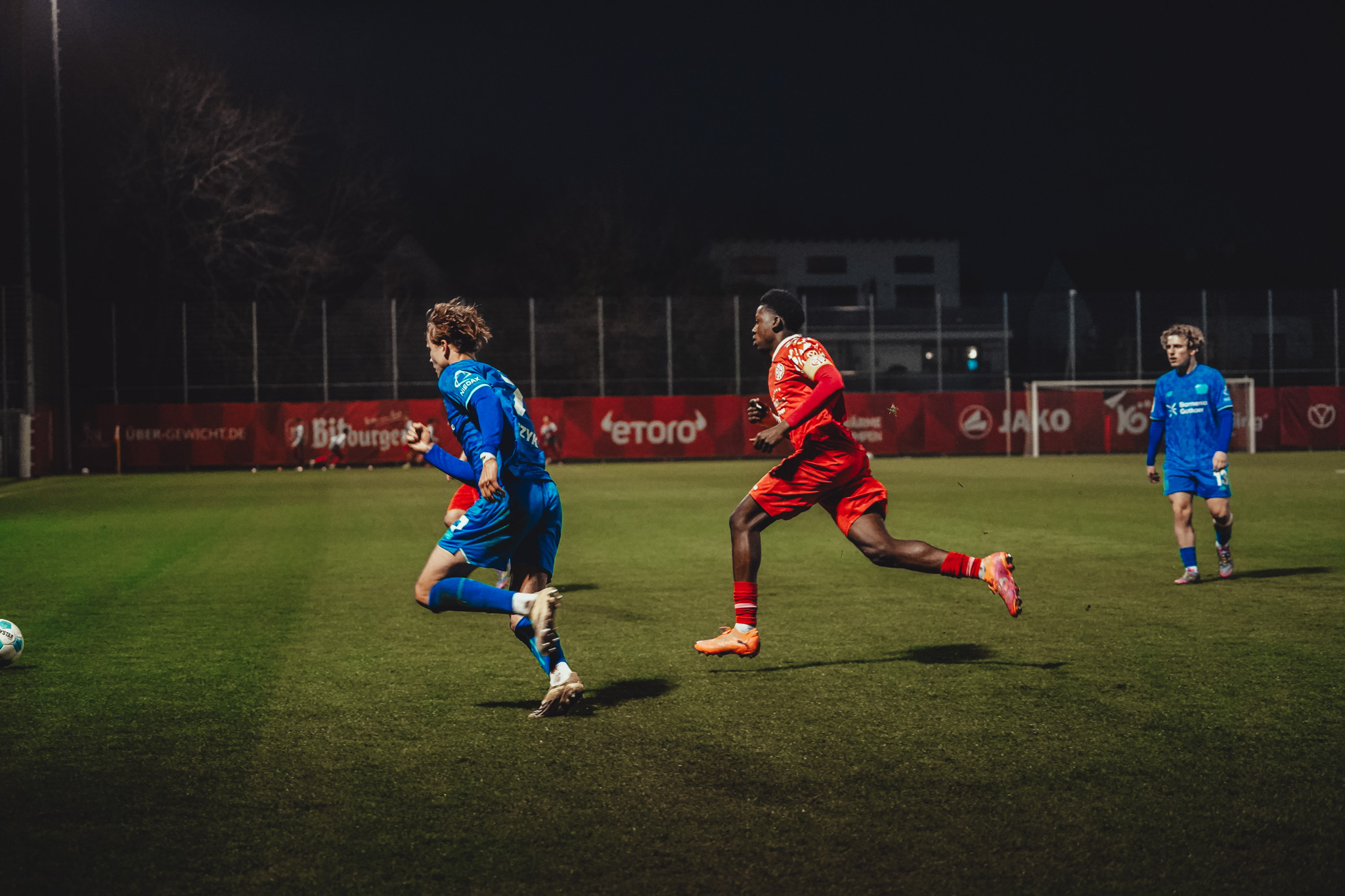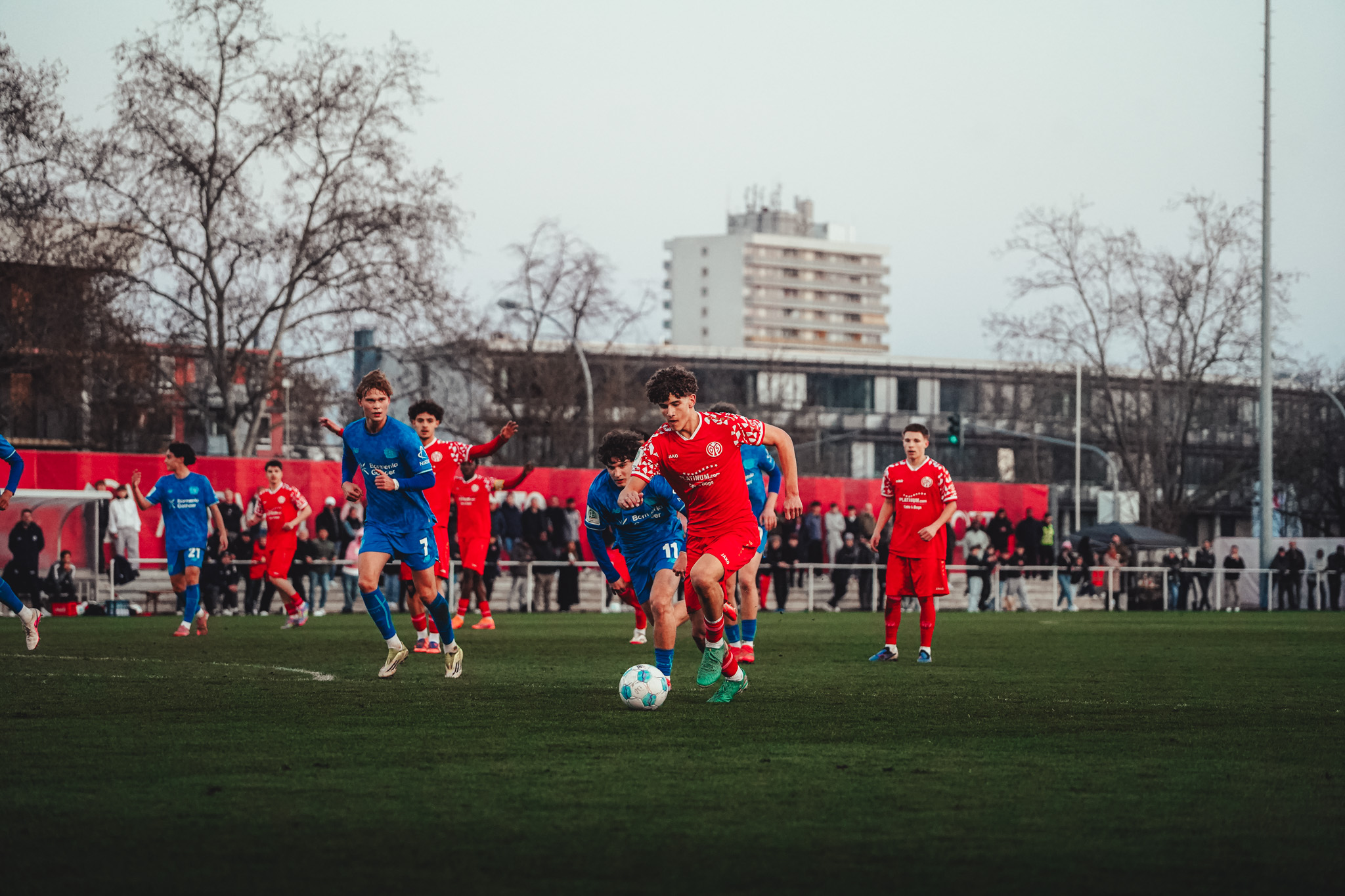 Die Partie begann intensiv und war früh von vielen Zweikämpfen geprägt, wobei die Mainzer schnell die Spielkontrolle a sich rissen. Die erste nennenswerte Offensivaktion gehörte den Gastgebern: Simon Tedla eroberte im Mittelfeld den Ball, leitete einen Doppelpass mit Justin Baldwin ein und suchte anschließend selbst den Abschluss ins linke Eck – Bayer-Keeper Dani Scheffer parierte jedoch sicher (11.). Auch Top-Torjäger Luca Hampel setzte immer wieder offensive Impulse: Zunächst brachte er einen Freistoß aus dem Halbfeld präzise in den Strafraum, wo Fynn Wombacher zum Abschluss kam, aber am Torhüter scheiterte (20.). Wenig später setzte Hampel zu einem dynamischen Solo an, drang in den Strafraum ein, konnte seinen Versuch jedoch nicht mit ausreichend Druck auf das Tor bringen (24.). Die Gastgeber blieben tonangebend und erspielten sich weitere Möglichkeiten. In der 35. Minute marschierte Fabio da Silva Santos mit Tempo auf die gegnerische Abwehr zu und schloss noch vor dem Strafraum ab, stellte Scheffer damit jedoch vor keine größere Herausforderung.