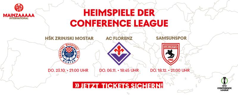 Mainz 05 international! Nach über neun Jahren kehrt der FSV zurück auf die internationale Bühne. In der Ligaphase der Conference League warten sechs unterschiedliche Gegner. Auswärts müssen die 05ER bei Omonia Nikosia (Zypern), Universitatea Craiova (Rumänien) und Lech Posen (Polen) ran, in der MEWA ARENA sind HSK Zrinjski Mostar (Bosnien-Herzegovina), AC Florenz (Italien) und Samsunspor (Türkei) zu Gast.