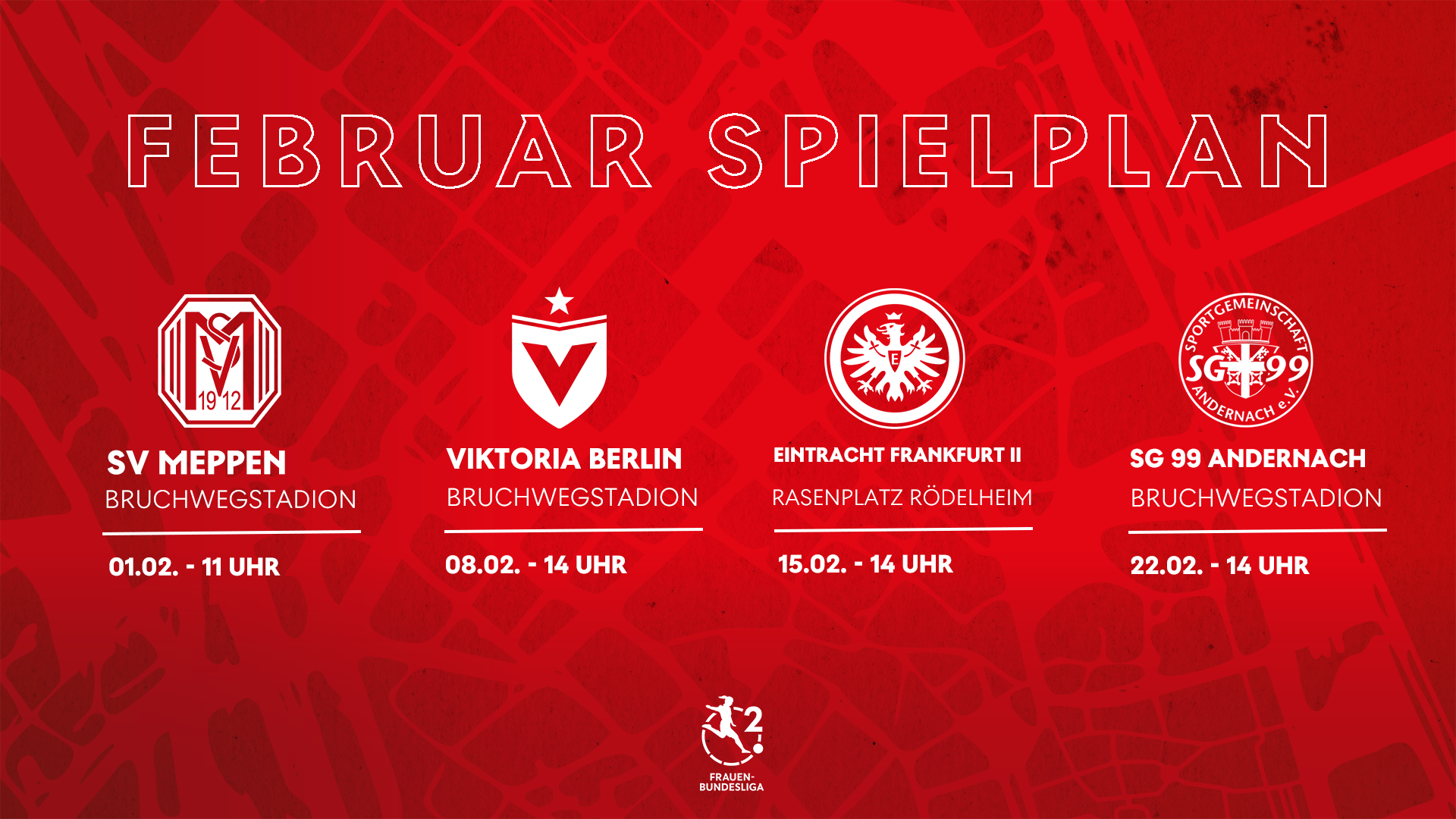 In gut zwei Wochen geht es für den FSV in der 2. Frauen-Bundesliga weiter. Nach dem Auftakt gegen den SV Meppen (Sonntag, 01. Februar, 11 Uhr, Bruchwegstadion) winken im nächsten Monat zwei weitere Heimspiele, einmal sind die 05-Frauen derweil auswärts gefordert und treten die kurze Reise zur Zweitvertretung von Eintracht Frankfurt an.