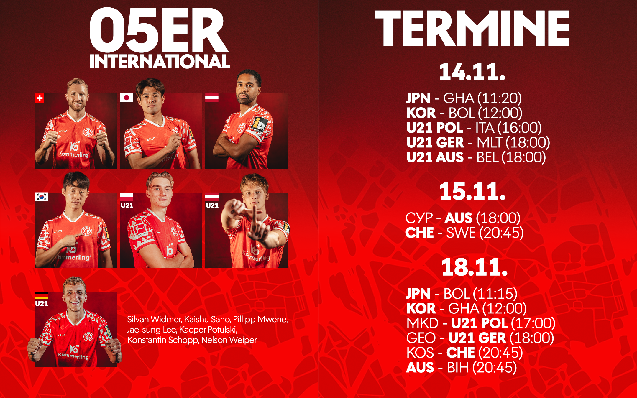 Die dritte Länderspielpause der laufenden Saison läuft. Insgesamt sieben Akteure aus dem Profikader der 05ER sind mit ihren Nationalmannschaften unterwegs.
