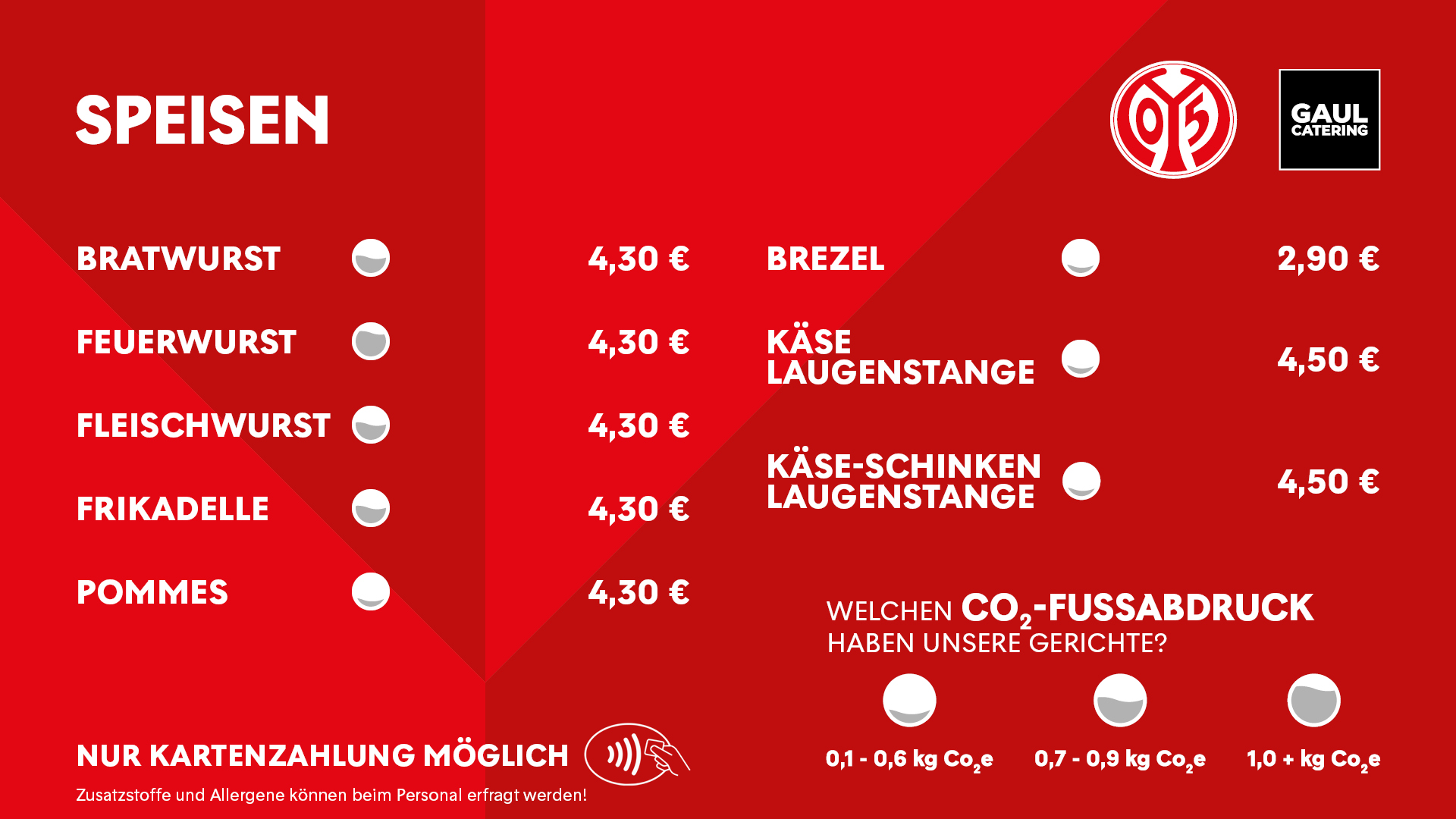 Zum Heimspiel gegen den AC Florenz in der UEFA Conference League werden im Public-Bereich der MEWA ARENA die CO₂e-Emissionen der Speisen ausgewiesen. Gemeinsam mit Gaul Catering arbeitet der FSV schon länger daran, das Angebot weiterzuentwickeln – mit mehr vegetarischen Alternativen und mit größerer Transparenz für alle Fans. Die Nachfrage nach fleischlosen Optionen steigt stetig, unabhängig vom Nachhaltigkeitsaspekt. Die CO₂e-Ausweisung ist ein weiterer Schritt auf dem Weg, den ökologischen Fußabdruck des Vereins zu reduzieren – und sie wird auch künftig dauerhaft beibehalten.
