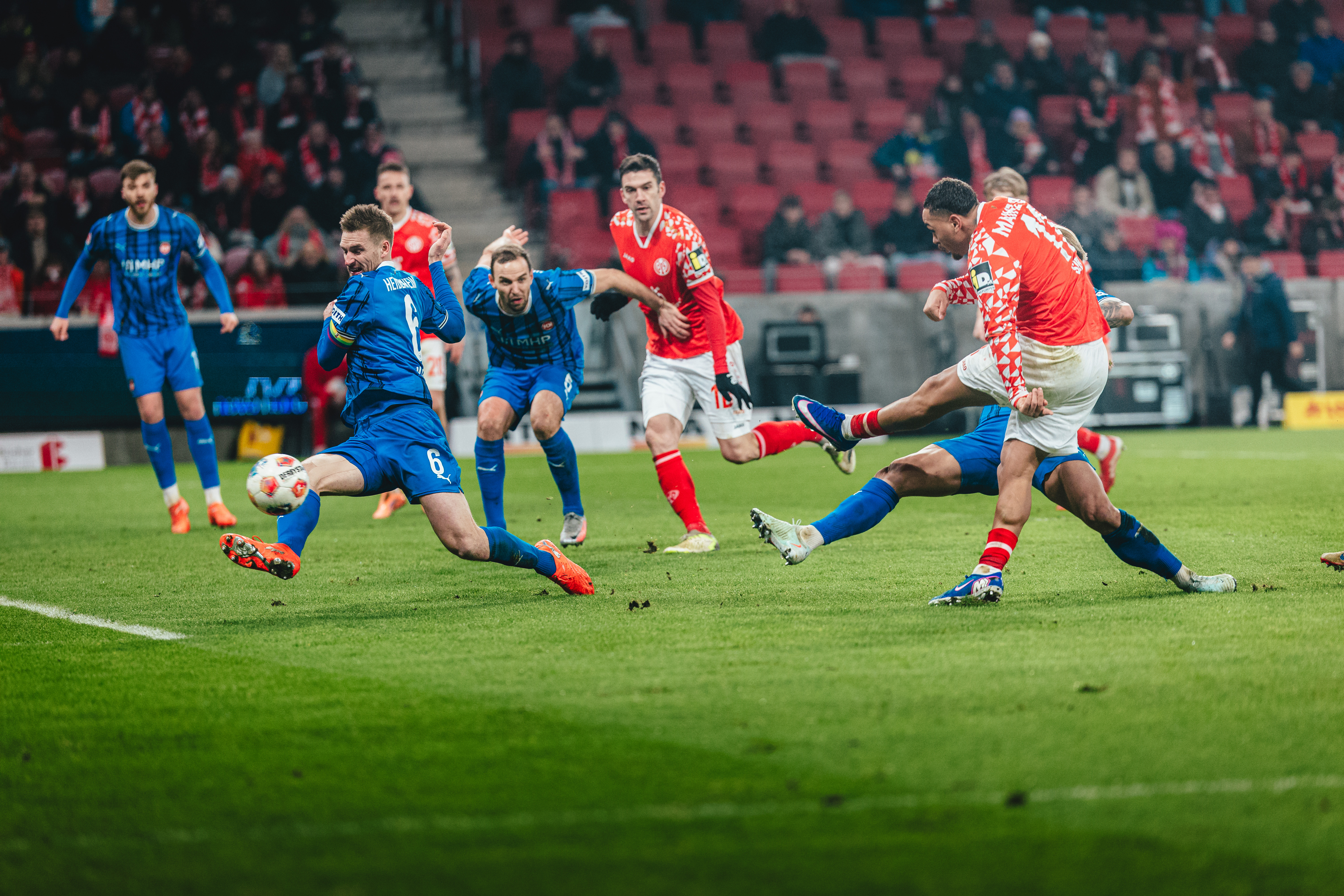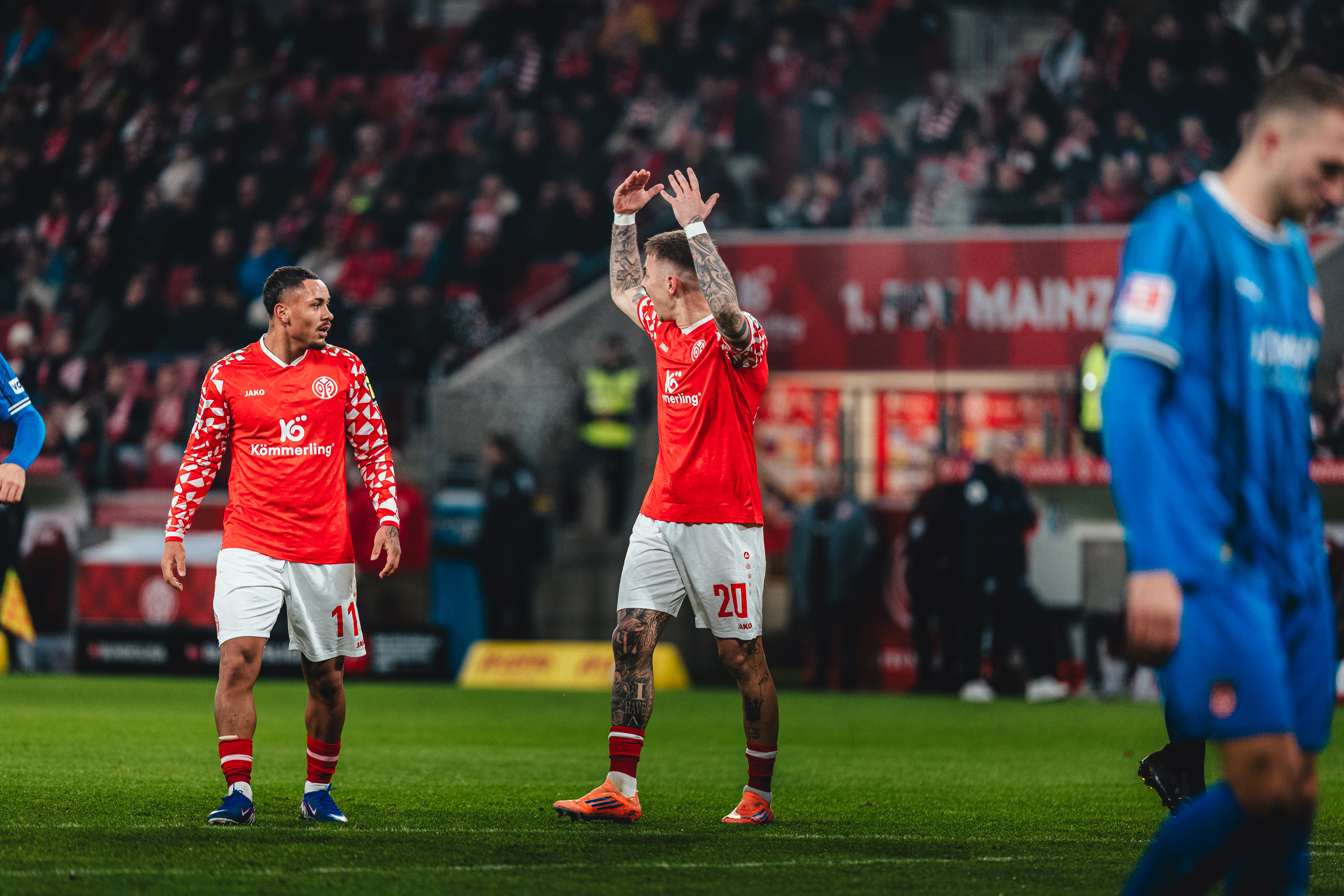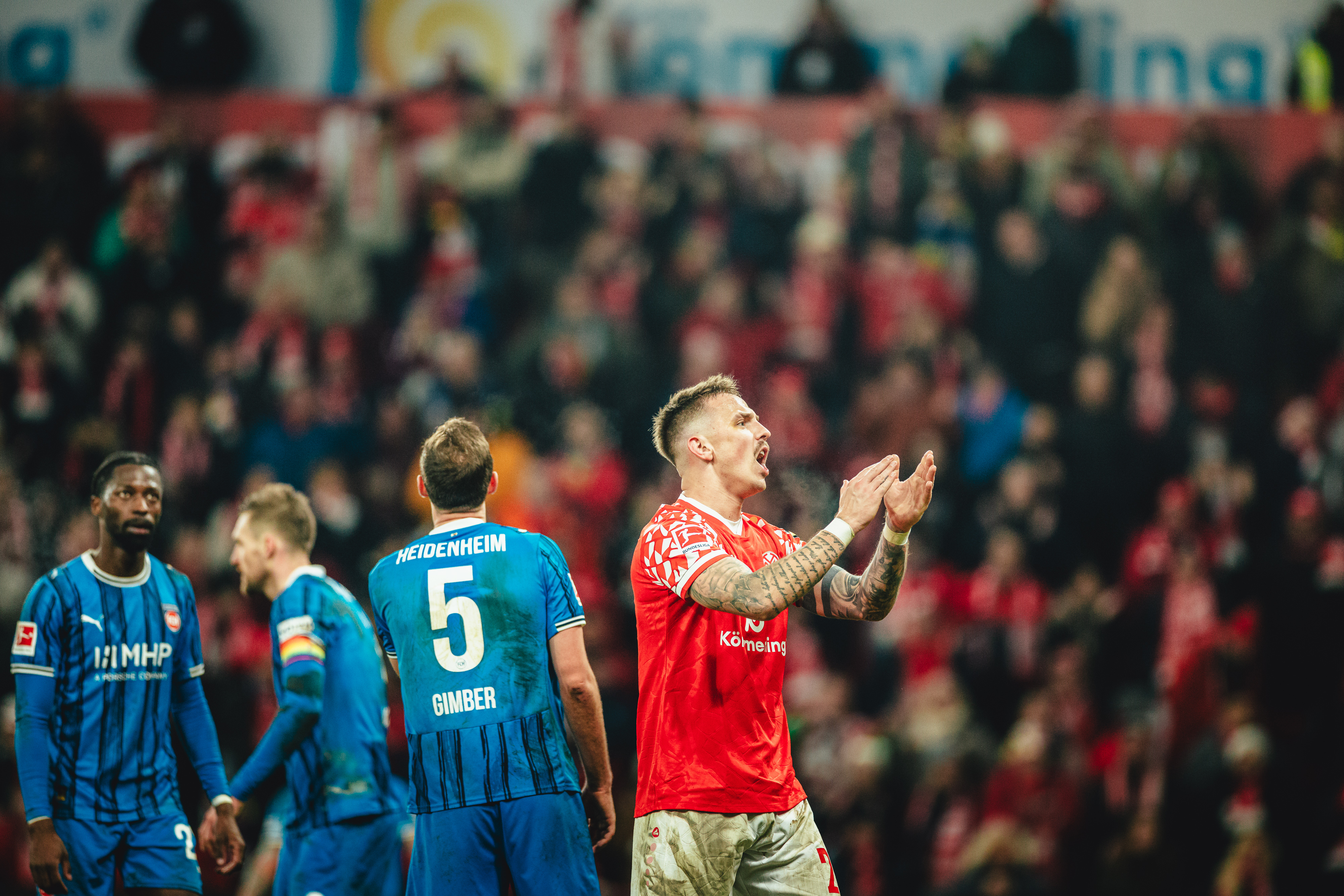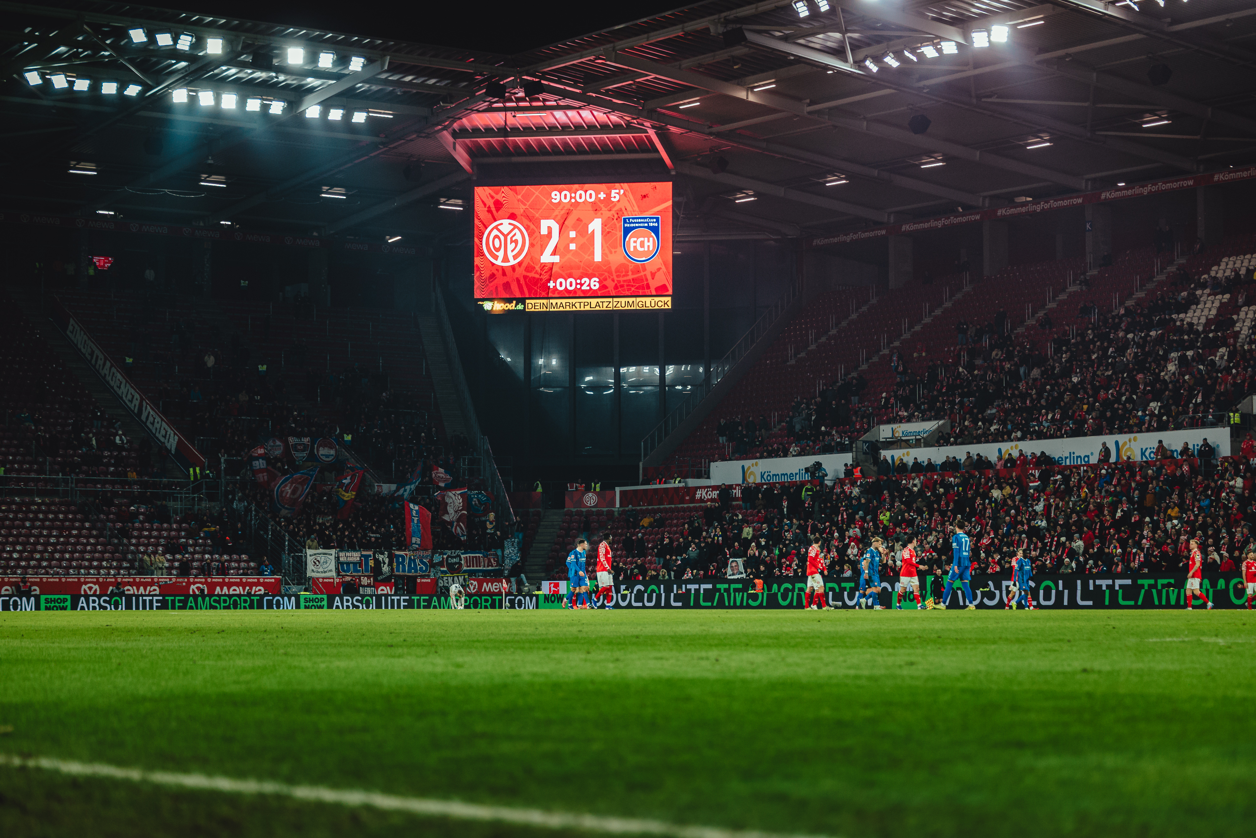 Das 2:1 aus Sicht der 05ER brachte die Gäste zurück in die Partie. Der FCH hatte Chancen auf den Ausgleich, der FSV schwamm in dieser Phase. Erneut Ibrahimovic, Sirlord Conteh und Andreas Beck hatten den zweiten Heidenheimer Treffer auf dem Fuß (63./64./65.). Das Spiel wog nun hin und her, beide Teams agierten mit offenem Visier, Abstiegskampf pur in der MEWA ARENA. Die 05ER befreiten sich aus dieser wilden Phase der Partie und hatten in Person des engagierten Tietz die nächste Gelegenheit. Der Mainzer Angreifer war nach einem langen Schlag früher am Ball als Ramaj, setzte den Kopfball aber knapp über das Gästetor (79.). In der Schlussphase erhöhten die Gäste nochmal den Druck und warfen alles nach vorne. Bei ihrem Torhüter und dem Querbalken konnten sich die 05ER in der 86. Minute bedanken. Der abgefälschte Schuss von Ibrahimovic landete knapp vor der Linie. In der fünfminütigen Nachspielzeit sollten Lennard Maloney und Arnaud Nordin mithelfen, die Führung über die Zeit zu bringen. Tietz und Amiri gingen dafür vom Platz. Es blieb bis zum Abpfiff nach fünfminütiger Nachspielzeit beim 2:1, mit dem die 05ER nach langer Zeit wieder einen Heimsieg und einen insgesamt wichtigen Erfolg mit ihren Fans feiern konnten.