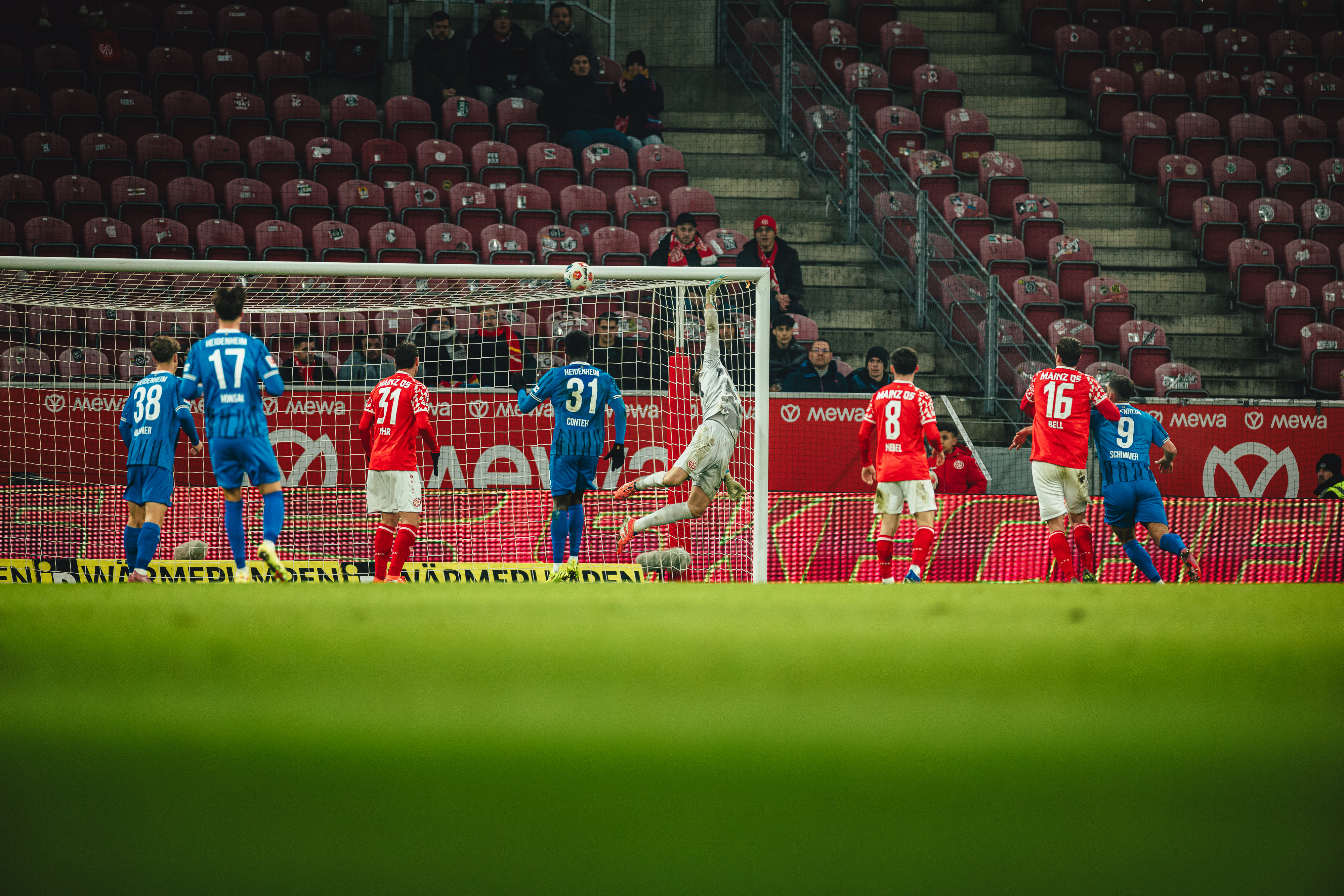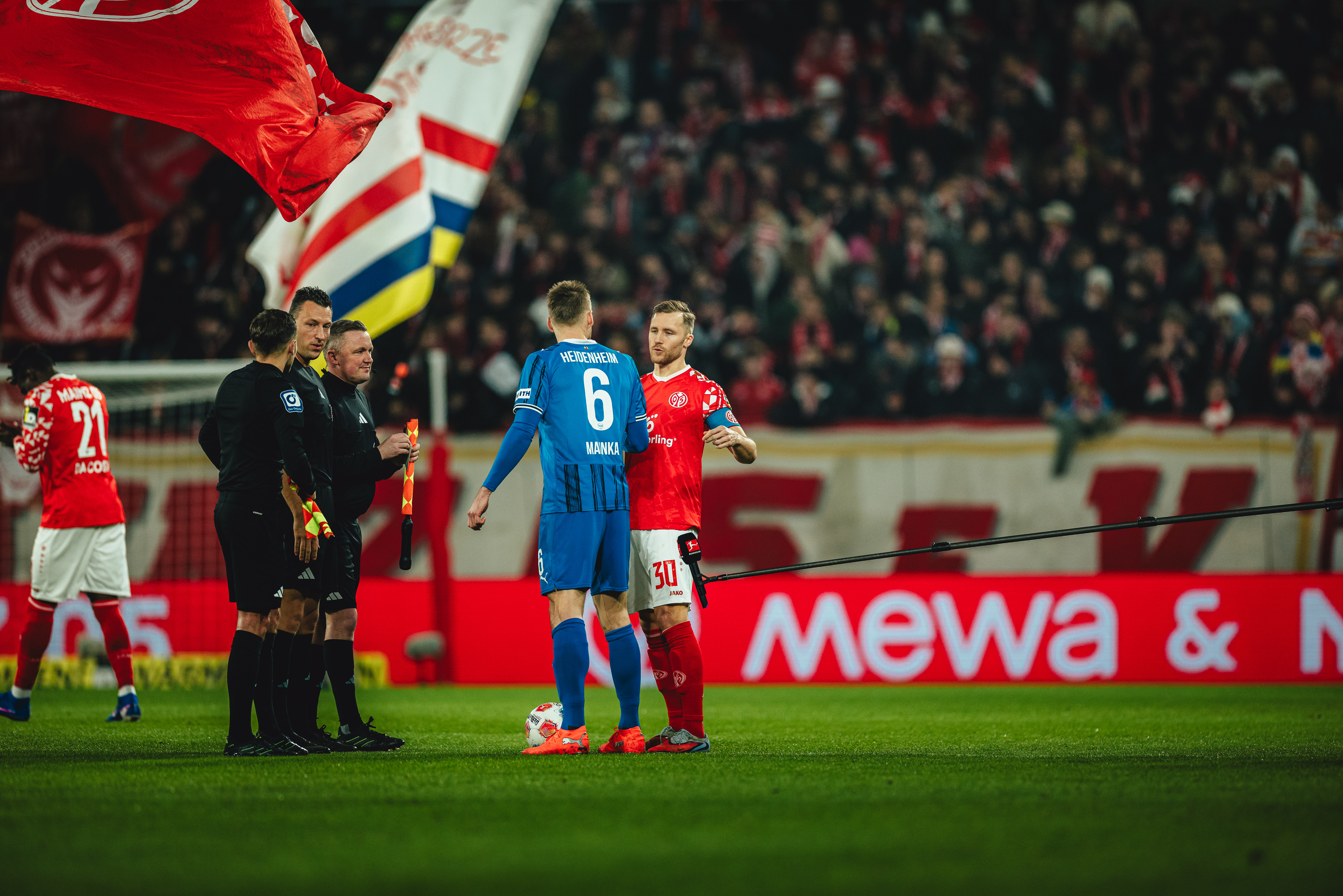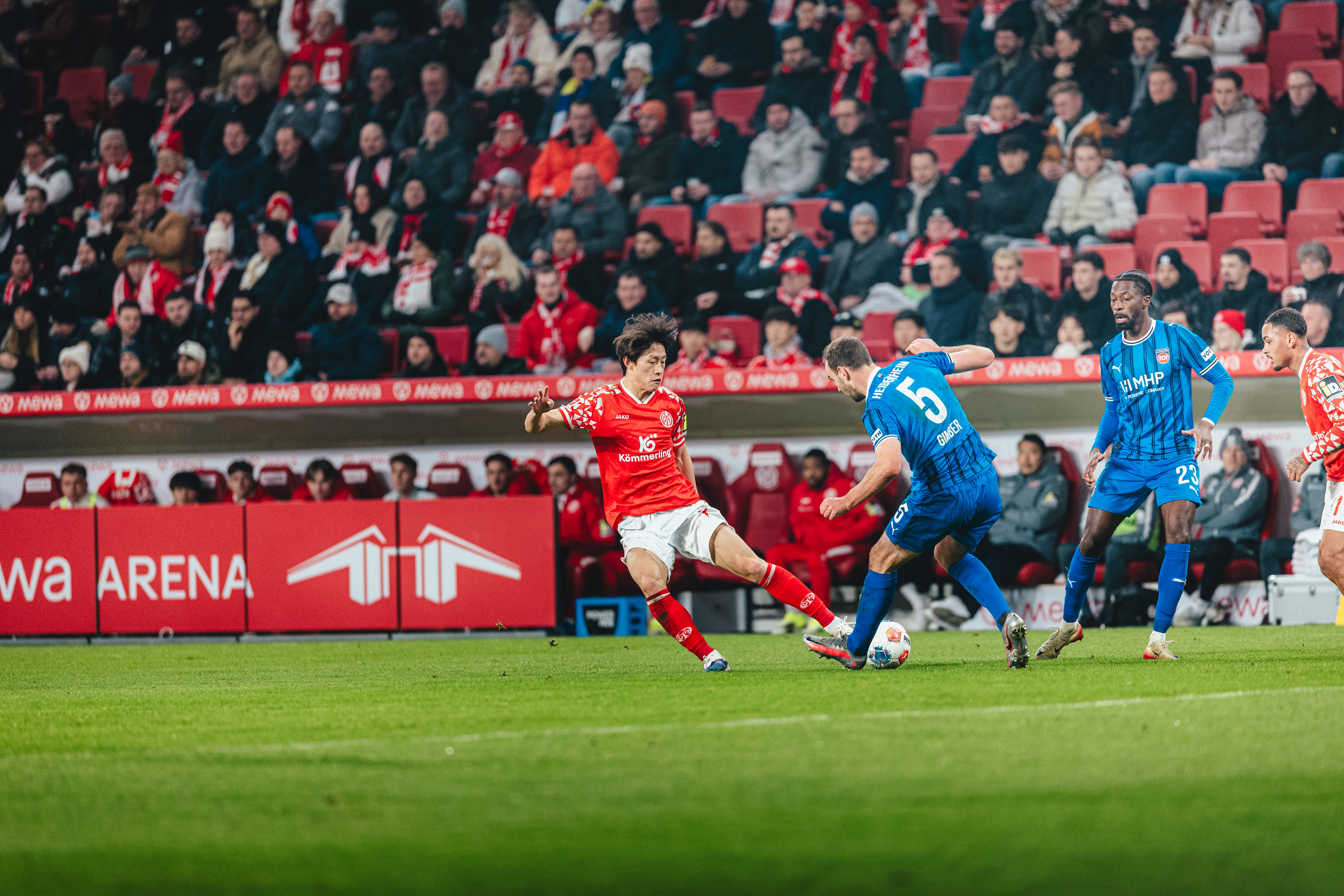 Es brauchte den Mainzer Kapitän und einen Fehler des Heidenheimer Torhüters für die in dieser Phase überraschende Führung des FSV. Ramaj hatte einen Ball zu kurz geklärt, Jae-sung Lee nahm die Kugel in Strafraumnähe auf und leitete gedankenschnell weiter auf Widmer, der aus etwa sieben Metern per Direktabnahme einschießen konnte - 1:0 (30.). Nach dem Jubel folgte allerdings eine Hiobsbotschaft für die Gastgeber. Verletzungsbedingt musste Veratschnig den Platz verlassen, Kacper Potulski ging in die Innenverteidigung, Danny da Costa übernahm den Part des Österreichers auf der rechten Schiene (34.). Der Treffer gab den Gastgebern Auftrieb. Zunächst verpasste Amiri denkbar knapp eine Lee-Hereingabe, kurz danach strich ein Tietz-Kopfball am linken Pfosten vorbei (36.). Bis zum Pausenpfiff von Schiedsrichter Sven Jablonski passierte nichts nennenswertes mehr, es blieb bei der insgesamt verdienten, aber knappen Führung für die 05ER in einem Spiel, das vor allem vom Kampf geprägt war.