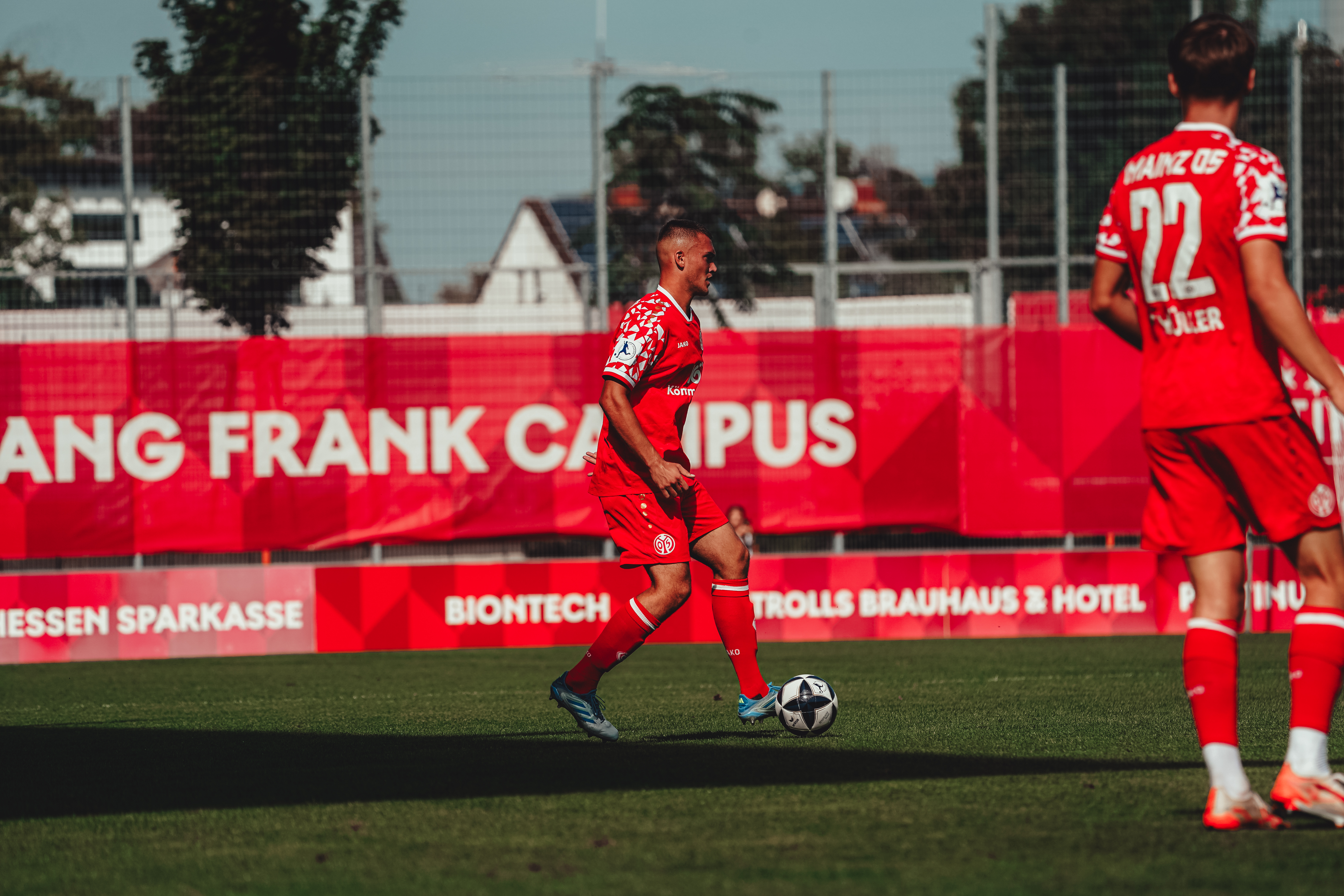 Nach dem 2:0-Sieg gegen die TSG Balingen hatte Hoffmann seine Startelf auf fünf Positionen verändert. Anstelle von Jason Amann, Maxim Leitsch, Jusuf Ugljanin, Mokesse Bamba und Raul König durften Schopp, Kasey Bos, Kacper Potulski, Philipp Schulz und Niklas Tauer beginnen. Den besseren Start erwischten die Hausherren, die 90 Sekunden das erste Mal gefährlich wurde. Nach einem weiten Einwurf in den Mainzer Strafraum versuchte es Phil Halbauer mit einem Schuss aus dem Rückraum, doch Luke Gauer hatte aufgepasst und parierte den ersten Abschluss der Partie. Kurze Zeit später traf Pascal Testroet nach einer scharfen Hereingabe von der linken Seite den Außenpfosten.
