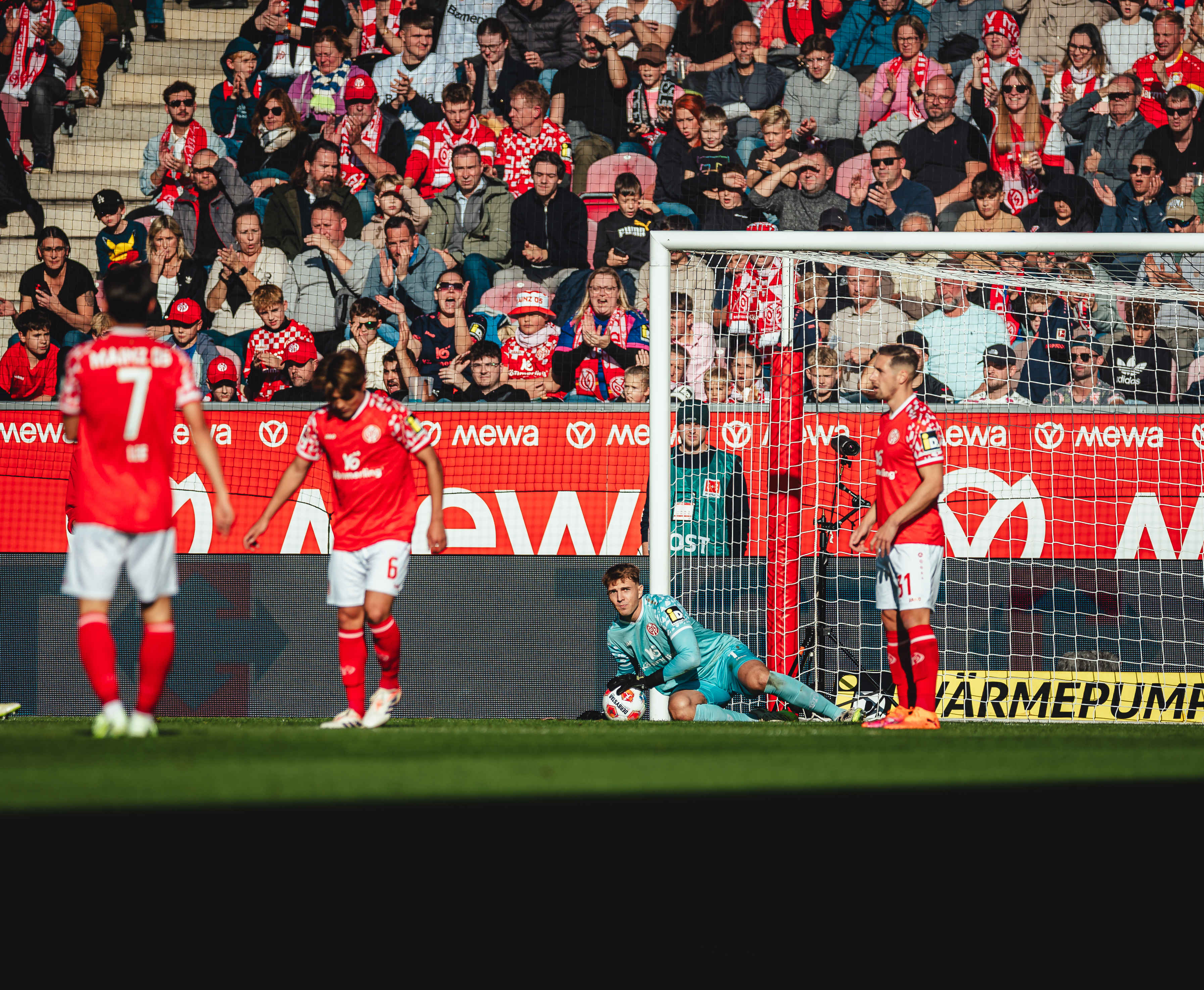 Der Auftakt in diese Partie war mal wieder einer zum Vergessen gewesen aus rot-weißer Sicht. Erst in Minute 26 sollten die Gastgeber zu ihrer ersten echten Chance kommen, als Benedict Hollerbach eine Nebel-Flanke per Kopf am rechten Pfosten vorbei verlängerte. Ein erster Wachruf, dem nach einer guten halben Stunde - das Henriksen-Team agierte nun viel griffiger und aktiver - der Anschlusstreffer folgen sollte. Die Leverkusener konnten einen Einwurf Phillipp Mwenes nicht klären, das Leder landete vor den Füßen von Lee, der Mark Flekken aus sechs Metern keine Chance ließ (34.). Die Arena war nun wieder voll da und der FSV schien dem Ausgleich in der Schlussphase des ersten Durchgangs näher, ohne nochmal richtig gefährlich zu werden. Lediglich ein Freistoß Amiris aus gut 20 Metern verpasste das Gehäuse in Minute 41 knapp. Als sich inmitten der fünfminütigen Nachspielzeit bereits alles auf ein knappes 2:1 für Bayer zur Pause eingestellt hatte, luden die 05ER ihre Gäste dann doch nochmal ein. Anstatt den Ball am eigenen Sechzehner konsequent zu klären, suchten zwei Passversuche von Kaishu Sano und Lee vergebens einen Abnehmer, Hofmann bedankte sich und passte auf den völlig freistehenden Grimaldo, der Rieß zum zweiten Mal überwand. Dass Nebel wenig später mit einem Schlenzer nochmal den Querbalken anvisierte, sollte nur statistischen Wert haben nach einem naiven Mainzer Auftritt vor dem Pausentee.