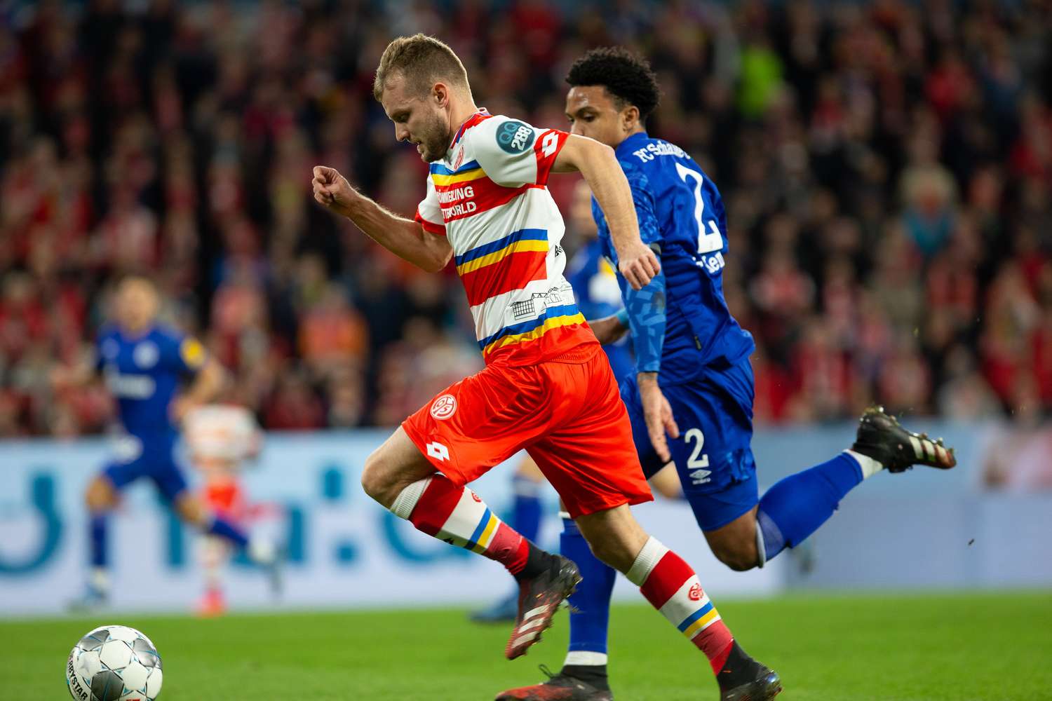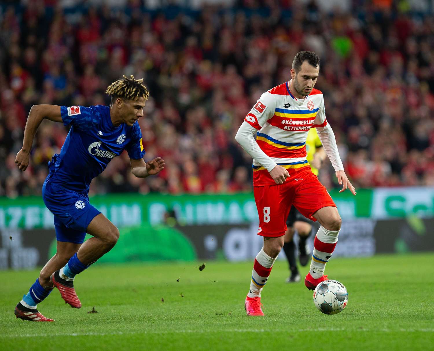 Bei heftigen Windböen in der OPEL ARENA brauchten beide Teams ein paar Minuten zur Akklimatisierung, bis Levin Öztunali in der achten Spielminute aus rund 20 Metern Torentfernung den ersten Warnschuss der Partie abgab – Schalke Schlussmann Alexander Nübel parierte. Während die Gäste in dieser Anfangsphase abwartend auftraten, war es drei Minuten später erneut Öztunali, der für Torgefahr sorgte. Beim Volley-Versuch des Mittelfeldspielers musste sich Nübel schon deutlich länger machen als noch kurz zuvor (11.). Die in den vierfarbbunten Fastnachtstrikots der 2020er Kampagne aufgelaufenen 05ER waren nun das bessere Team und zeigten nach 15 Minuten den ersten schön vorgetragenen Spielzug über mehrere Stationen. Ein Zuspiel von Jeffrey Bruma leitete der Dreifachtorschütze von Berlin Robin Quaison direkt weiter auf Brosinski. Der als offensiver Außenverteidiger aufgebotene Vizekapitän startete über den linken Flügel durch und bediente Ádám Szalai, der im Fünfmeterraum aber noch entscheidend von Jean-Clair Todibo gestört wurde (15.). Vor dem Tor von Robin Zentner hingegen tat sich bis zu diesem Zeitpunkt und auch in den Folgeminuten – nichts. Der FSV übernahm vielmehr zunehmend die Kontrolle. In der 25. Minute bediente Kapitän Danny Latza Leandro Barreiro, der es artistisch versuchte, das Leder jedoch knapp neben das Gehäuse setzte. Und auch die nächste gefährliche Situation sahen knapp 30.000 Zuschauer vor dem Gehäuse der Königsblauen. Ridle Baku machte eine Brosinski-Flanke von links wieder scharf, doch auch Szalai scheiterte mit seinem Schuss aus zwölf Metern am Gäste-Keeper (28.).
