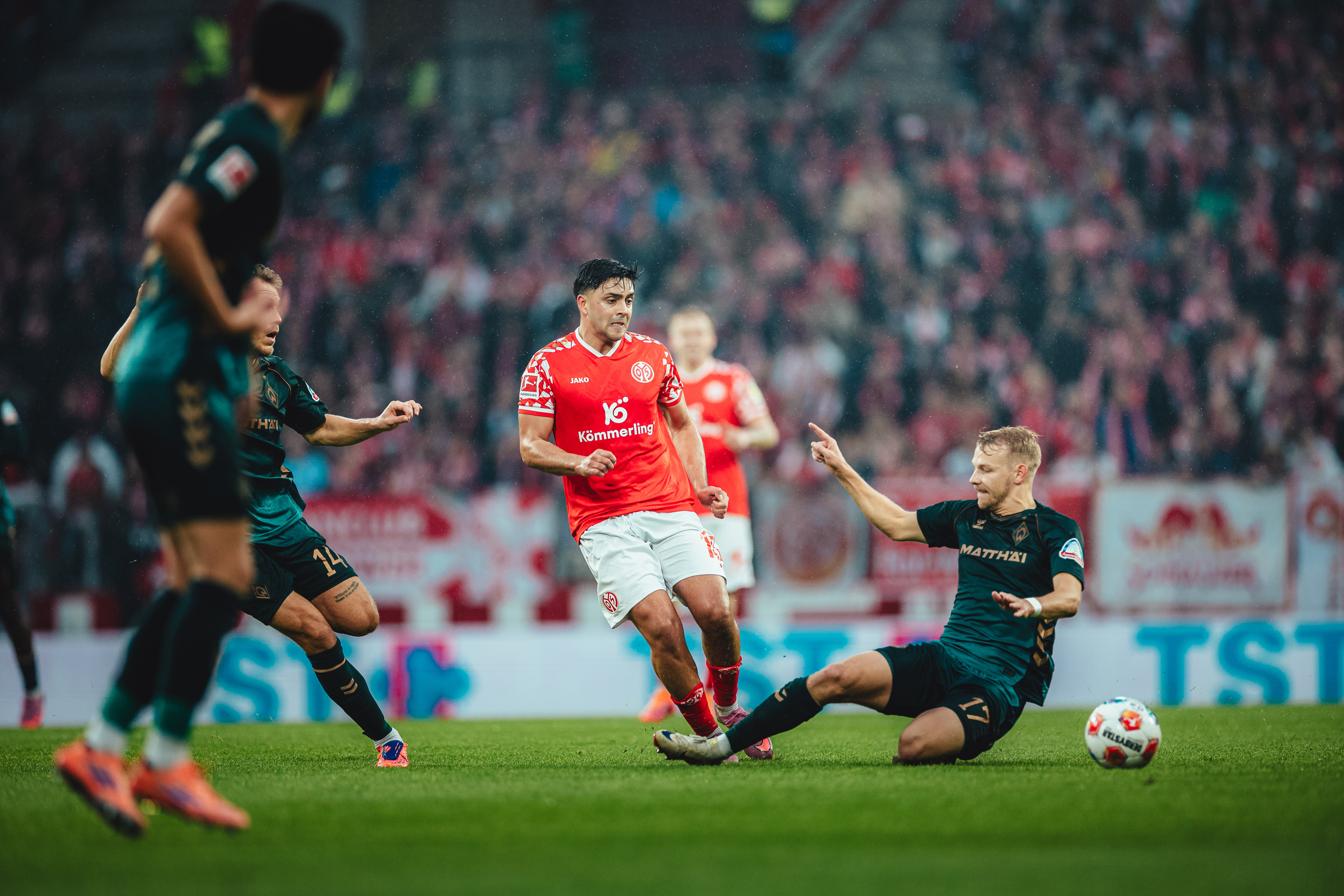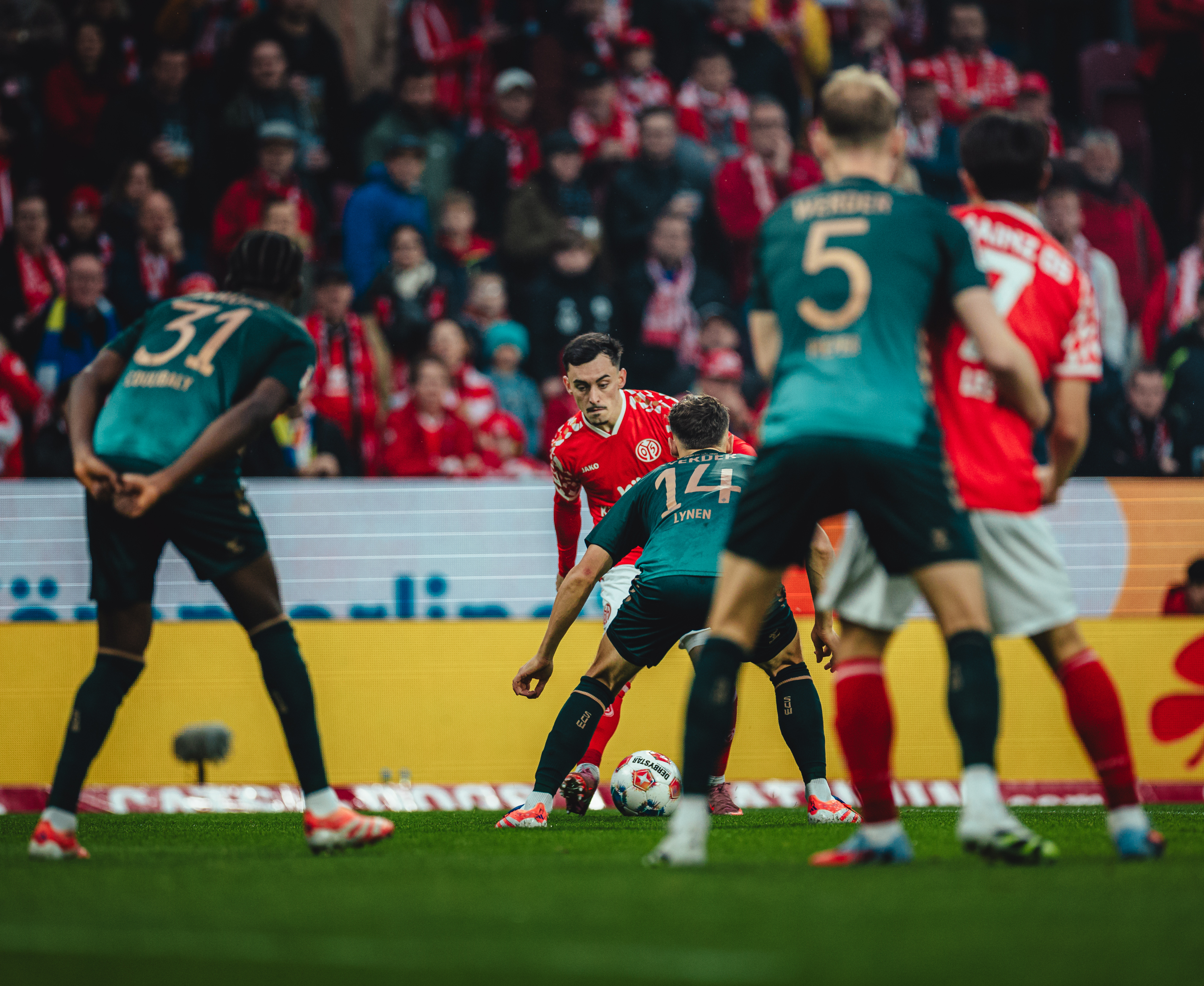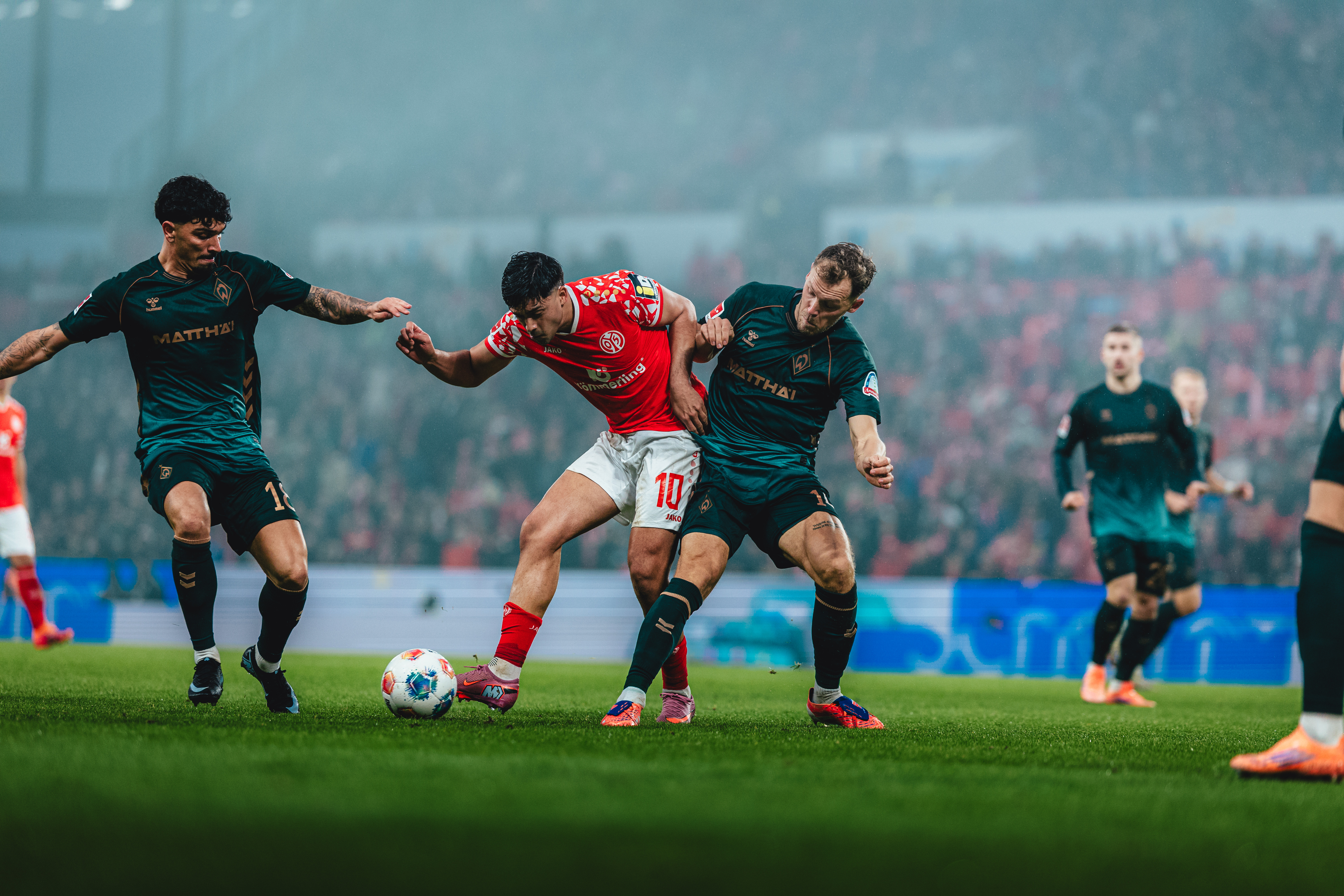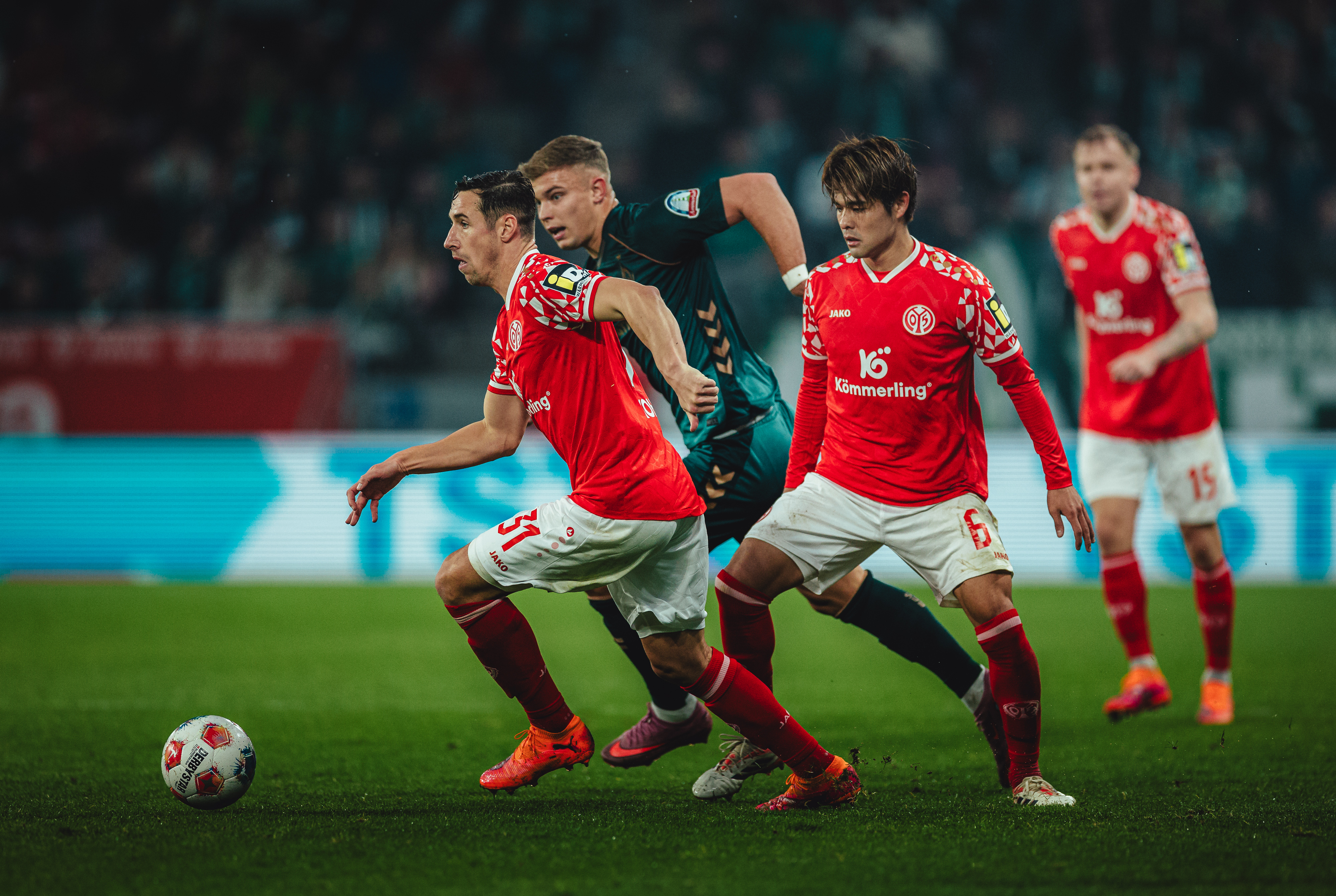 Der FSV begann in der ausverkauften, stimmungsvollen MEWA ARENA druckvoll und im Stile eines Heimteams. Die ersten Torannäherungen waren folgerichtig: Zunächst wurde ein aussichtsreicher Versuch Nadiem Amiris aus 20 Metern geblockt (5. Spielminute), und keine 60 Sekunden später fand eine Flanke von Phillipp Mwene Jae-sung Lee, dessen Kopfball aber zur sicheren Beute von Mio Backhaus im Werder-Tor wurde (6.). Wenngleich die Gäste in der Anfangsphase kaum einmal offensiv in Erscheinung traten, waren sie es, die nach 15 Minuten aus dem Nichts zur bis dato besten Gelegenheit der Partie kommen sollten: Romano Schmid schickte Marco Grüll nach einem Mainzer Ballverlust auf die Reise, der Österreicher ließ Dominik Kohr per Haken aussteigen, doch Robin Zentner wehrte den Schuss des völlig frei vor ihm auftauchenden Angreifers ab (15.). Nachdem sich beide Teams in der Folge neutralisierten und sich vor den Toren wenig tat, war es der FSV, der nach knapp 25 Minuten schnell umschaltete. Über Nebel und Hollerbach landete das Leder bei Amiri, der Mwene in Szene setzte, dessen Schlenzer aber nur den Querbalken touchierte.
