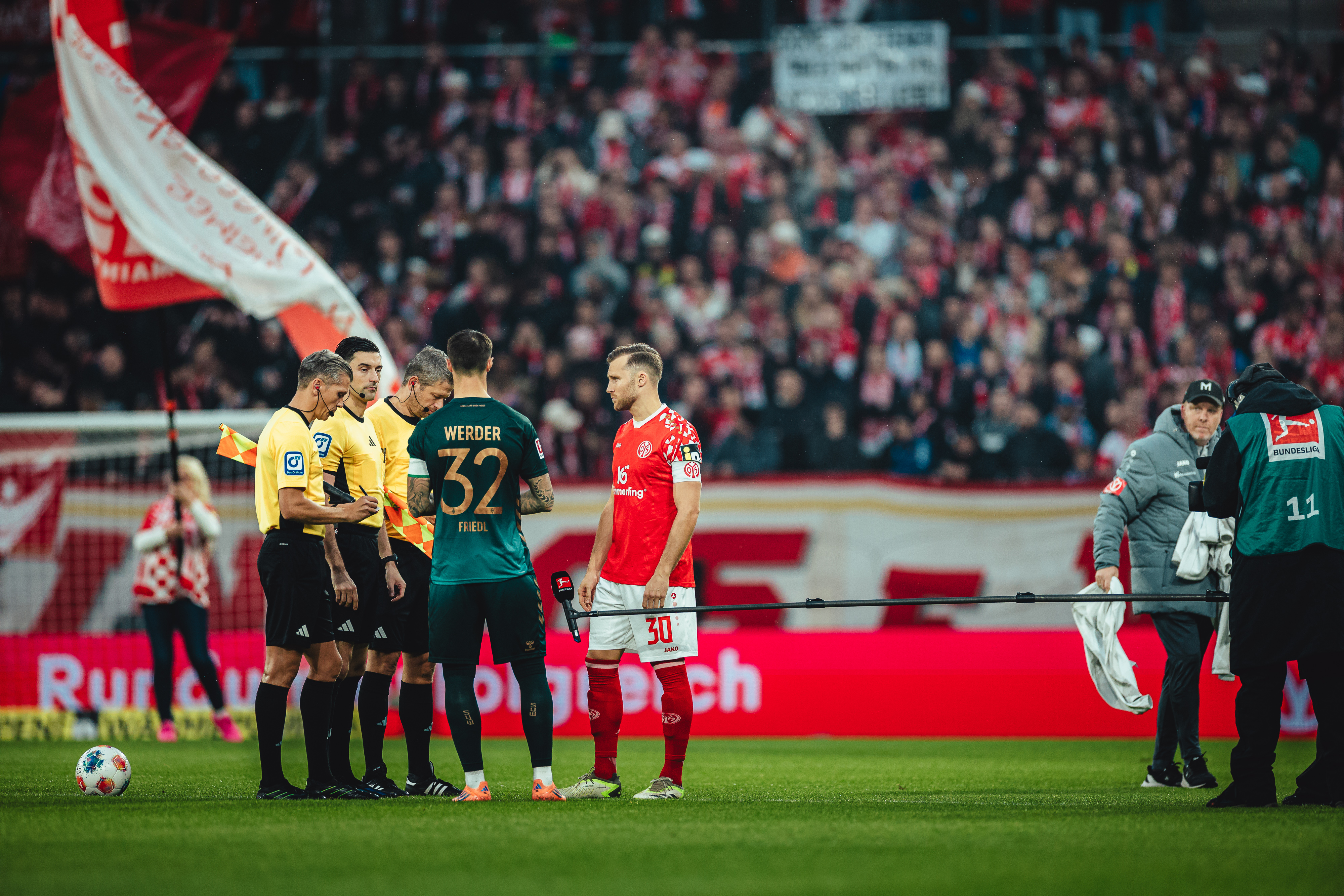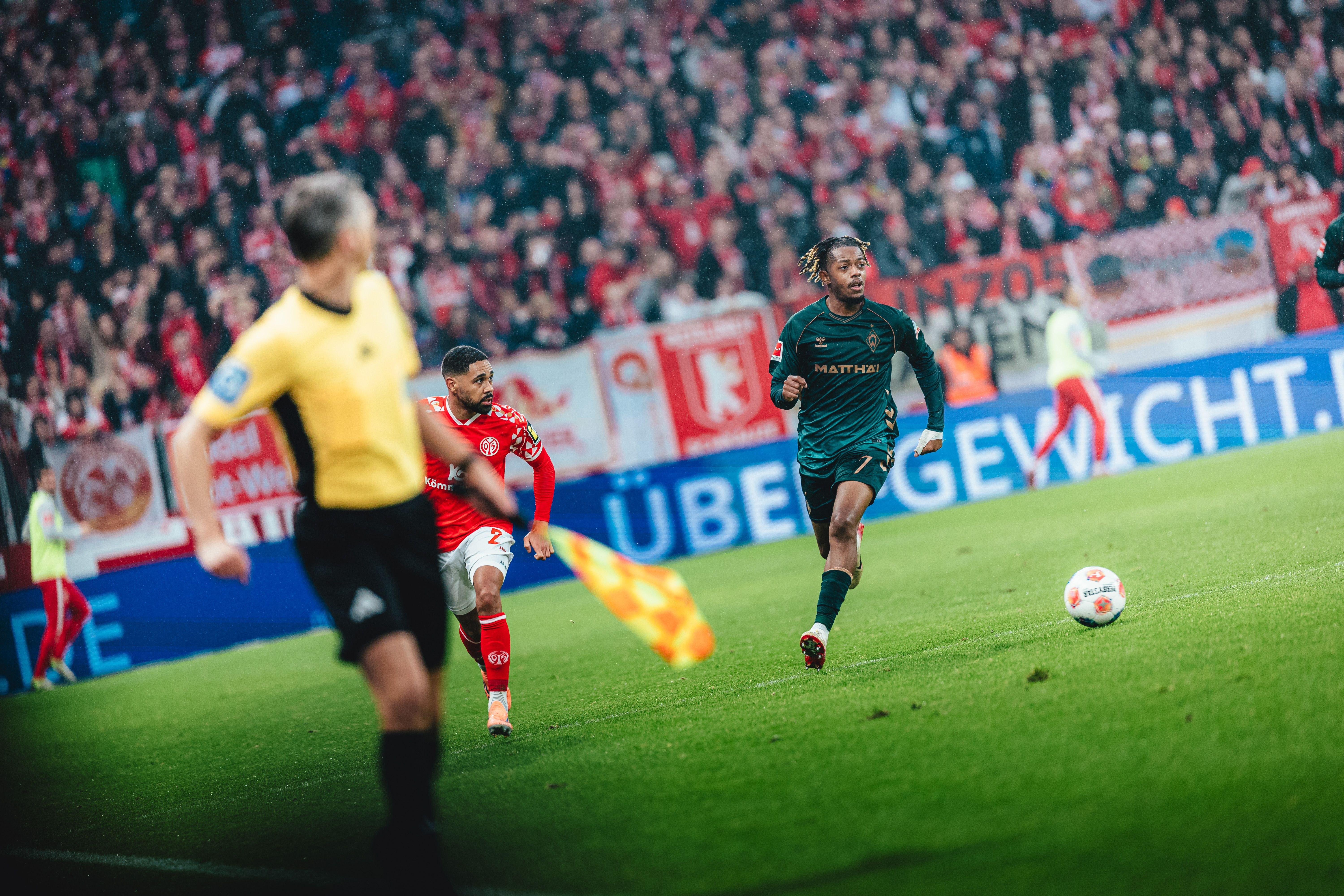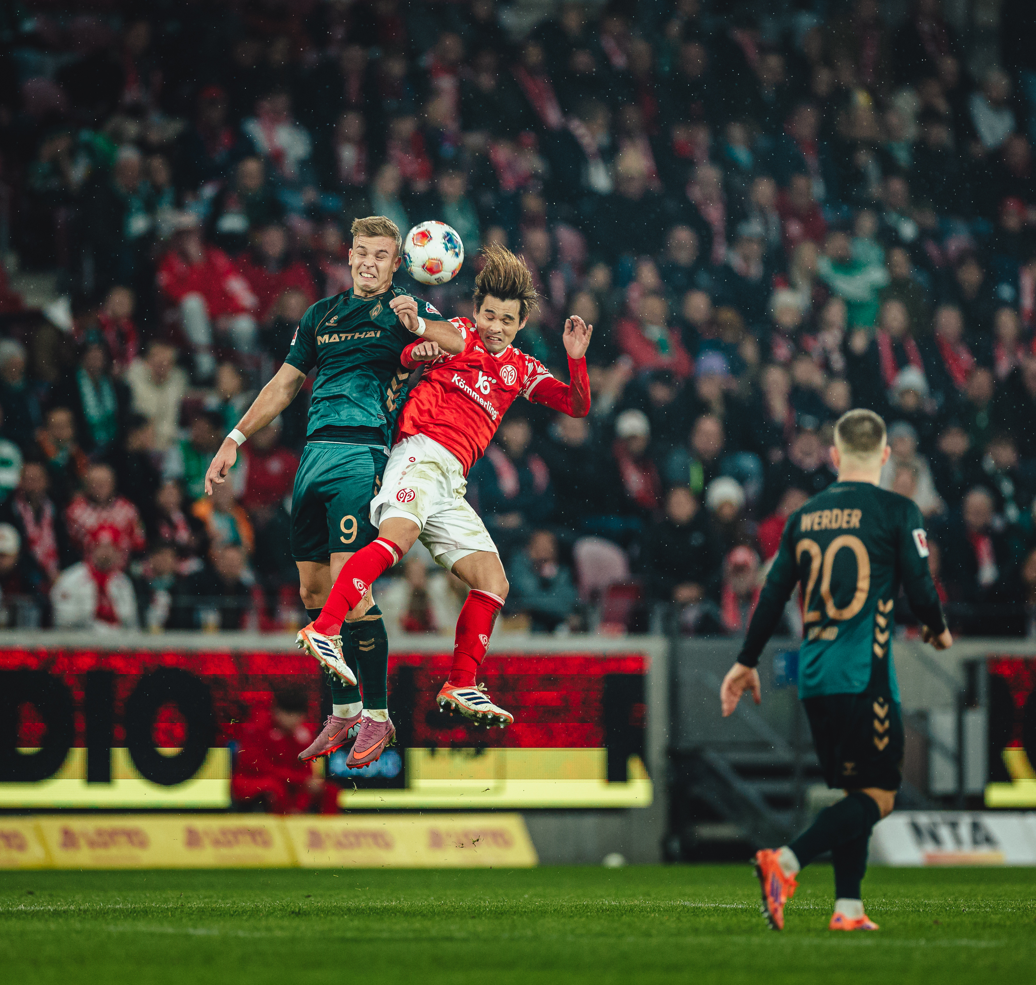Der FSV begann in der ausverkauften, stimmungsvollen MEWA ARENA druckvoll und im Stile eines Heimteams. Die ersten Torannäherungen waren folgerichtig: Zunächst wurde ein aussichtsreicher Versuch Nadiem Amiris aus 20 Metern geblockt (5. Spielminute), und keine 60 Sekunden später fand eine Flanke von Phillipp Mwene Jae-sung Lee, dessen Kopfball aber zur sicheren Beute von Mio Backhaus im Werder-Tor wurde (6.). Wenngleich die Gäste in der Anfangsphase kaum einmal offensiv in Erscheinung traten, waren sie es, die nach 15 Minuten aus dem Nichts zur bis dato besten Gelegenheit der Partie kommen sollten: Romano Schmid schickte Marco Grüll nach einem Mainzer Ballverlust auf die Reise, der Österreicher ließ Dominik Kohr per Haken aussteigen, doch Robin Zentner wehrte den Schuss des völlig frei vor ihm auftauchenden Angreifers ab (15.). Nachdem sich beide Teams in der Folge neutralisierten und sich vor den Toren wenig tat, war es der FSV, der nach knapp 25 Minuten schnell umschaltete. Über Nebel und Hollerbach landete das Leder bei Amiri, der Mwene in Szene setzte, dessen Schlenzer aber nur den Querbalken touchierte.