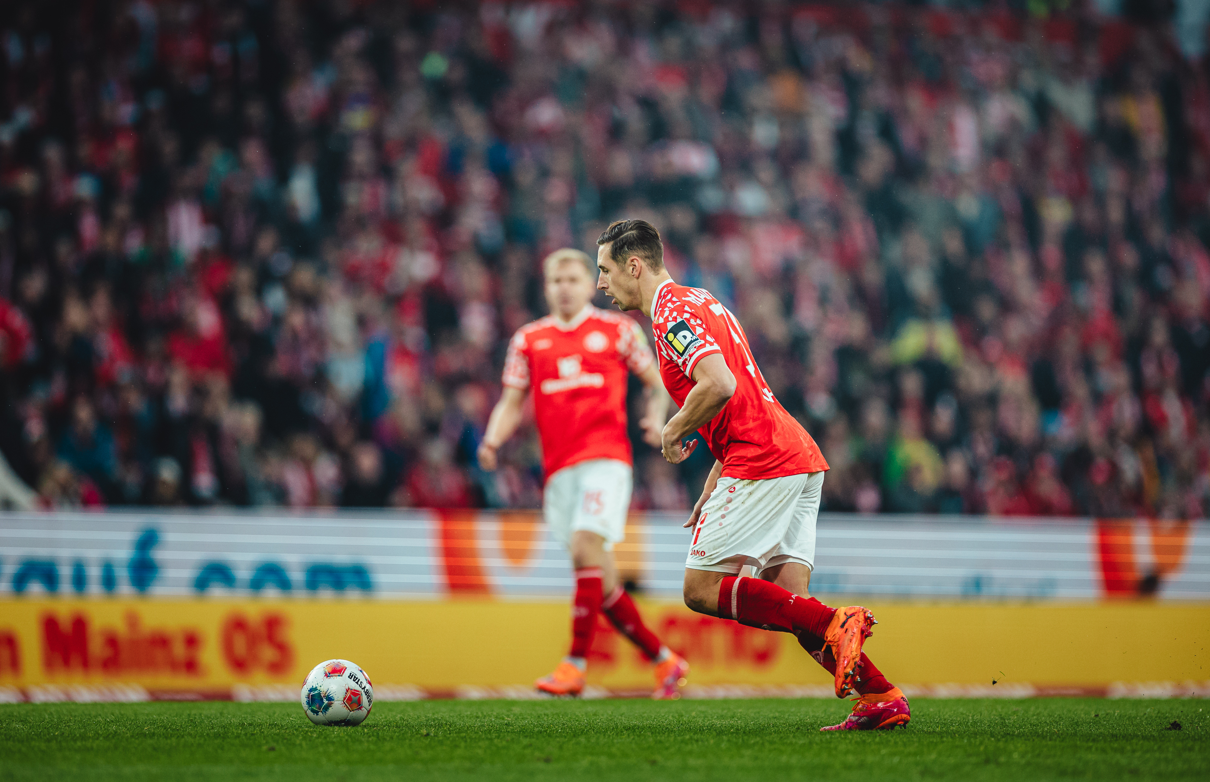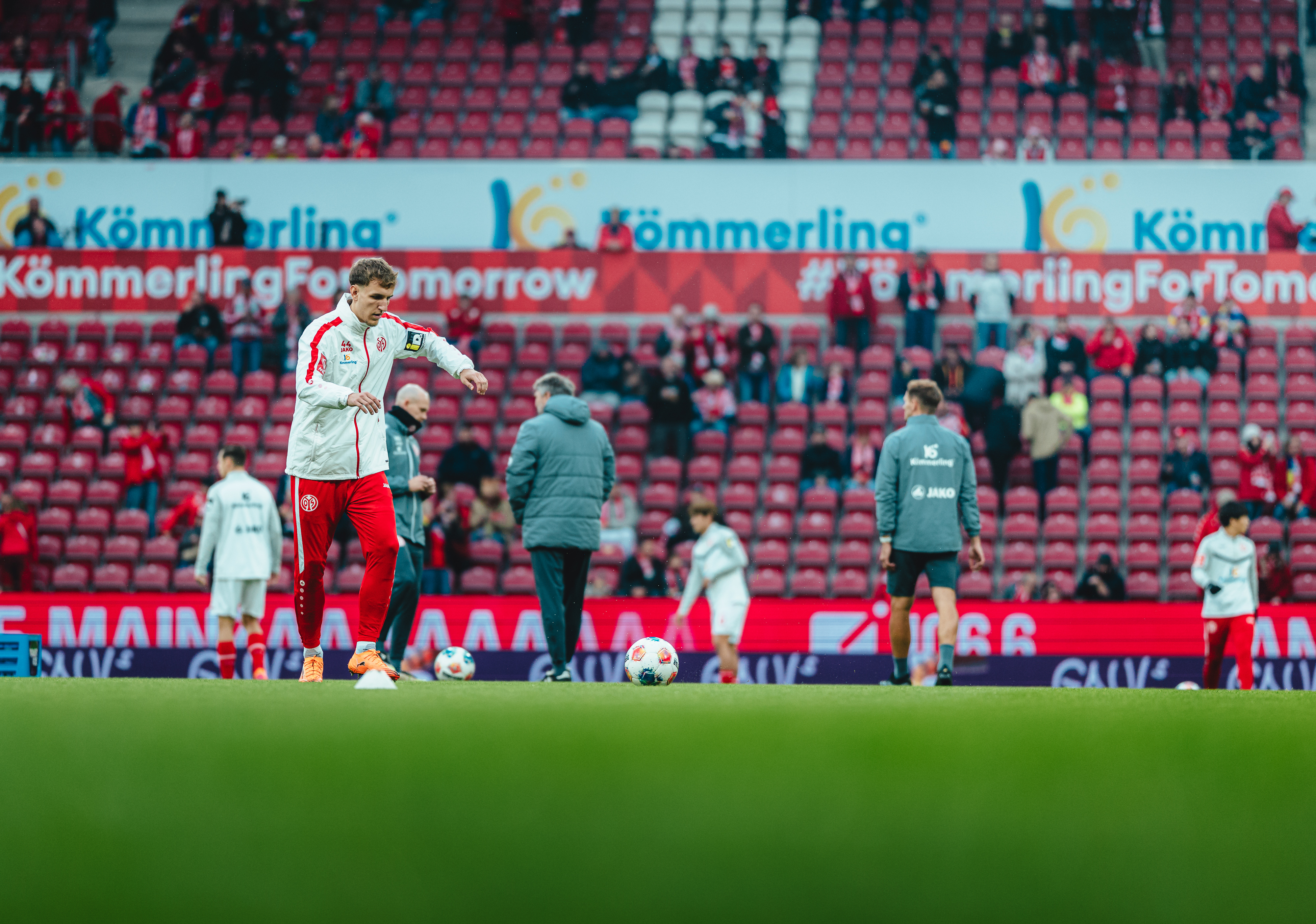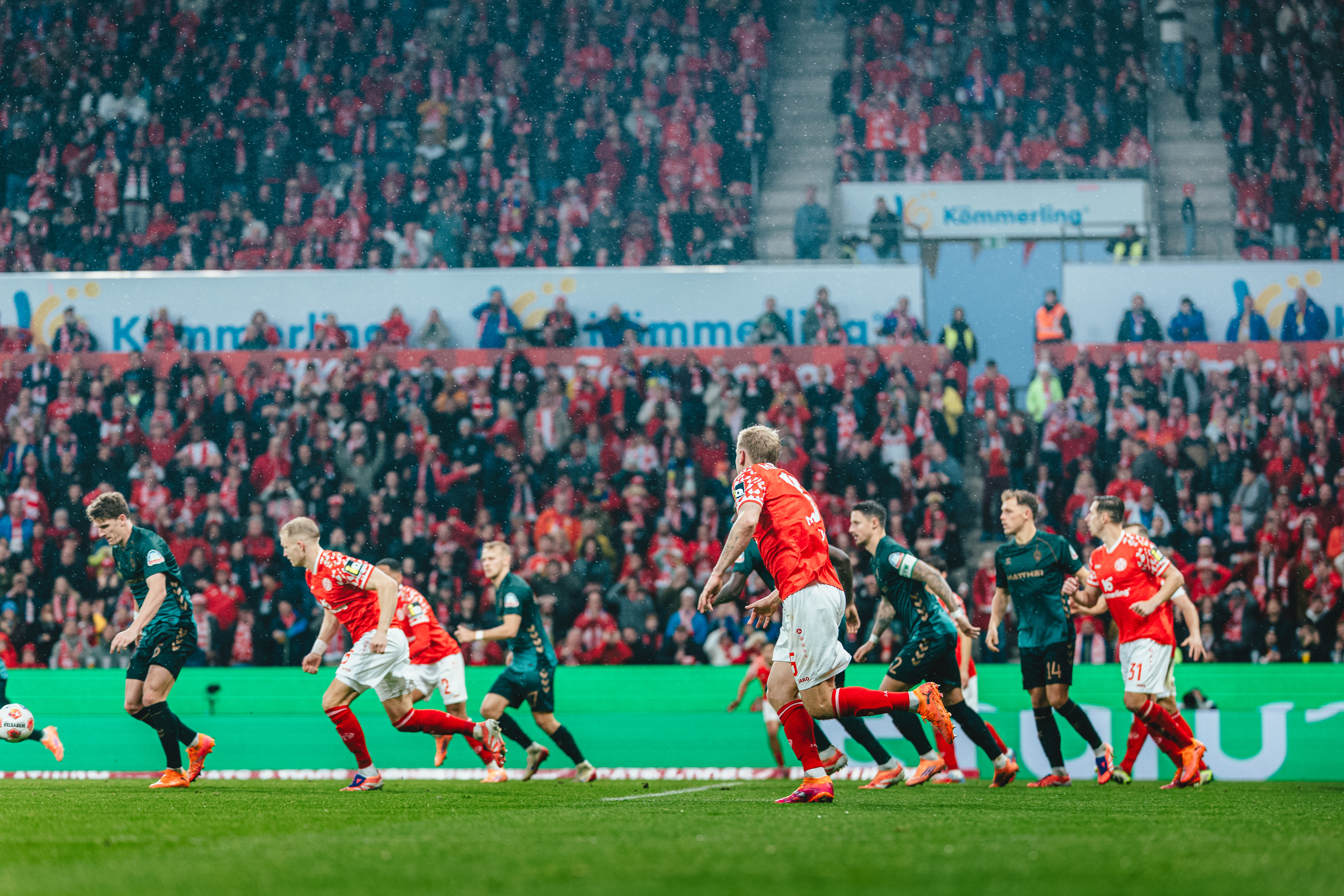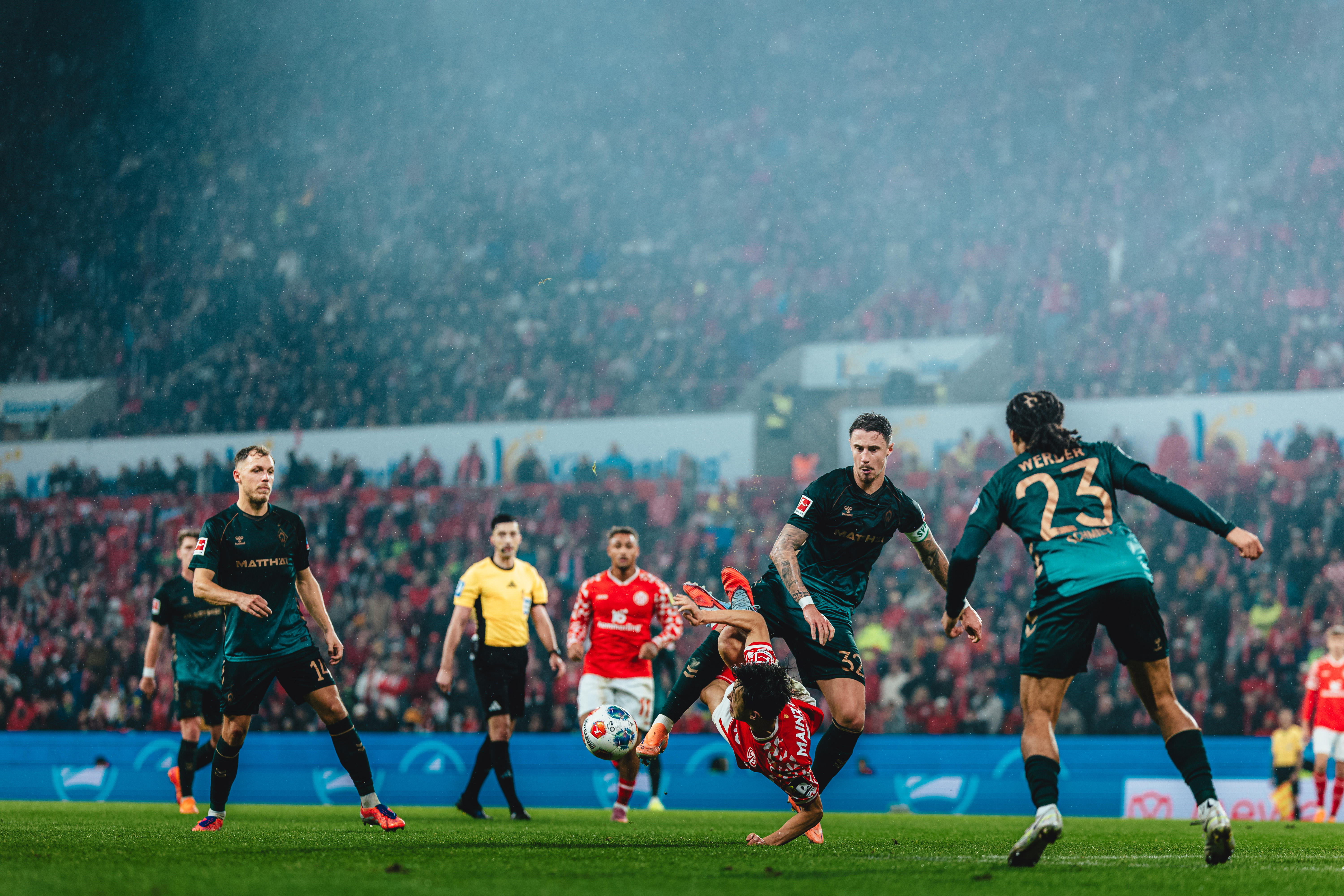 Der FSV begann in der ausverkauften, stimmungsvollen MEWA ARENA druckvoll und im Stile eines Heimteams. Die ersten Torannäherungen waren folgerichtig: Zunächst wurde ein aussichtsreicher Versuch Nadiem Amiris aus 20 Metern geblockt (5. Spielminute), und keine 60 Sekunden später fand eine Flanke von Phillipp Mwene Jae-sung Lee, dessen Kopfball aber zur sicheren Beute von Mio Backhaus im Werder-Tor wurde (6.). Wenngleich die Gäste in der Anfangsphase kaum einmal offensiv in Erscheinung traten, waren sie es, die nach 15 Minuten aus dem Nichts zur bis dato besten Gelegenheit der Partie kommen sollten: Romano Schmid schickte Marco Grüll nach einem Mainzer Ballverlust auf die Reise, der Österreicher ließ Dominik Kohr per Haken aussteigen, doch Robin Zentner wehrte den Schuss des völlig frei vor ihm auftauchenden Angreifers ab (15.). Nachdem sich beide Teams in der Folge neutralisierten und sich vor den Toren wenig tat, war es der FSV, der nach knapp 25 Minuten schnell umschaltete. Über Nebel und Hollerbach landete das Leder bei Amiri, der Mwene in Szene setzte, dessen Schlenzer aber nur den Querbalken touchierte.