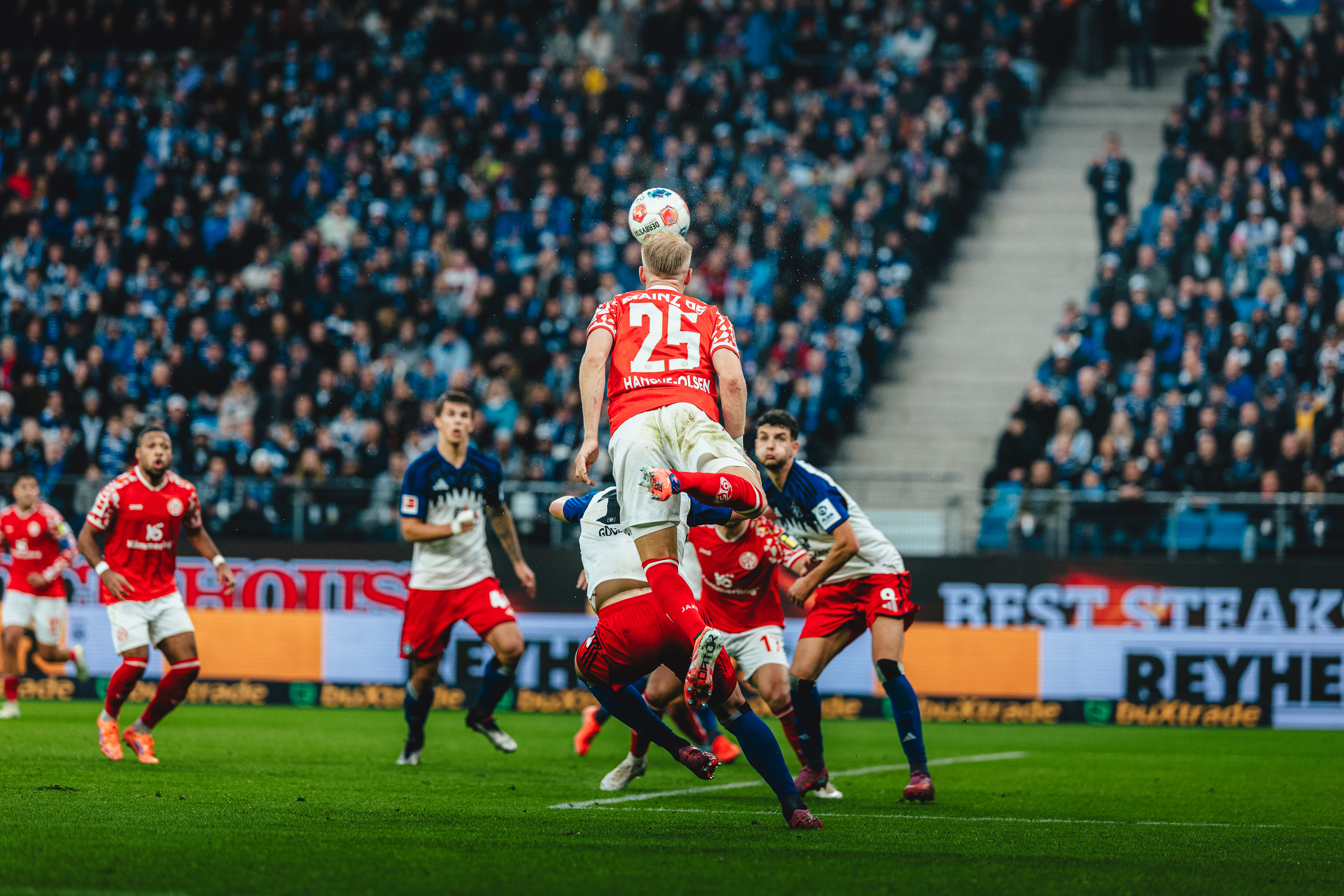 Der Start in die Begegnung sollte den Gäste gründlich misslingen. Es dauerte keine sechs Minuten, da durfte der Aufsteiger erstmals jubeln, weil er im Mittelfeld ganz viel Raum hatte. Daniel Elfadli startete in dieser Szene in der eigenen Hälfte, schüttelte Nebel ab und bediente Philippe, der direkt weiterleitete auf Gocholeishvili, dessen Gewaltschuss Rieß zwar reaktionsstark an den Pfosten lenken konnten, gegen den Rebound von Albert Sambi Lokonga dann aber machtlos war - 0:1 (6. Minute). Eine kalte Dusche, von der sich die zwar mitspielenden, aber auch ein Stück weit naiv wirkenden, Mainzer nicht so schnell erholten. Immer wieder überbrückten die Gastgeber das Mittelfeld in hohem Tempo und kamen so auch zum schnellen 2:0. Ransford-Yeboah Königsdörffer hatte auf rechts zu viel Raum, flankte, eigentlich zu ungenau ins Zentrum, wo Philippe dennoch glücklich an den Ball kam, Kohr tunnelte und aus acht Metern erhöhte (10.). Die 05ER waren mit einfachsten Mitteln überrumpelt worden und nun in der Pflicht. Die nächsten Chancen hatte dennoch die Norddeutschen, deren Plan bis hierhin bestens aufging. In Minute 15 und 16 hatte Zentner-Vertreter Rieß erneut die Gelegenheit, sich auszuzeichnen, als er binnen 60 Sekunden gegen Philipp und Königsdörffer zur Stelle war.