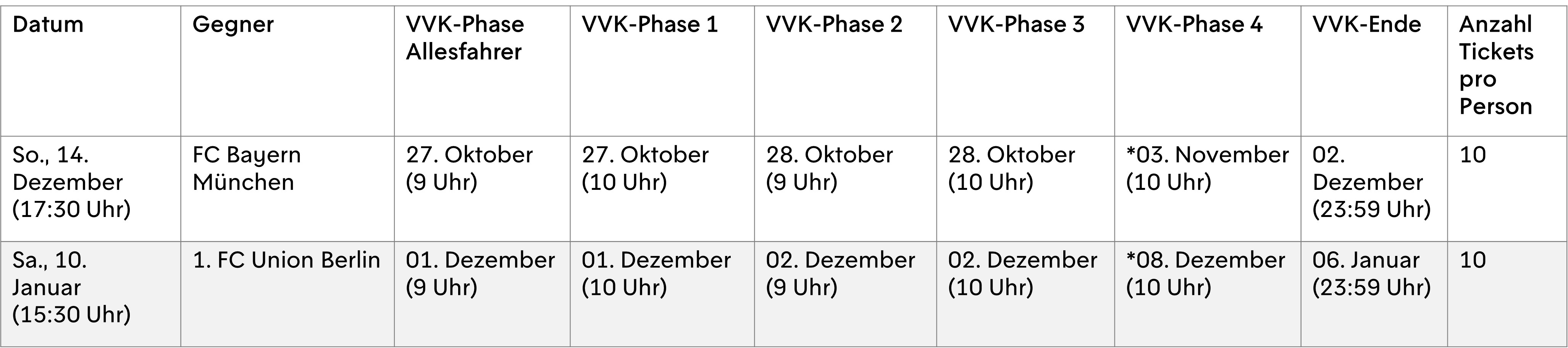Der Vorverkauf für Auswärtsspiele endet i.d.R. zu Beginn der jeweiligen Spielwoche, also Anfang der Woche, in der das Spiel stattfindet. Auch dies ist abhängig vom Heimverein. Über unsere Vereinskanäle informieren wir euch rechtzeitig über das VVK-Ende.