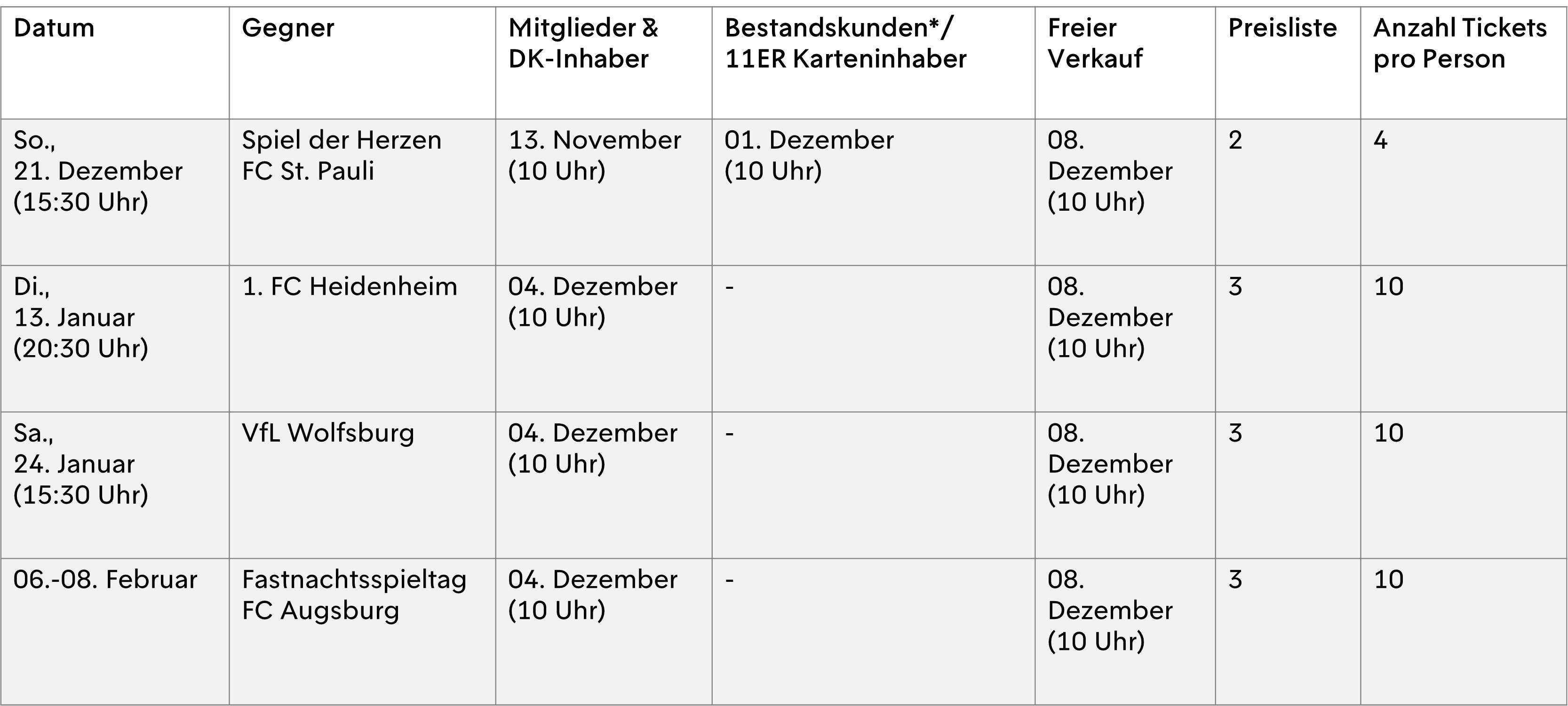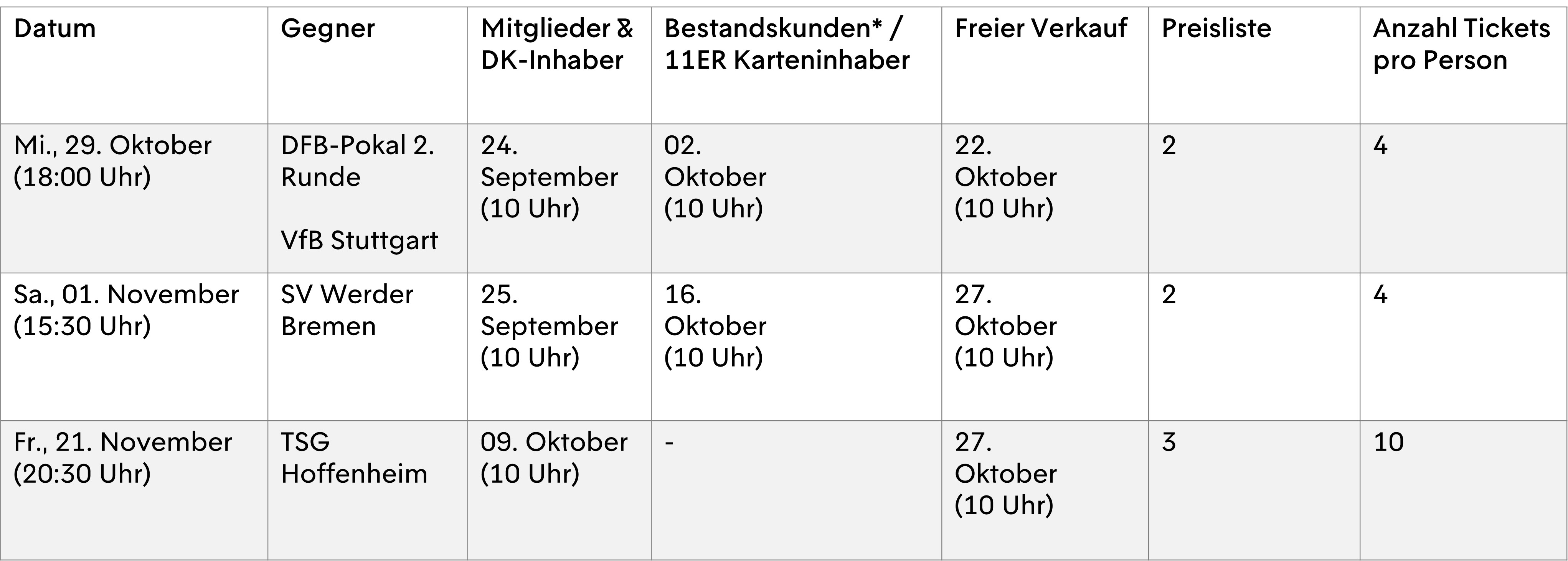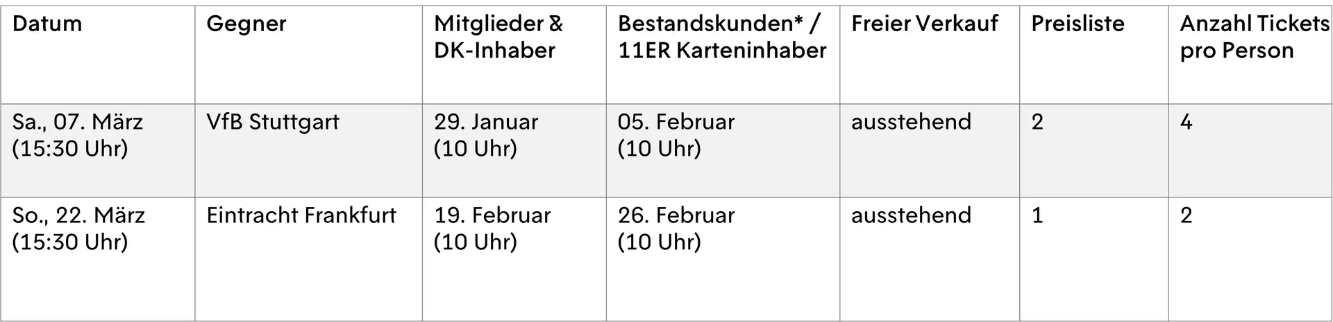 Ab einer Personenanzahl von 11 Personen können zu allen Heimspielen, ausgenommen Bayern München, Borussia Dortmund und Eintracht Frankfurt, Gruppenanfragen eingereicht werden.