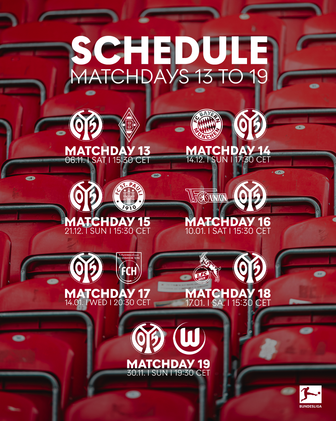 The German Football League (DFL) announced the exact times for the fixtures taking place across matchdays 13 to 19 on Wednesday afternoon. There will be a midweek game to look forward to in one of the upcoming busy weeks for Mainz, as they welcome FC Heidenheim to the MEWA ARENA for a Tuesday, 20:30 CET clash. More late games for the 05ers are to come, as they play Borussia Mönchengladbach on a Friday evening, also at 20:30 CET, before a 17:30 CET trip south to face FC Bayern München on a Sunday. The final Bundesliga game of the year is scheduled for the Sunday, 15:30 slot, against St. Pauli.