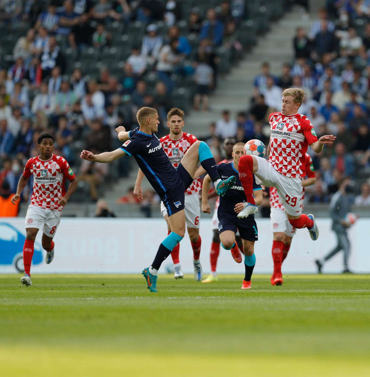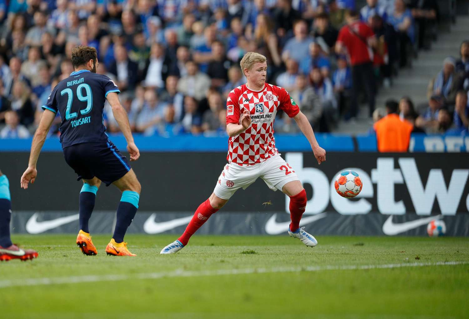 Die Profis des 1. FSV Mainz haben am Samstagabend ihr letztes Auswärtsspiel der Saison bei Hertha BSC mit 2:1 (1:1) gewonnen. Vor 70.000 Fans im Berliner Olympiastadion profitierten die Rheinhessen beim 1:0 durch Silvan Widmer von einem Torwartpatzer der Berliner. In der Nachspielzeit der ersten Halbzeit gelang dem Hauptstadtklub der Ausgleich durch Davie Selke, nachdem Schiedsrichter Patrick Ittrich nach einem Getümmel im Mainzer Strafraum auf Elfmeter entschieden hatte. Im zweiten Spielabschnitt übernahmen die Mainzer dann endgültig die Spielkontrolle – Stefan Bell belohnte sein Team schließlich zehn Minuten vor Spielende.