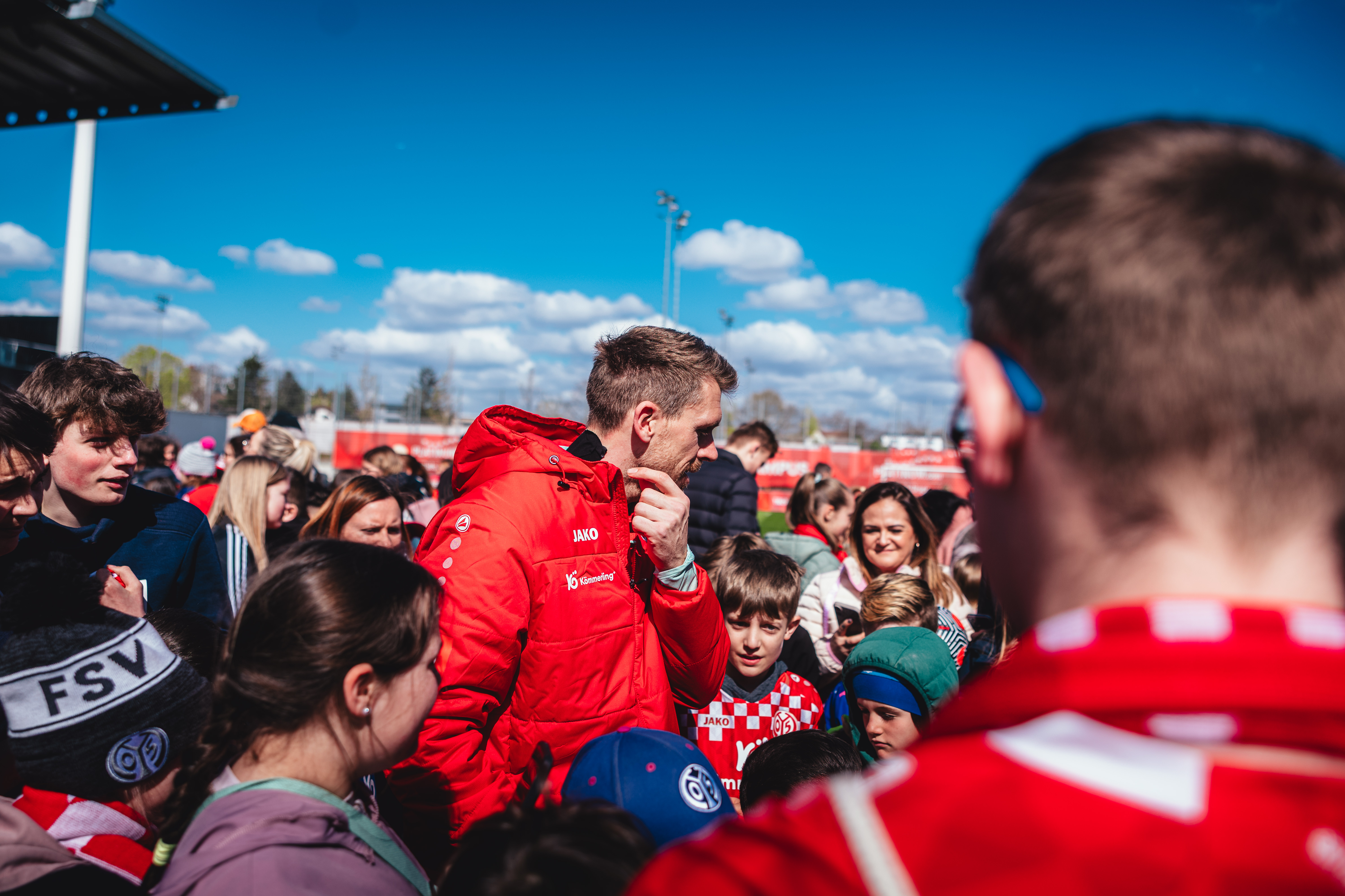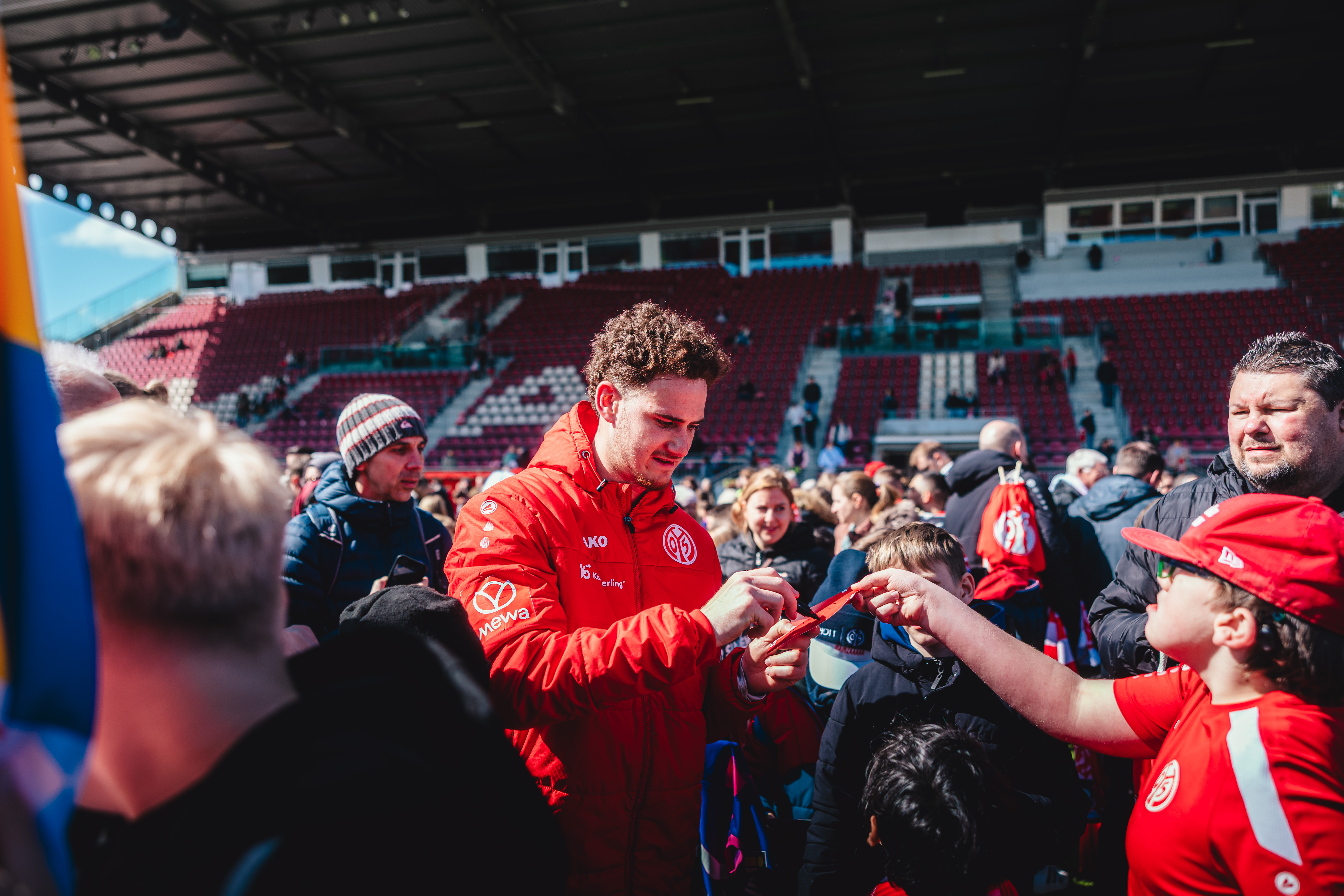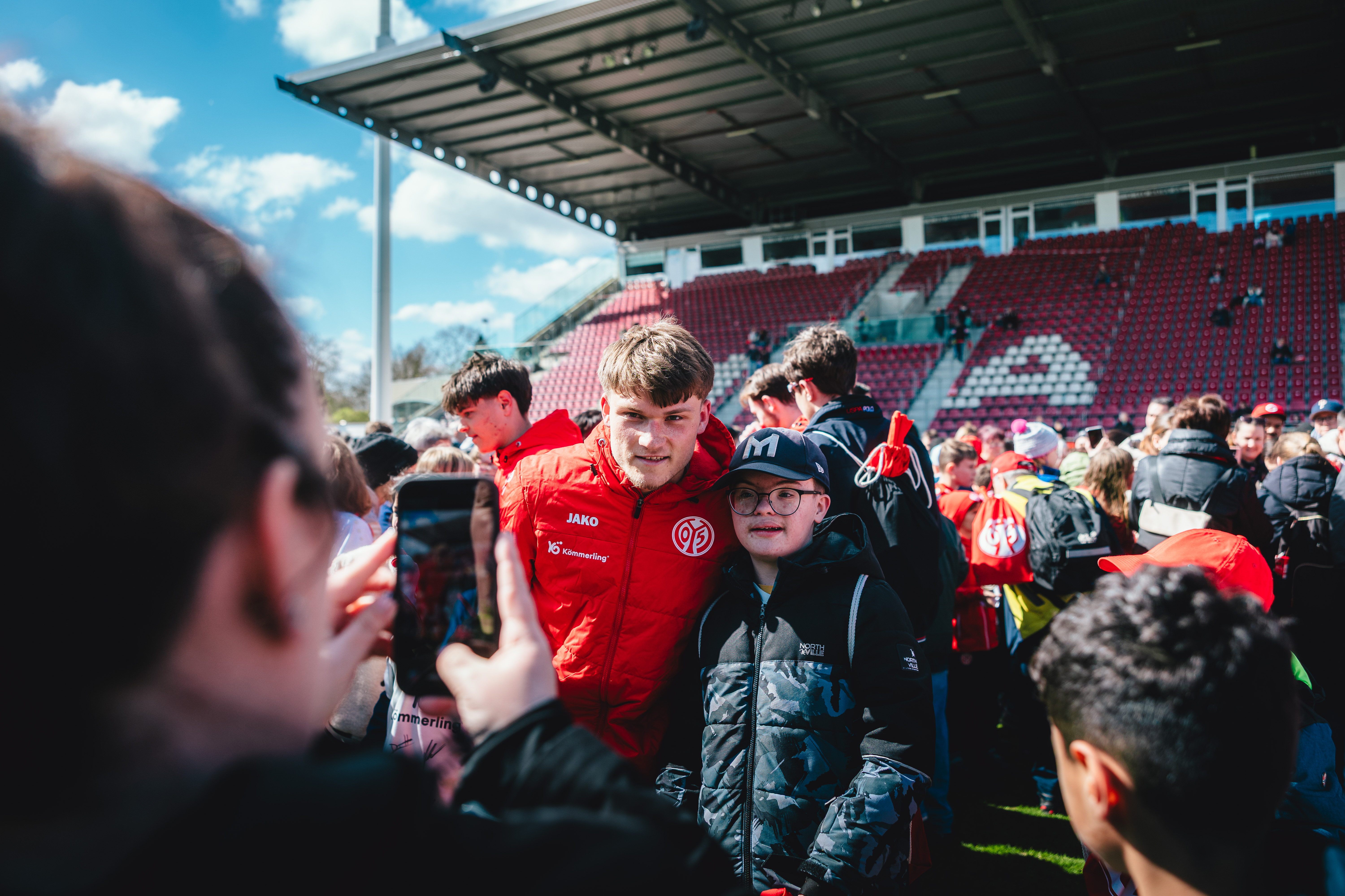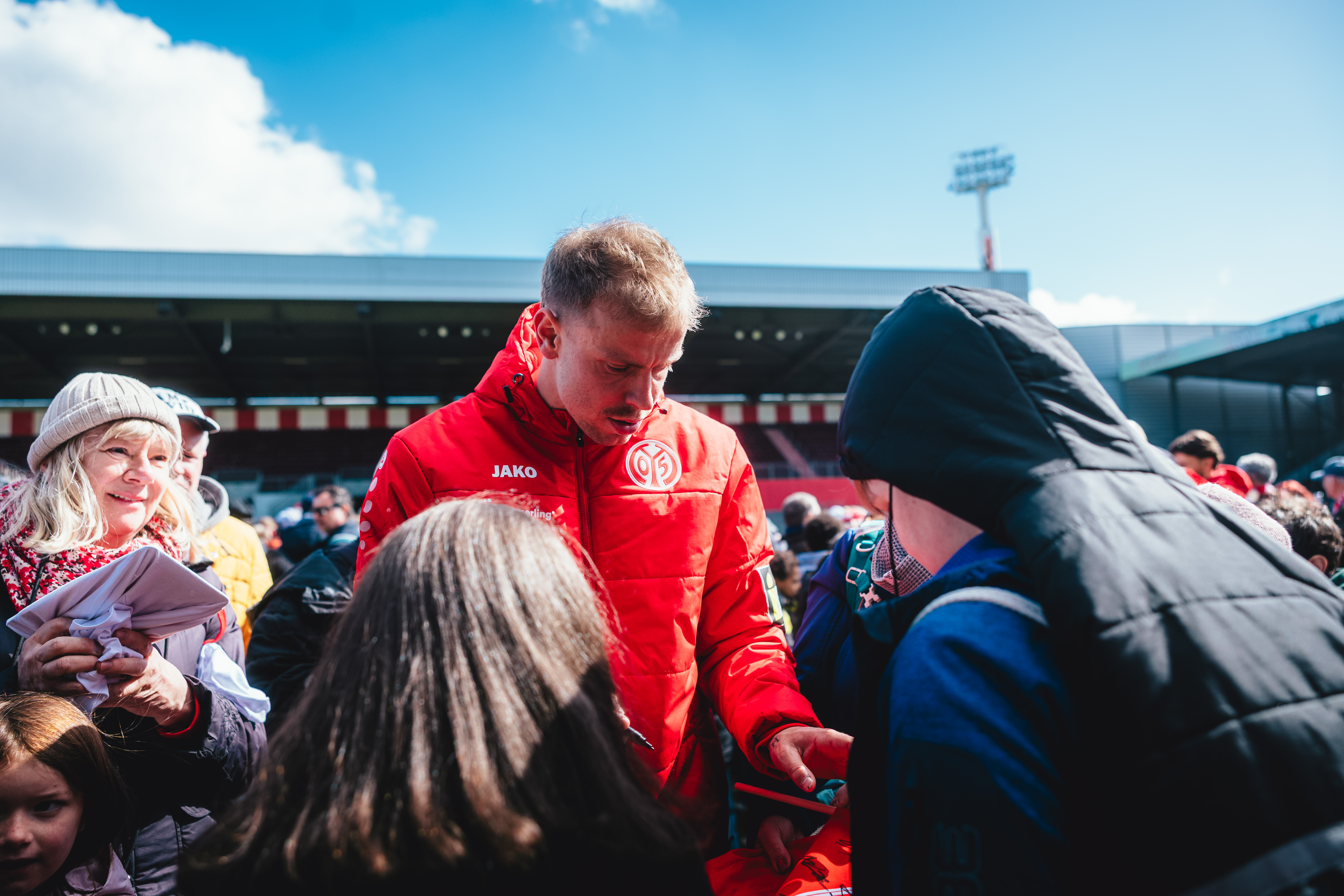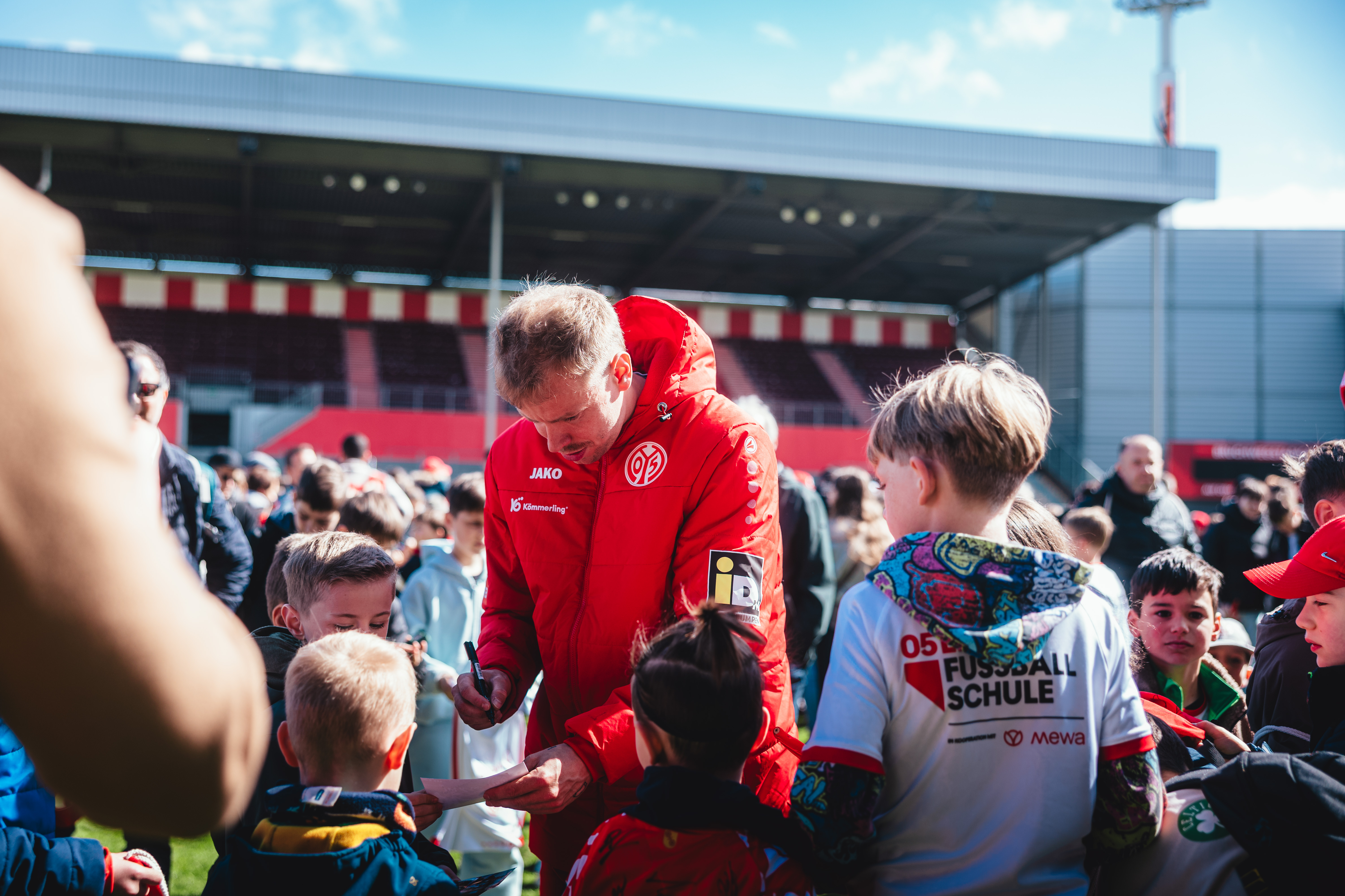 Den krönenden Abschluss bildete wie üblich der direkte Kontakt zu den Mainzer Spielern: Nach der Einheit durften alle Kinder das Spielfeld stürmen, um sich von ihren Vorbildern Autogramme und Selfies zu sichern, wofür sich die Profis der Rheinhessen viel Zeit nahmen und bemüht waren, alle Wünsche zu erfüllen. Auch in diesem Jahr sorgte der Kidstag am Bruchweg für zahlreiche strahlende Kinderaugen und eine unvergessliche Zeit in der Heimat des FSV.