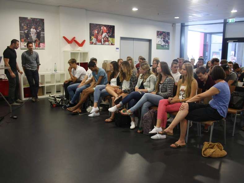 „Soziale Netzwerke aufbauen, offen und engagiert sein und dadurch Bekanntschaften im eigenen Umfeld machen“, das rät Michael Swoboda, Mitarbeiter in der Abteilung Marketing und Vertrieb von Mainz 05, 40 Schülerinnen und Schülern des Gymnasiums Nieder-Olm. Zuvor hat auch Volker Bommas, Lehrer am Gymnasium Nieder-Olm, „genetzwerkt“. Über das 05er Klassenzimmer hat er seinen ehemaligen Schüler Michael Swoboda angefragt, um für seine Sport-Leistungsklässler Einblicke in das Berufsfeld Sport, insbesondere in einen professionellen Sportverein sowie seinen persönlichen Werdegang zu erhalten.