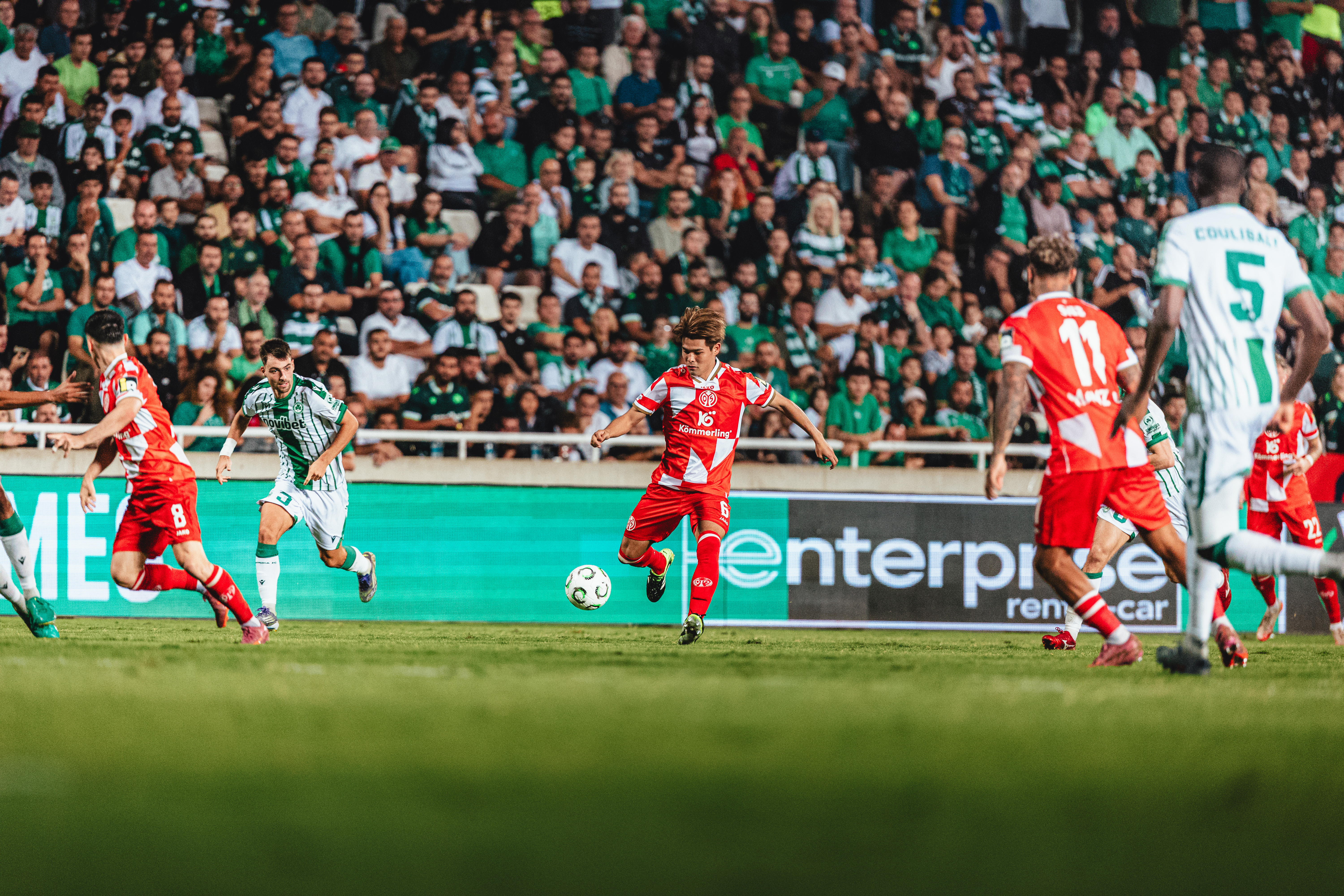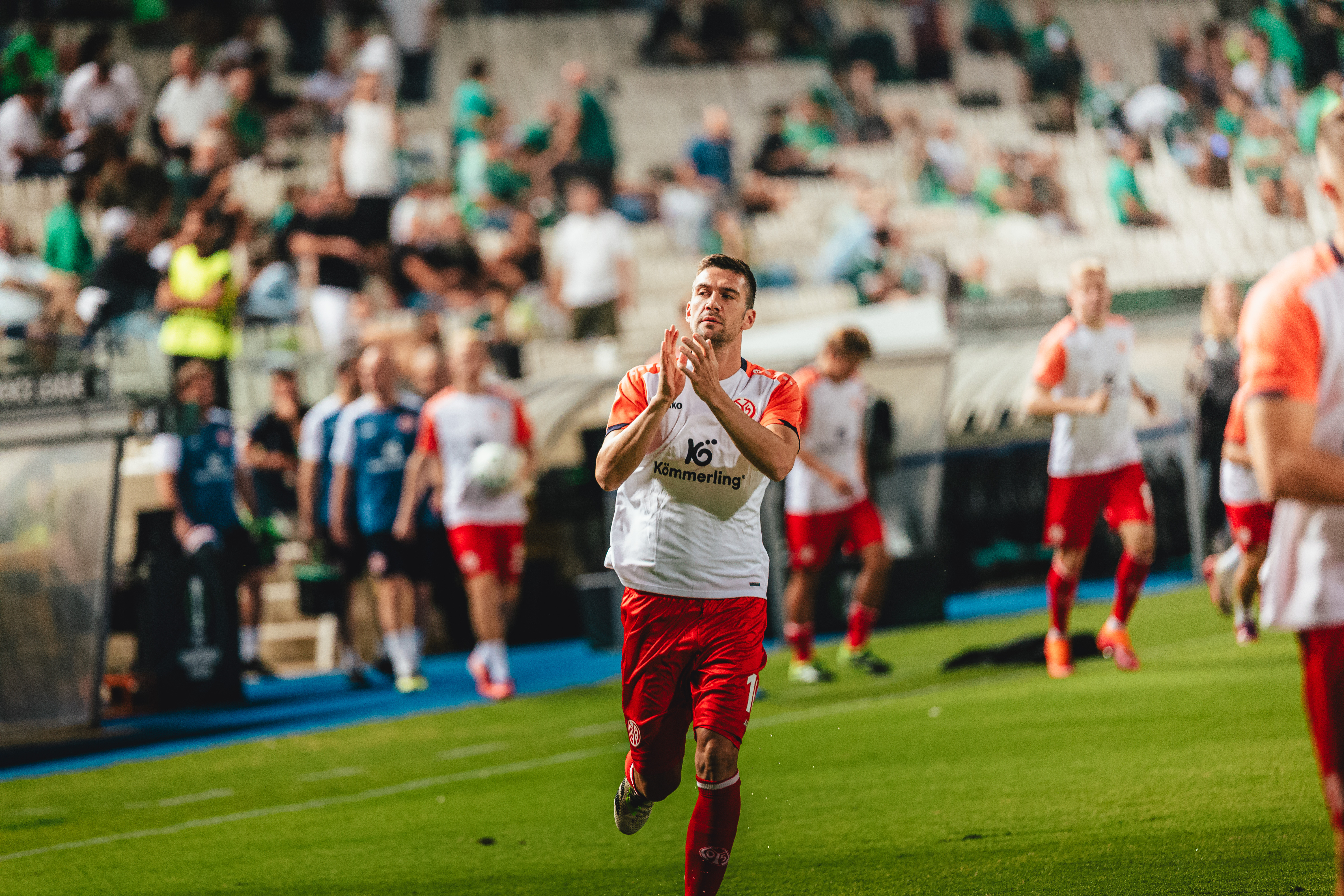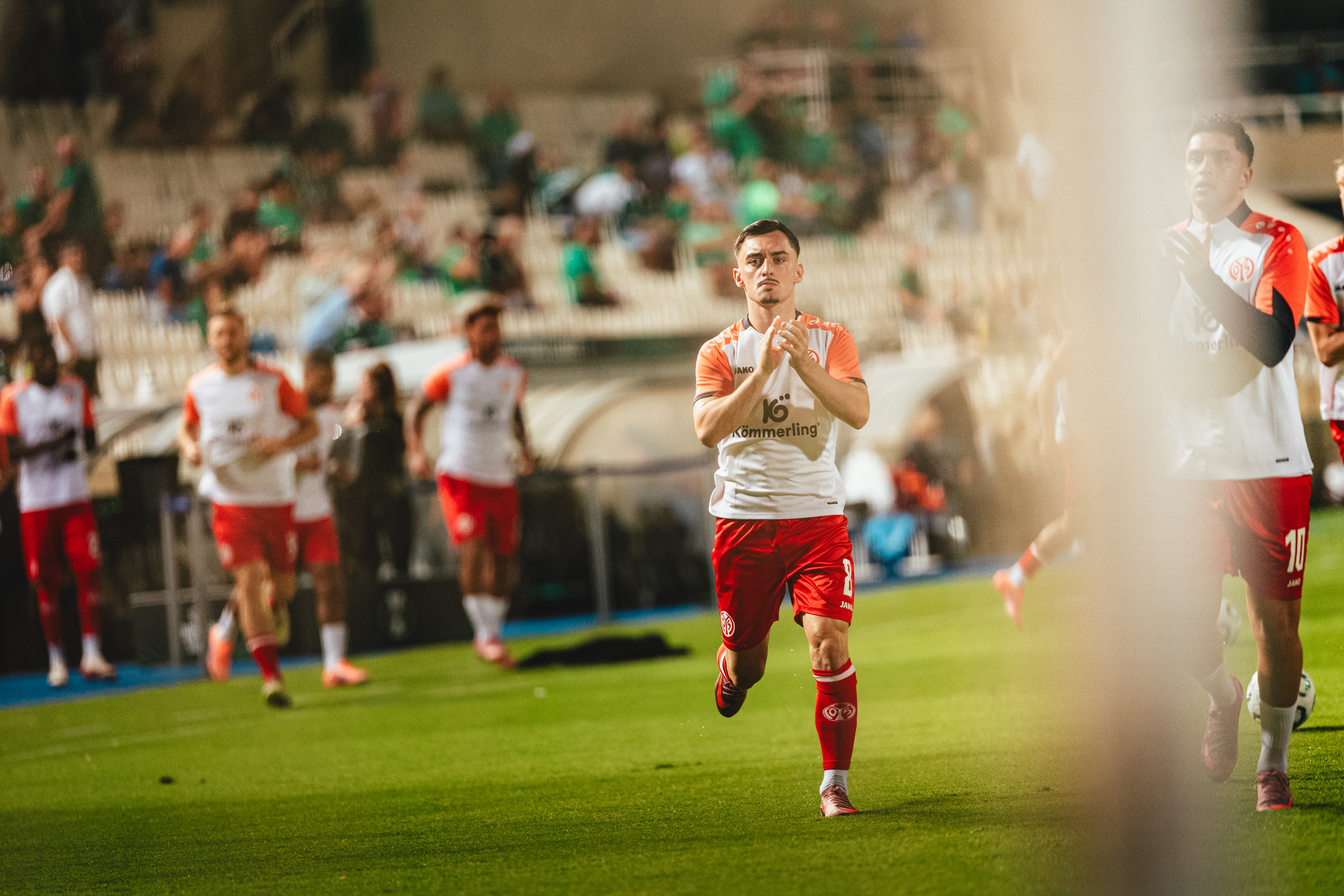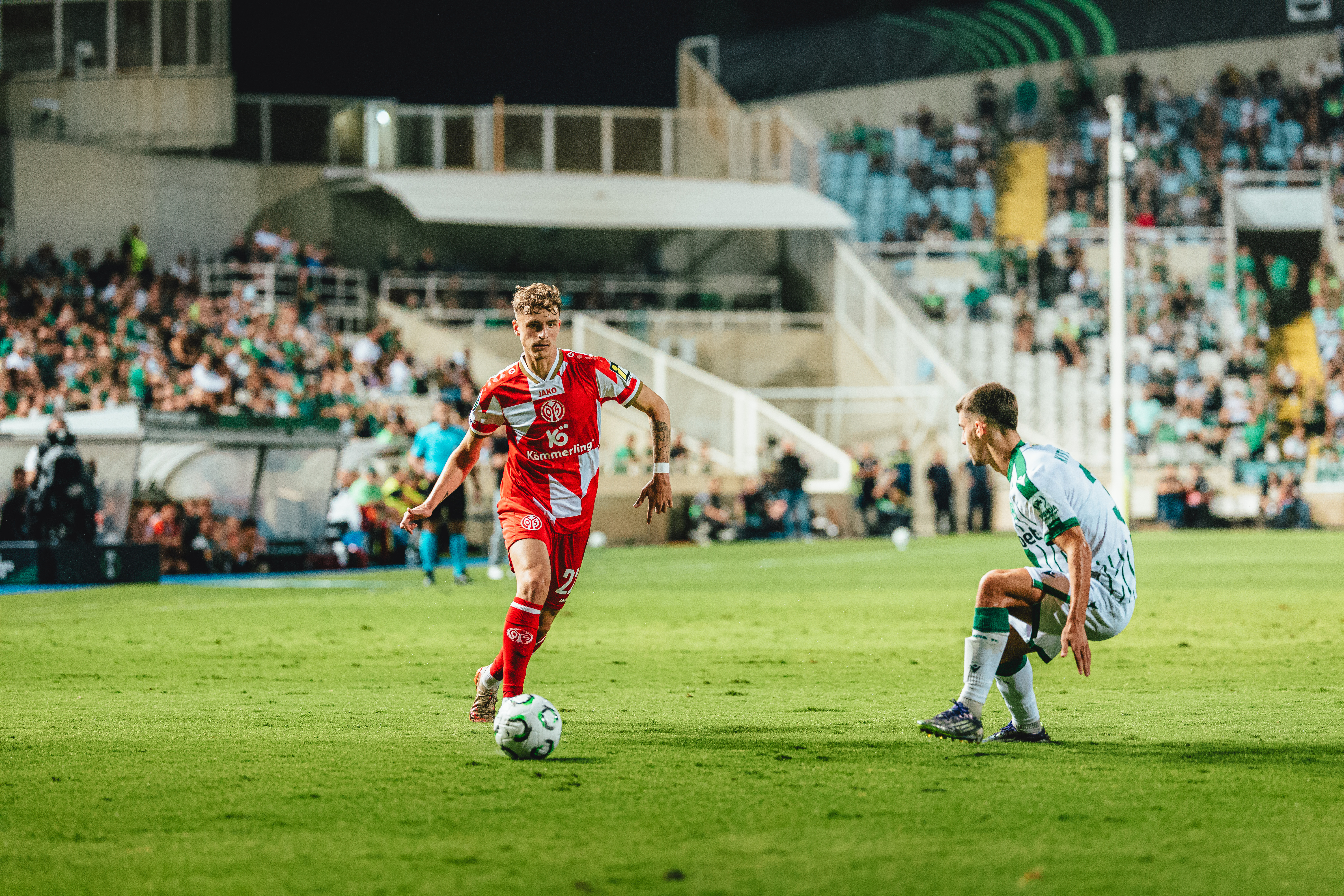In ihren ersten internationalen Auftritt seit knapp neun Jahren starteten die 05ER mit einem ersten zaghaften Schussversuch von Veratschnig (2.). Die Gelegenheiten der Gastgeber hatten es deutlich mehr in sich. Zunächst rettete Robin Zentner gegen Willy Semedo aus kurzer Distanz per Fußabwehr, danach hatte Ryan Mmaee die Führung aus abseitsverdächtiger Position auf dem Fuß, zielte aber einen Meter am leeren Tor vorbei (4.). Der FSV hatte durch Nordin und Nadiem Amiri zwar weitere Abschlüsse, in der munteren Anfangsphase aber durchaus seine Probleme mit den aggressiven und schnell umschaltenden Zyprern. Das Team von Trainer Henning Berg stieß immer wieder in gefährliche Räume rund um den Strafraum vor. So auch beim Schuss von Ioannis Masouras, den Zentner zur Seite abwehren konnte (8.). Nach zwanzig gespielten Minuten war es eine Begegnung auf Augenhöhe zwischen zwei Teams, die mit offenem Visier agierten. Bei den Rheinhessen fehlte im Spiel mit Ball noch die letzte Genauigkeit und Entschlossenheit in den Aktionen, um Torgefahr zu entwickeln.