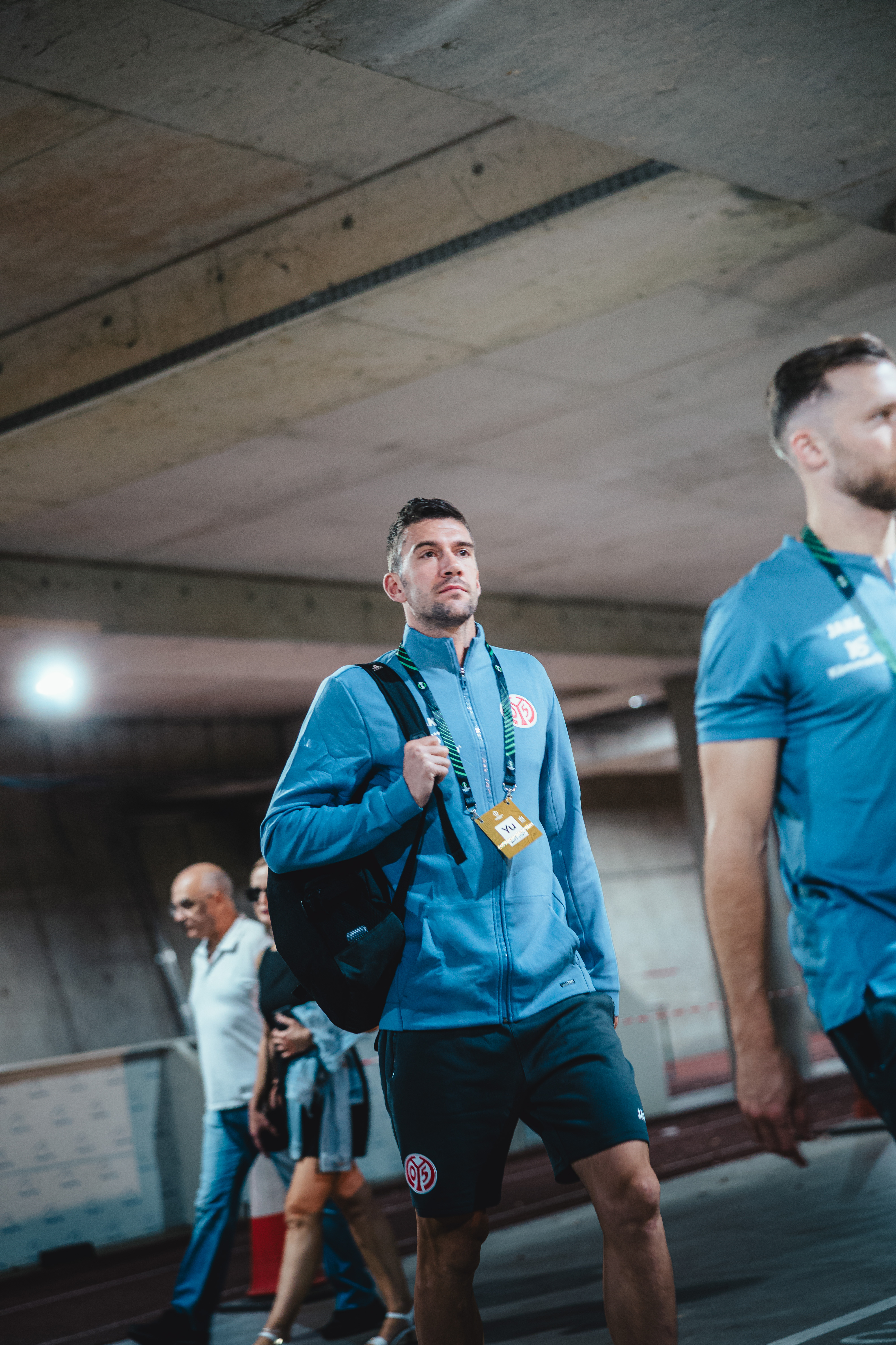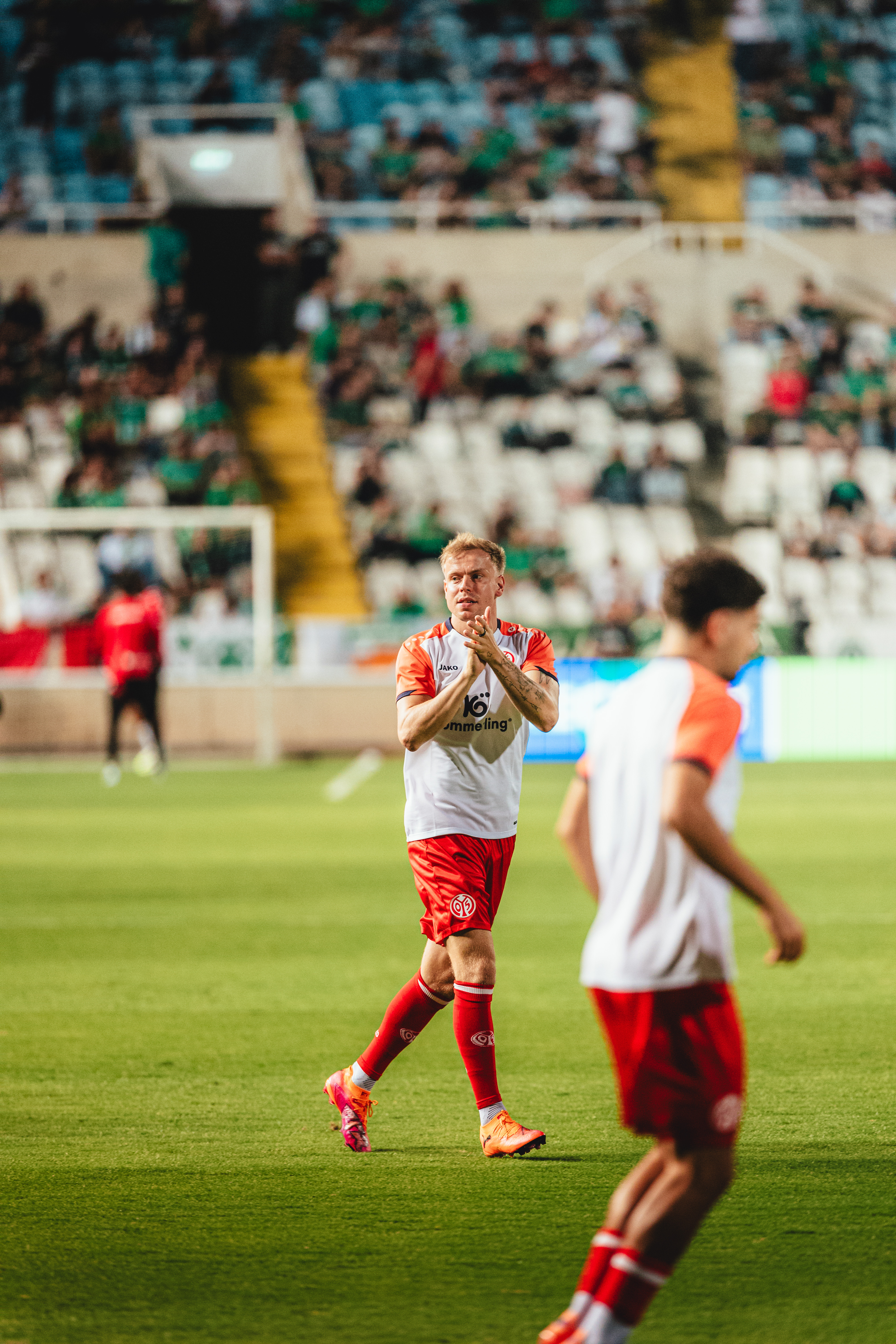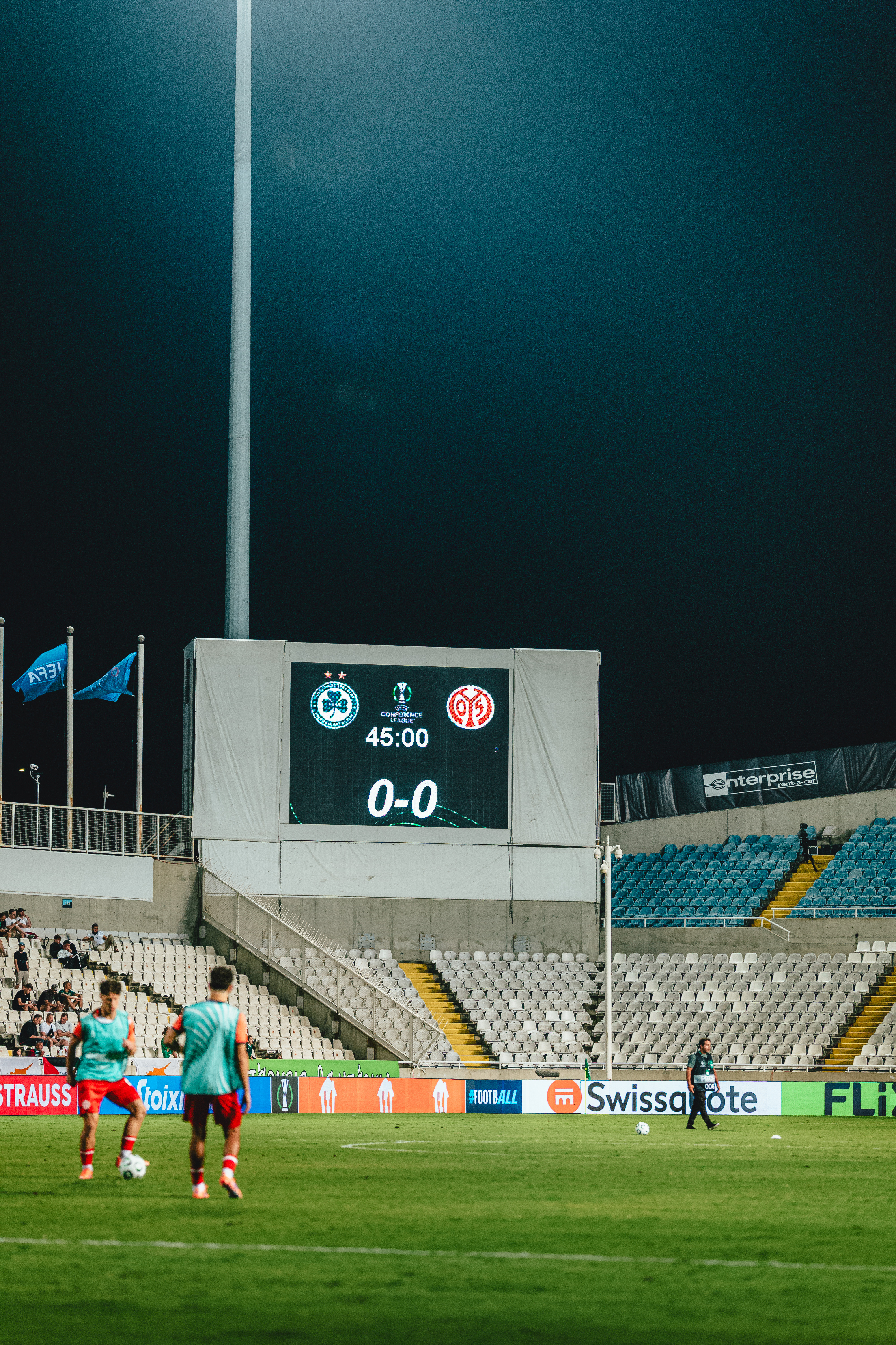 Die Partie fand nun fast ausschließlich in der Hälfte von Nikosia statt. Aus der Ballzirkulation rund um den Strafraum der Gastgeber entwickelte der FSV aber weiterhin zu wenig Torgefahr und kam selten zum Abschluss. Auf der Gegenseite vergab Stefan Simic bei einem der seltenen Entlastungsangriffe der Zyprer eine gute Einschussmöglichkeit (70.). Der wiedergenesene Benedict Hollerbach sollte in den letzten zwanzig Minuten die Abschlussstärke im Strafraum nochmal erhöhen. Es war aber der in den letzten Wochen auch offensiv immer stärker in Erscheinung tretende Sano, der mit einem beherzten Antritt in den Strafrraum eindrang und von Saad Agouzoul nur noch per Foul zu stoppen war. Den fälligen Elfmeter verwandelte Amiri sicher in die rechte Ecke zur Mainzer Führung (75.). Weil beim Torjubel zahlreiche Gegenstände auf die Mainzer Spieler flogen, unter anderem wurde Bobzien von einem Becher im Nacken getroffen, schickte Schiedsrichter Milos Milanovic beide Teams für eine kurze Unterbrechung vom Platz. Während sich das Geschehen abseits des Feldes wieder etwas beruhigt hatte, kontrollierten die 05ER weiterhin Ball und Gegner. Mit Lennard Maloney und Silvan Widmer für Mwene und Amiri brachten die Gäste auch die letzten Minuten ohne Gegentreffer über die Bühne und konnten nach dem Abpfiff gemeinsam mit ihren Fans den siegreichen Auftakt in der Conference League entsprechend bejubeln.