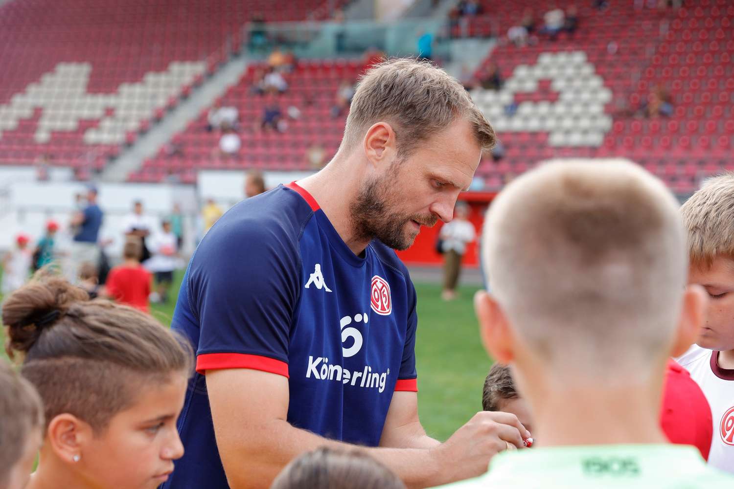 Das große Highlight des rundum gelungenen Tages folgte dann am Ende der Einheit, als die Kinder ihren Idolen ganz nah sein durften. Geduldig warteten sie auf das Startsignal von Bockius, während die Mannschaft noch fleißig den Trainingsplatz aufräumte, ehe sie auf den Rasen des Bruchwegstadions stürmten, um auf Autogramm- und Selfie-Jagd zu gehen. Ebenso geduldig wie die Kinder zuvor gewartet hatten, waren auch die Profis beim Signieren von Autogrammkarten, Trikots und vielen weiteren Utensilien. Mehr als eine halbe Stunde nahm sich die Mannschaft Zeit, um ihren Fans so viele Autogrammwünsche wie möglich zu erfüllen. Glückliche, meist breit grinsende Kinder sowie zufriedene Eltern machten sich wenig später auf den Weg nach Hause. Mit Erinnerungen im Gepäck, die sie so schnell wohl nicht vergessen dürften.