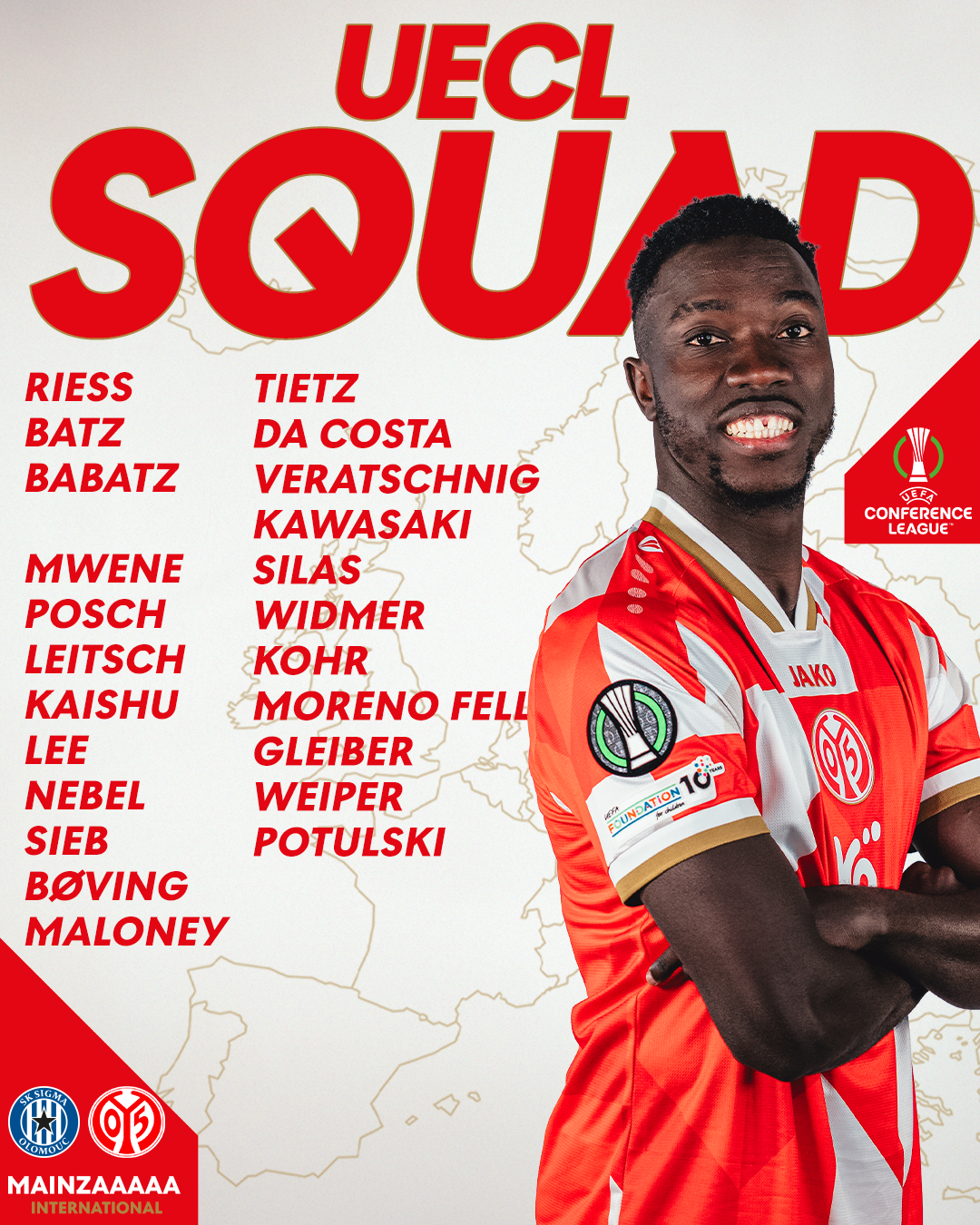 Nicht dabei sein werden im ersten internationalen K.o.-Spiel der Vereinsgeschichte der Mainzer Nadiem Amiri, Sheraldo Becker (konnte nicht mehr für die UECL nachgemeldet werden), Stefan Bell, Anthony Caci (absolvierte Teile des Teamtrainings), Andreas Hanche-Olsen, Benedict Hollerbach sowie die etatmäßige Nummer eins Robin Zentner. Das Rückspiel steigt am 19. März in der 05-Heimspielstäte.
