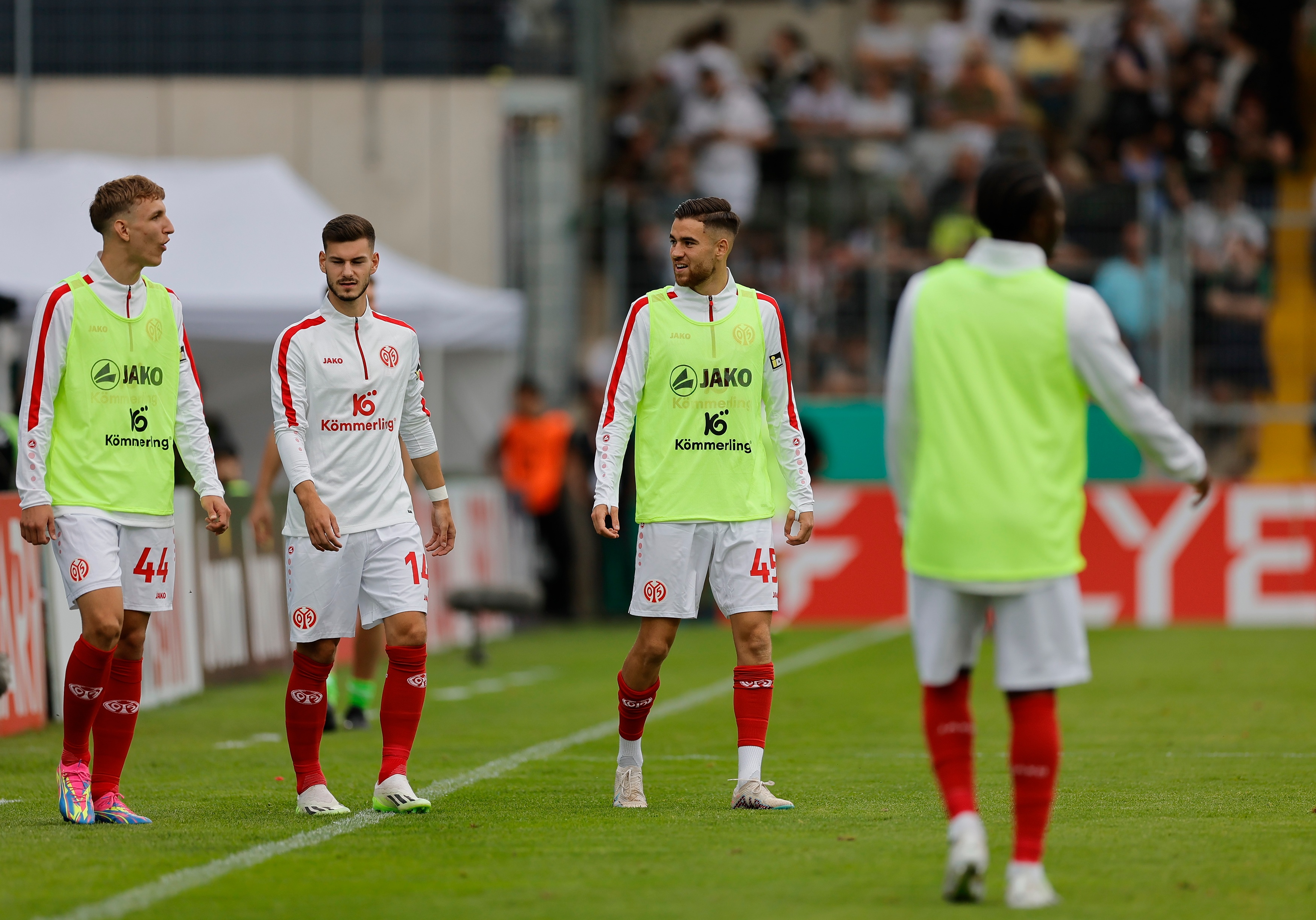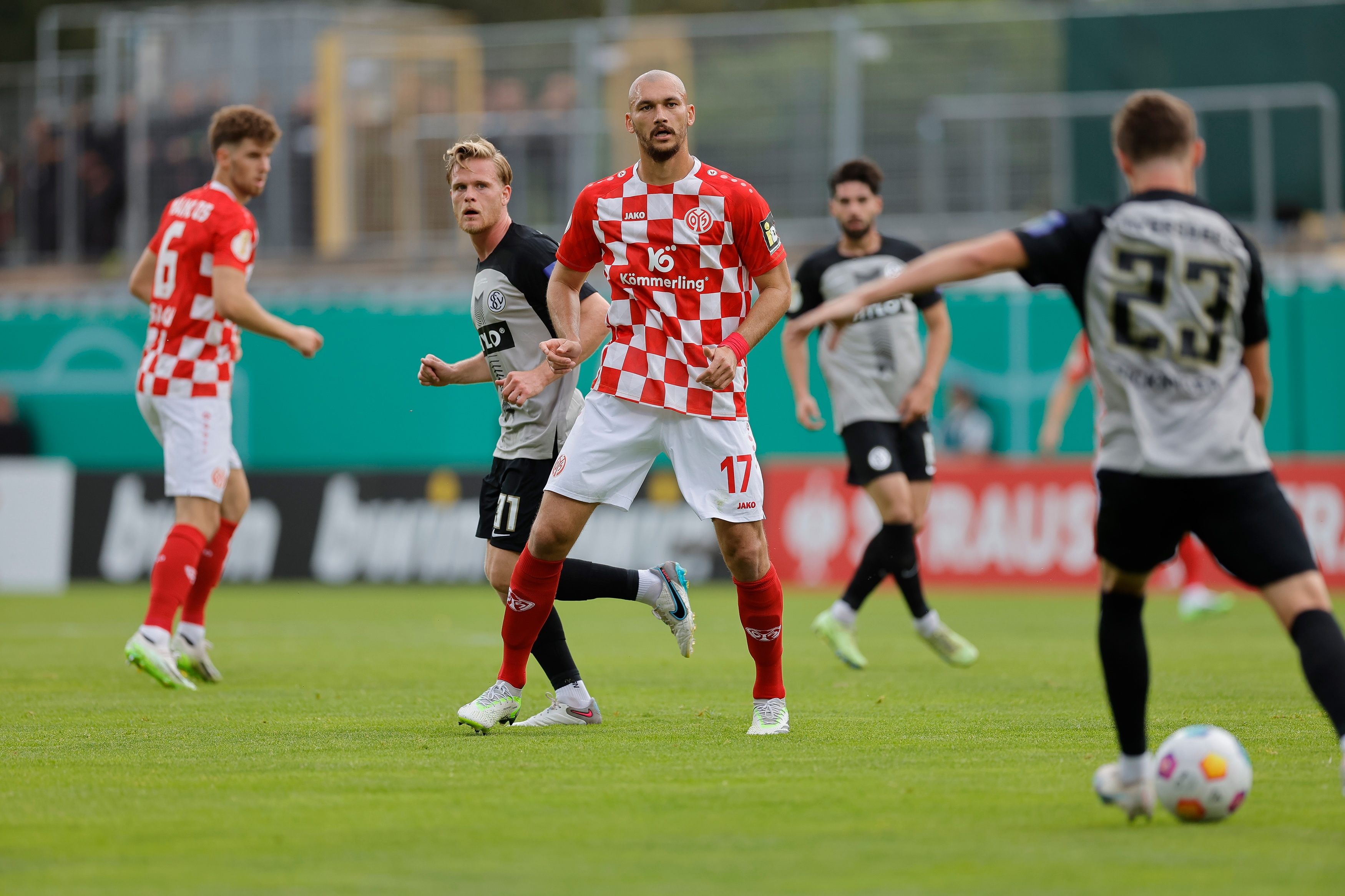 Zu Abschlusssituationen kam es im Anschluss seltener, die Überlegenheit des Bundesligisten sollte sich bis zur Halbzeitpause jedoch auch in Zahlen ausdrücken. Zehn zu eins Abschlüsse aus 05-Sicht standen da zu Buche. Eine ganz knifflige Situation in der 43. Minute wurde zudem gegen den FSV entschieden. Anton Stach hatte Ajorque mit einem langen Ball aus der eigenen Hälfte auf die Reise geschickt, der Franzose im Strafraum volley abgezogen und getroffen, dem Tor wurde aufgrund einer vermeintlichen Abseitsposition jedoch die Anerkennung verweigert - eine eher falsche Entscheidung, die durch den in der ersten Pokal-Runde fehlenden Video-Assistenten nicht mehr überprüft werden konnte. Mit einem torlosen Remis ging es wenig später in die Katakomben.