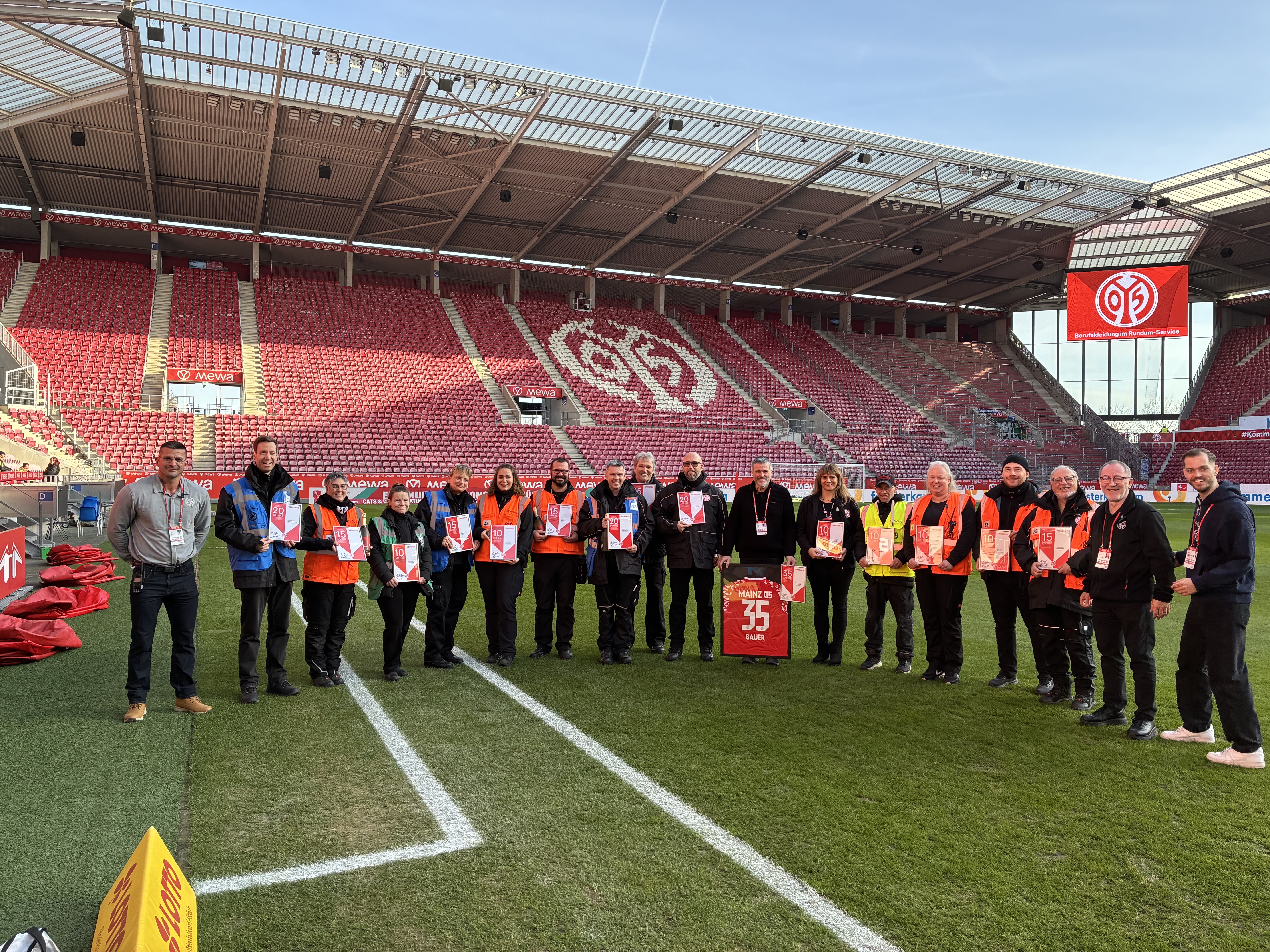 Als einen "ganz normalen Arbeitstag" bezeichnet Thomas Bauer, Leiter Ordnungsdienst bei Mainz 05, den letzten Spieltag des Jahres 2025 in der MEWA ARENA. Eine Kleinigkeit verlief dann allerdings doch anders als gewohnt - vor der Partie wurden er sowie 17 weitere Ordnerinnen und Ordner für ihr Jubiläum beim FSV ausgezeichnet. Stefan Hofmann, Vereins- und Vorstandsvorsitzender des FSV, gratulierte zu zehn, 15 und 20 Jahren Tätigkeit im Ordnungsdienst, während Bauer sogar für ganze 35 Jahre geehrt wurde. Obwohl der Tag für ihn vorrangig von den gewohnten Abläufen und Routinen geprägt gewesen sei, habe er sich sehr über die Wertschätzung gefreut. "Die Ehrung hat mich schon überrascht, Christian Heidel war ebenfalls dabei. Das war eine schöne Sache", so Bauer.
