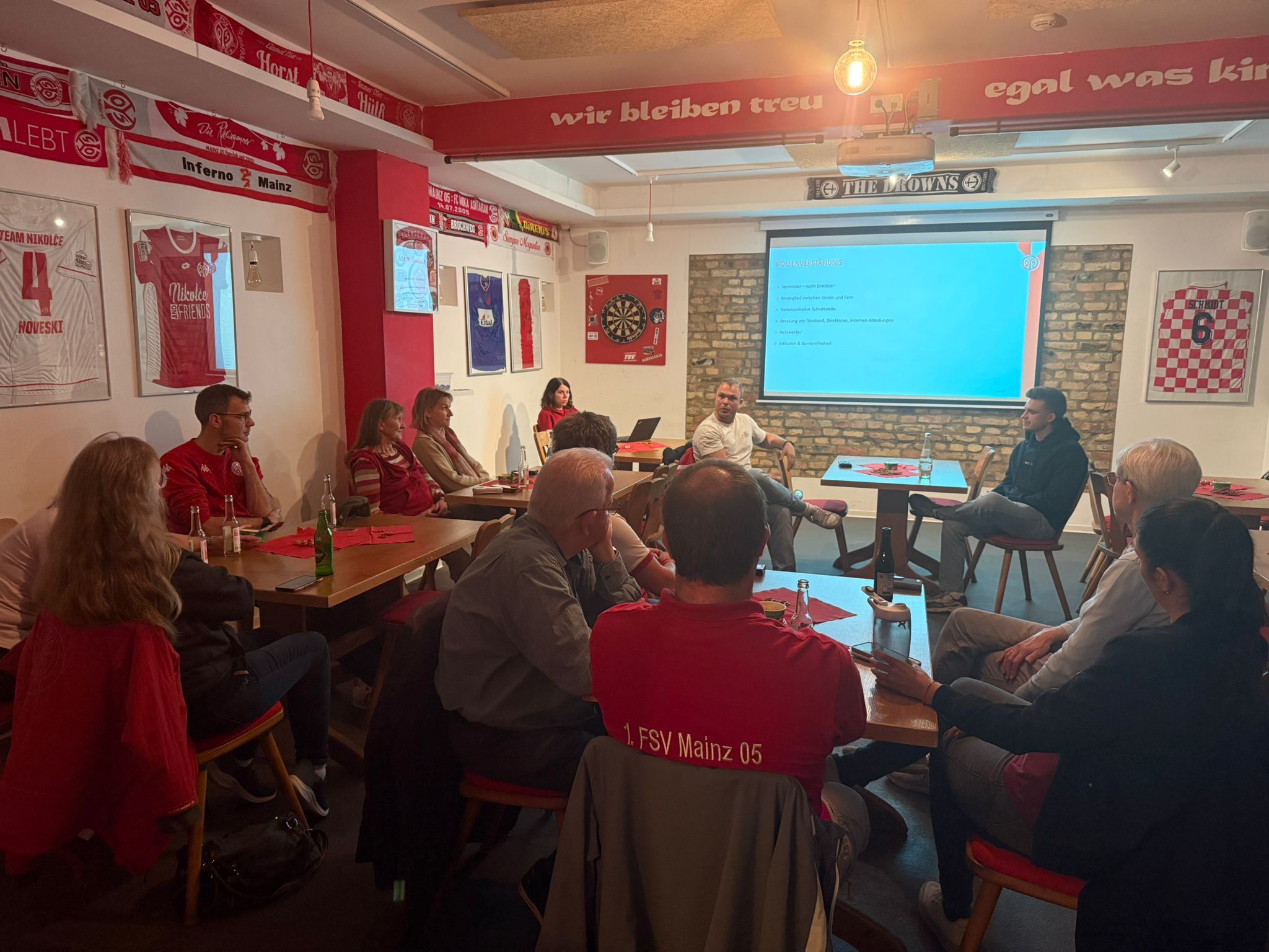 Beim jüngsten Mitgliederstammtisch der Fanabteilung im Fanhaus war die hauptamtliche Fanbetreuung des 1. FSV Mainz 05 zu Gast. Mit Julian Sievers und Vincent Braun nahmen zwei der vier hauptamtlichen Mitarbeitenden an der Runde teil und stellten sich den Fragen, Anliegen und Anregungen der anwesenden Mitglieder. In einer offenen und lebhaften Gesprächsrunde präsentierten Julian und Vincent das Team der Fanbetreuung sowie deren vielfältige Aufgaben und Ziele. Im Mittelpunkt stehen dabei der kontinuierliche Dialog zwischen Fans und Verein, die Förderung einer positiven Fankultur sowie der Aufbau und die Pflege vertrauensvoller Beziehungen innerhalb der 05-Familie.