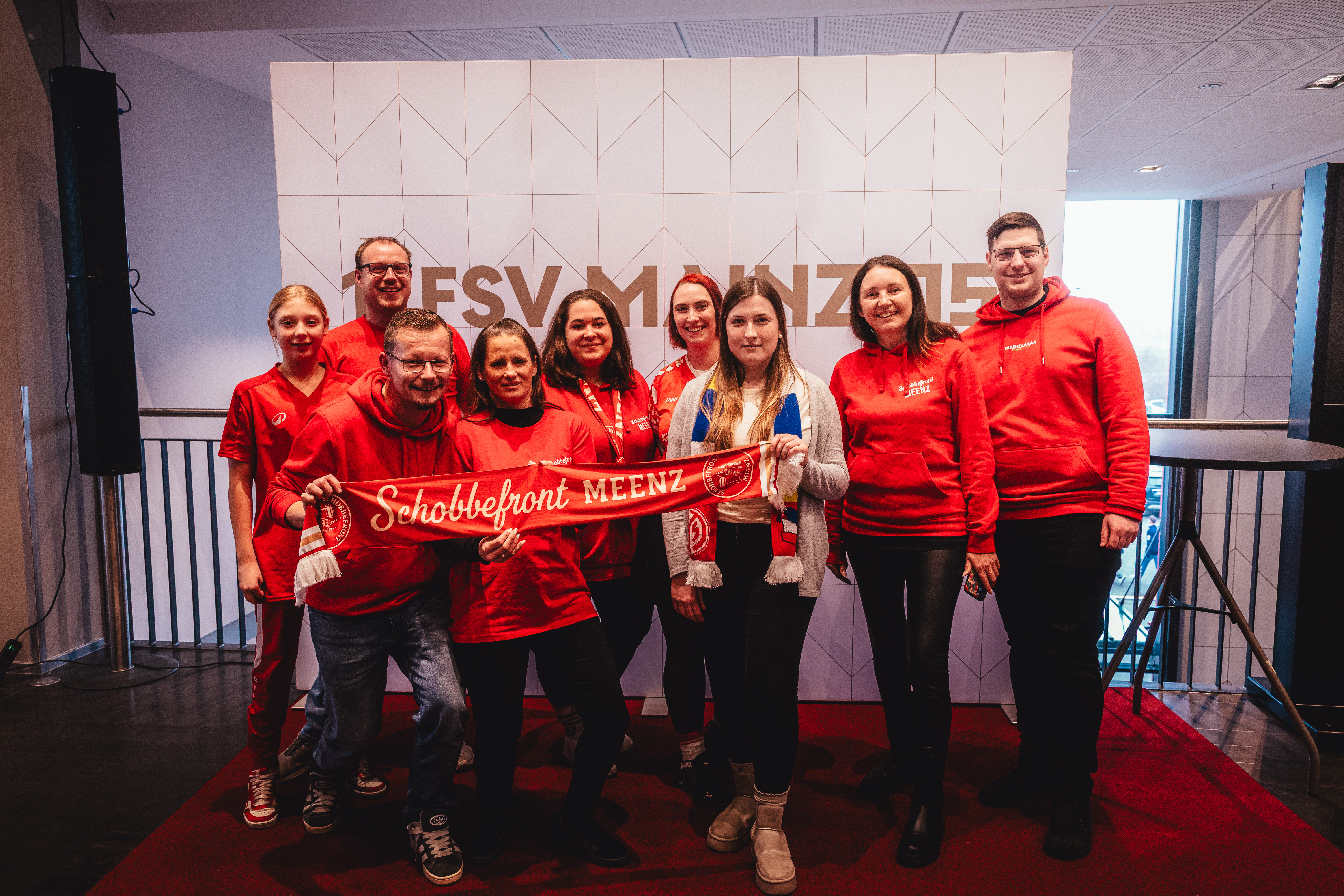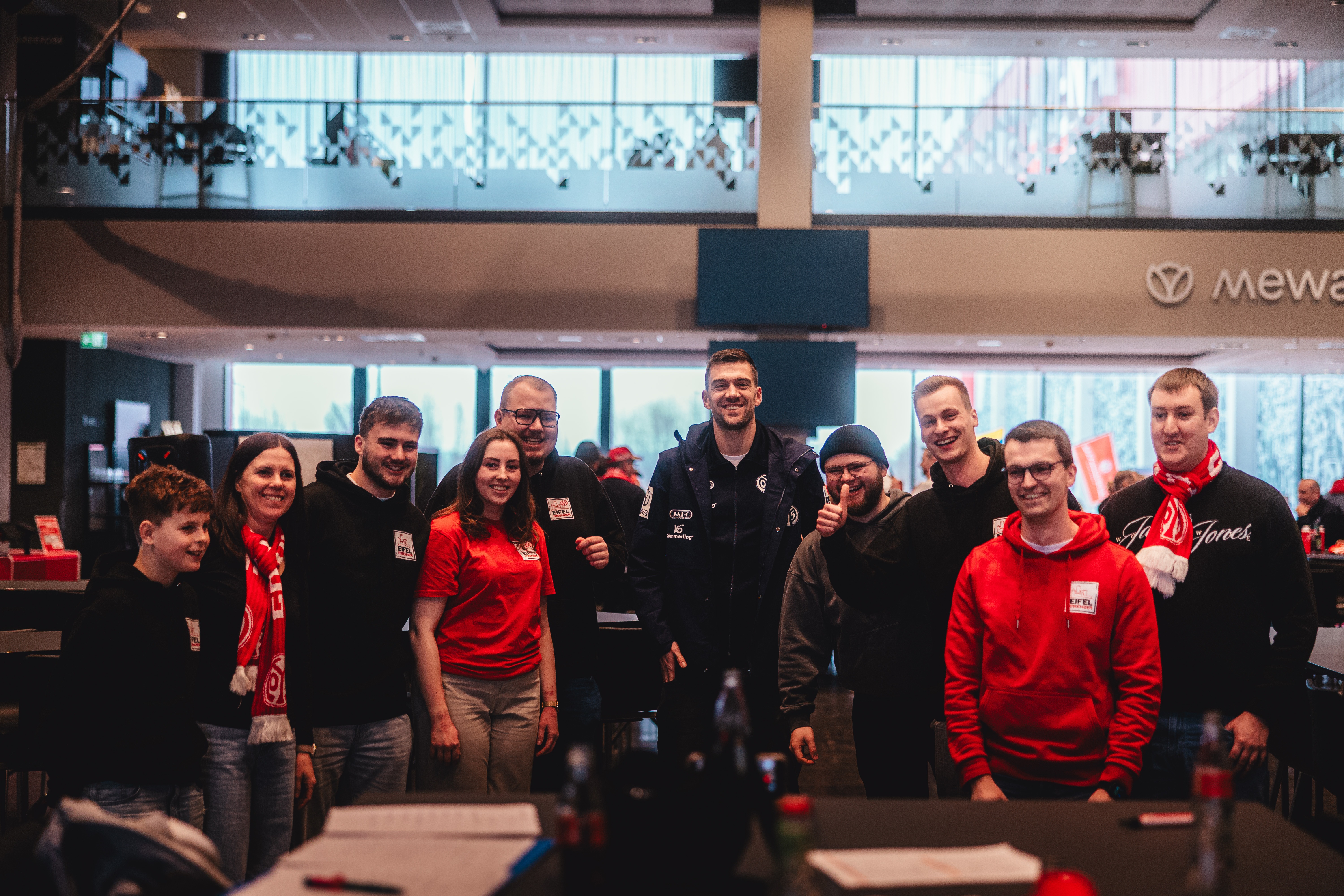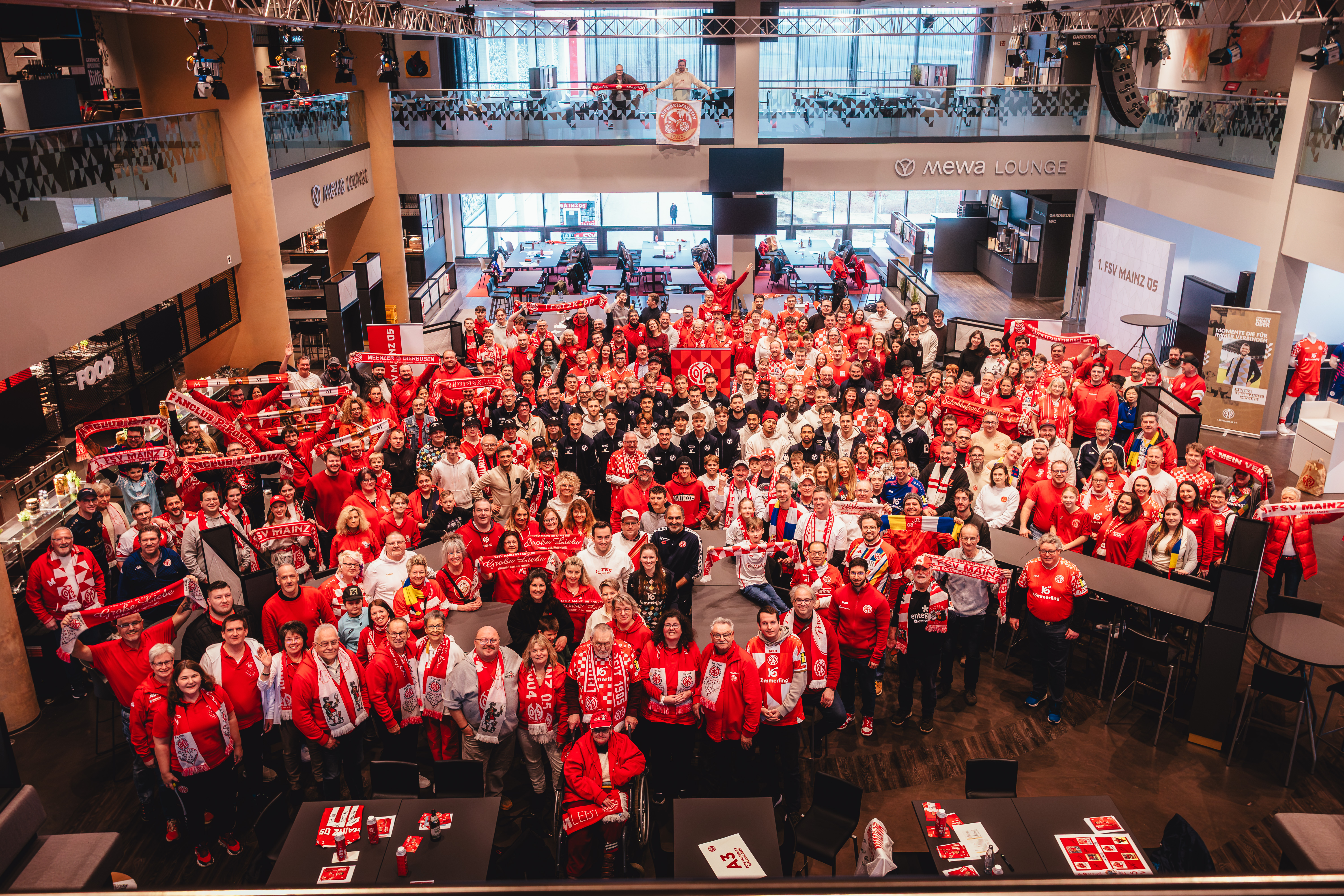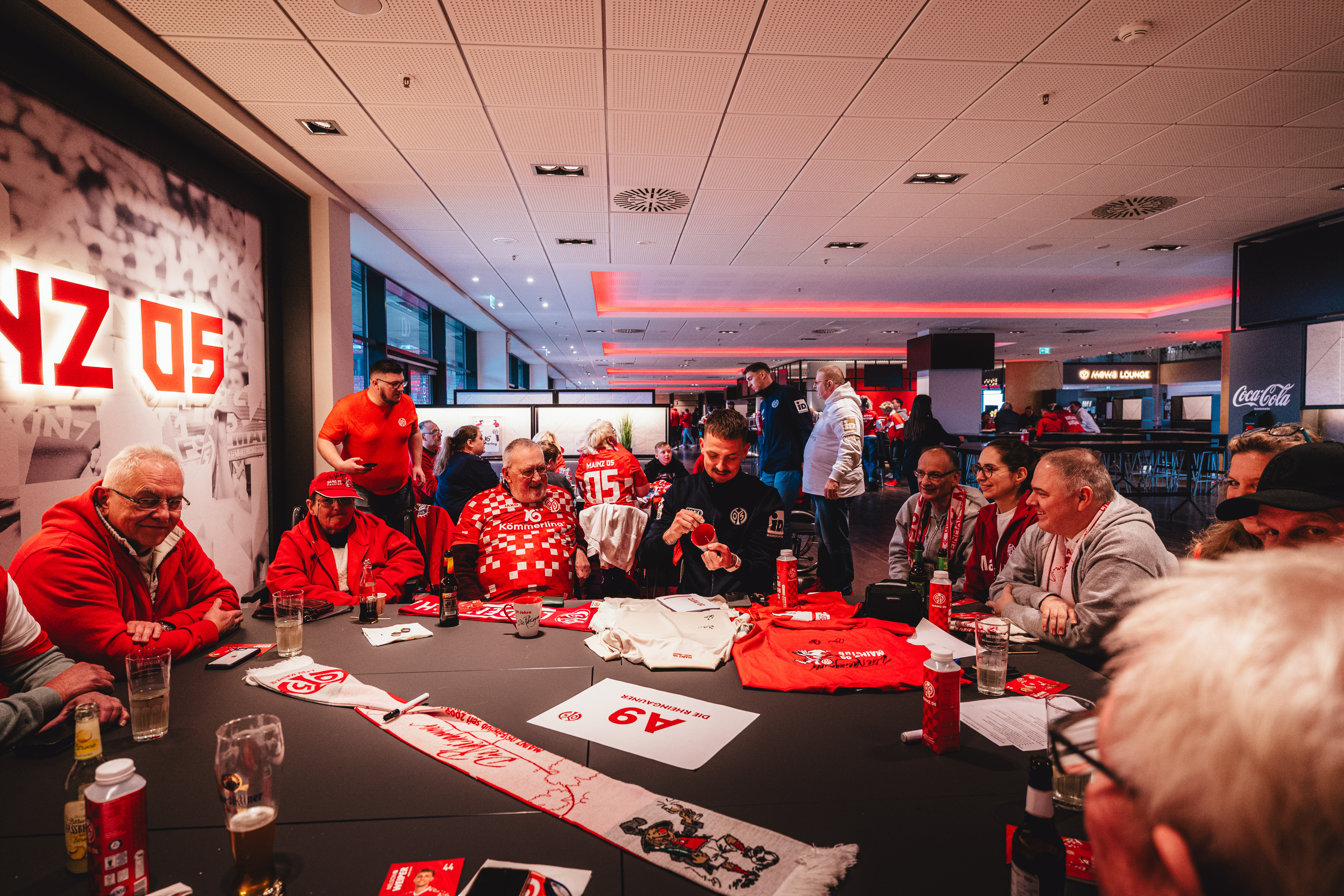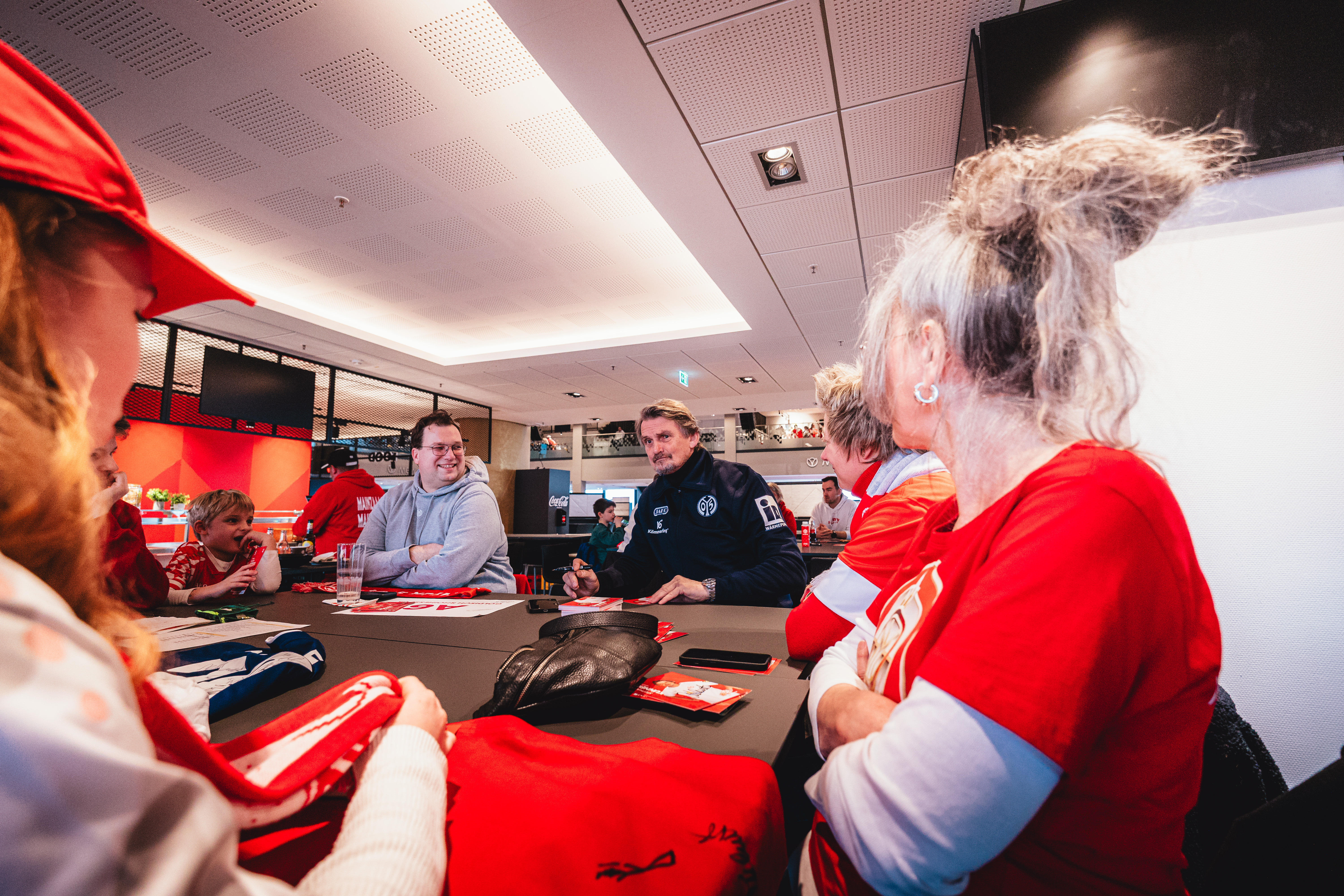 An einem Tisch mit den 05-Profis sitzen: Genau das haben zahlreiche Fans von Mainz 05 am Tag nach dem Heimsieg gegen den VfL Wolfsburg erlebt. Die Fanbetreuung hatte ein Fanclub-Speeddating organisiert, für das sich über 350 Personen angemeldet und am Sonntag in den VIP-Räumlichkeiten der MEWA ARENA eingefunden haben. Dort trafen sie nicht nur auf den gesamten Profikader, sondern auch das neue Trainerduo Urs Fischer und Markus Hoffmann sowie Torwarttrainer Stephan Kuhnert. Das Team nahm sich mehr als zwei Stunden lang Zeit, hatte sichtlich Spaß, mit den knapp 50 Fanclubs in den Austausch zu gehen und hat den Fans in einer sehr lockeren und vertrauten Atmosphäre einen unvergesslichen Tag beschert.