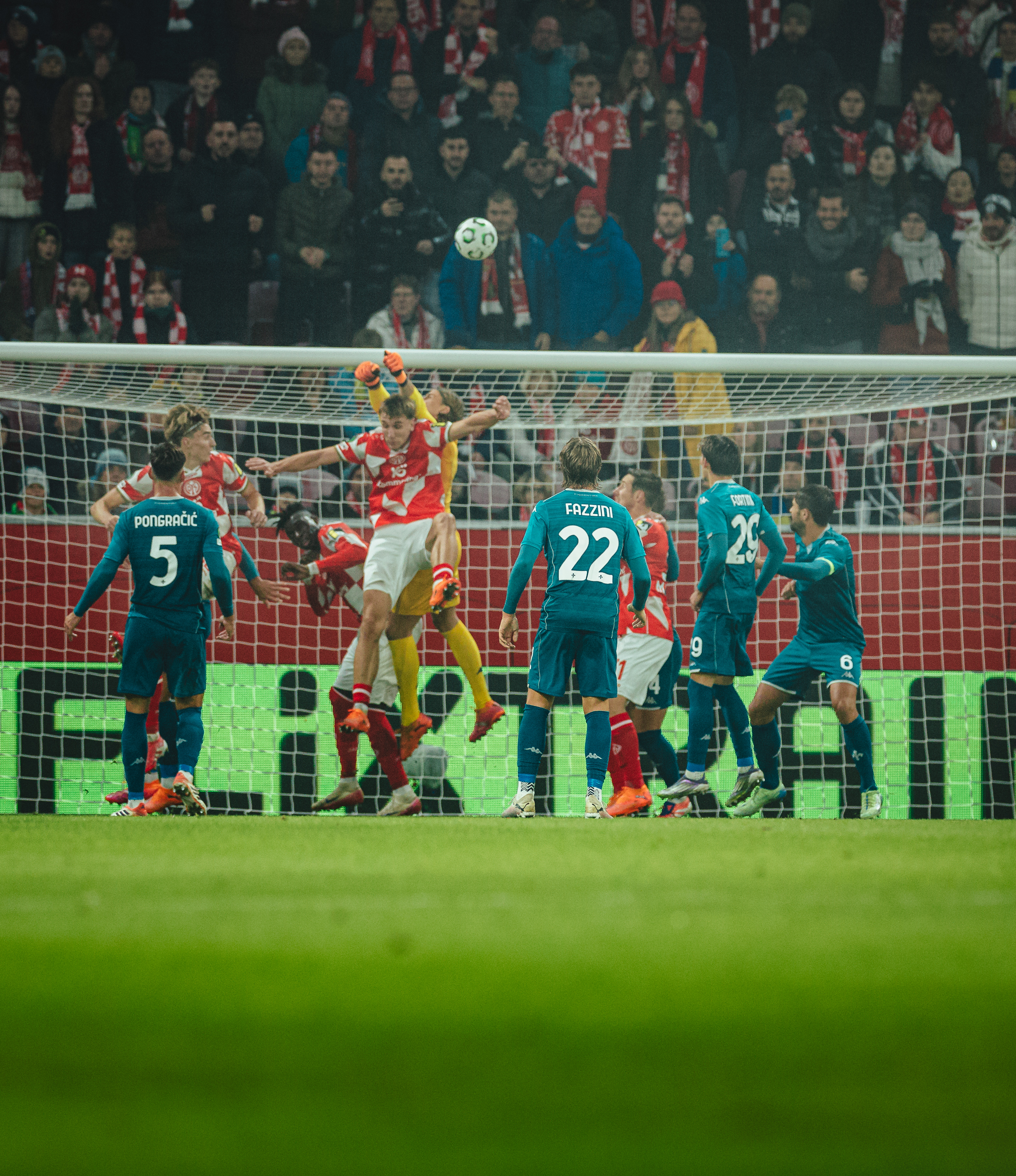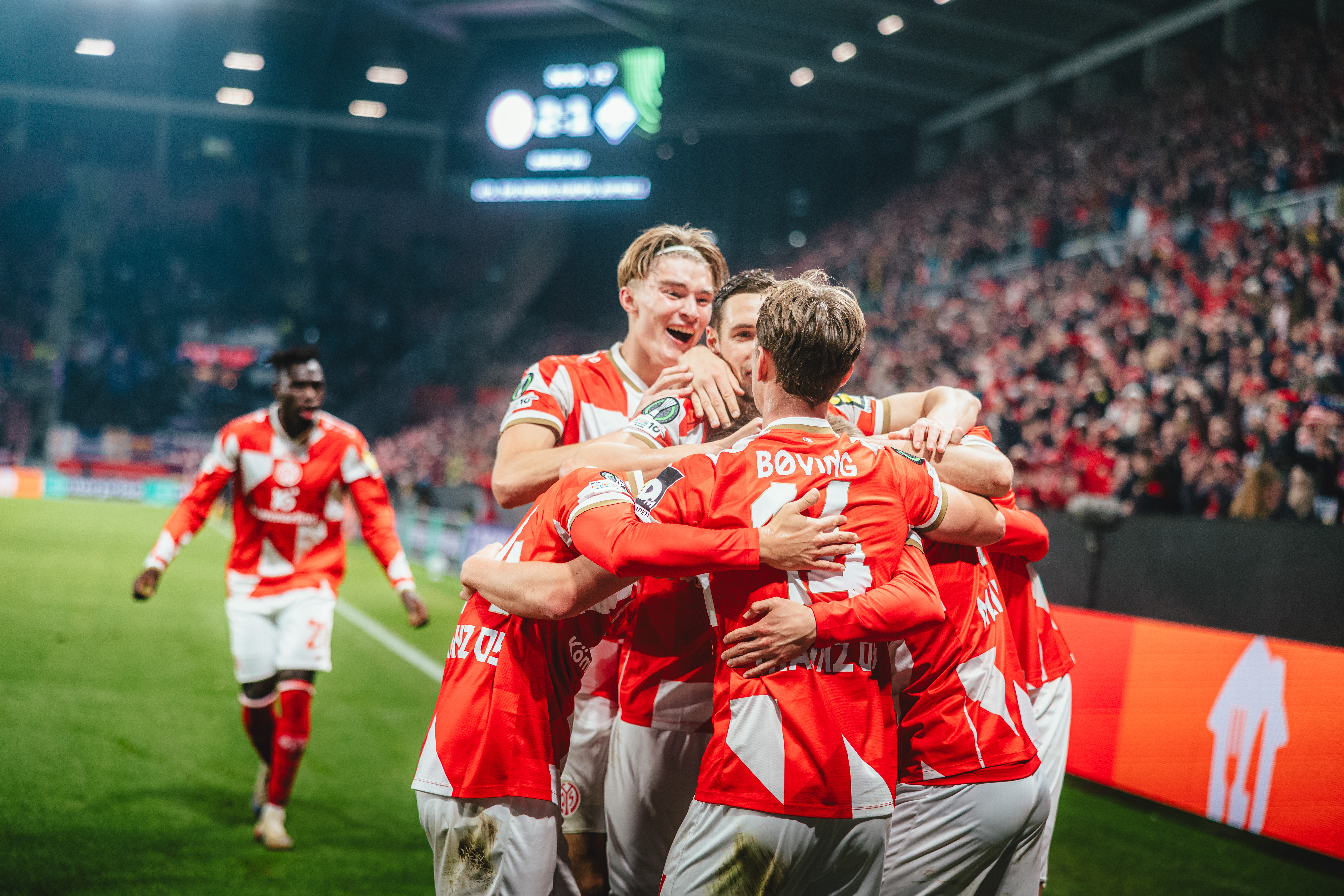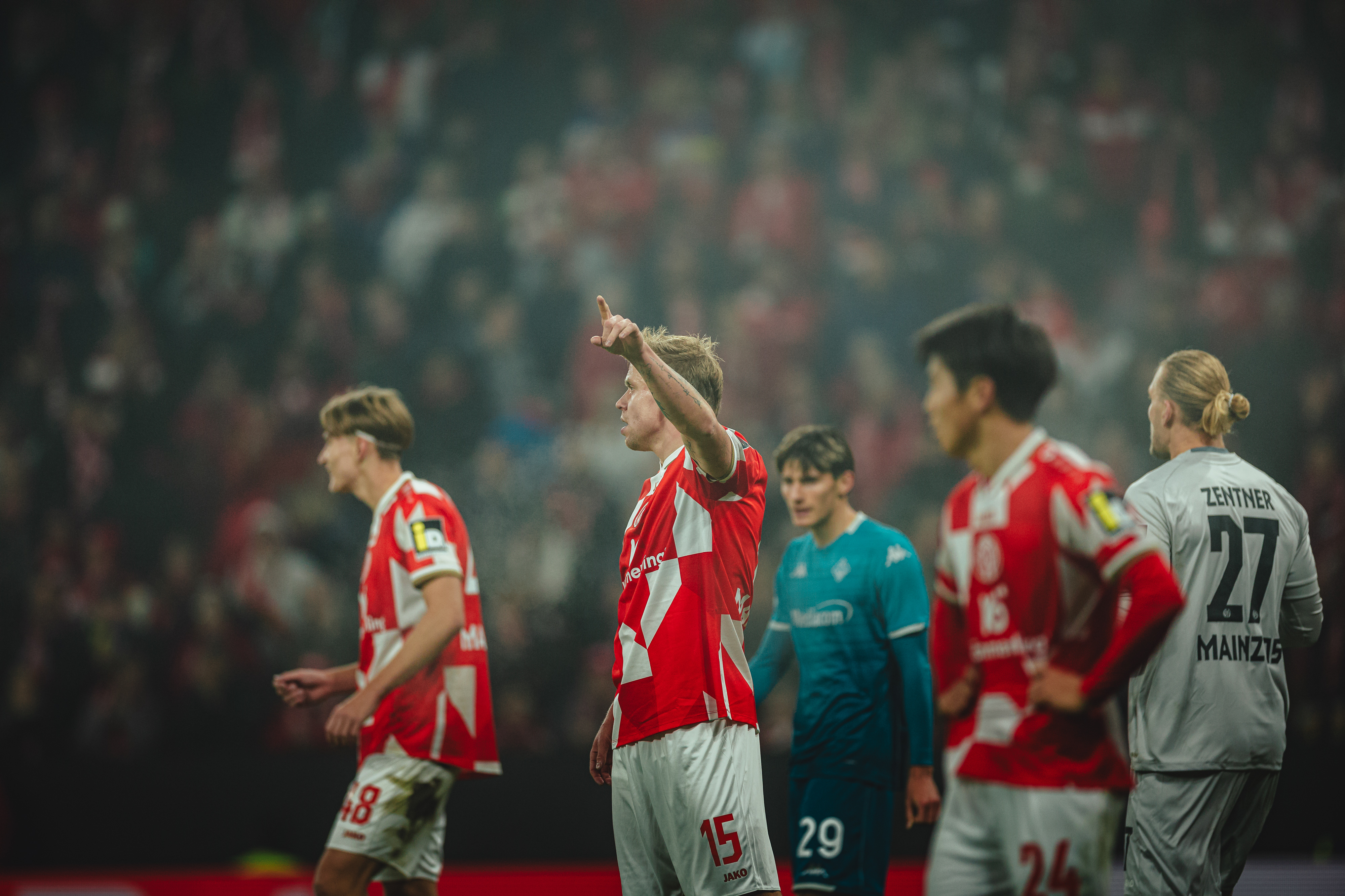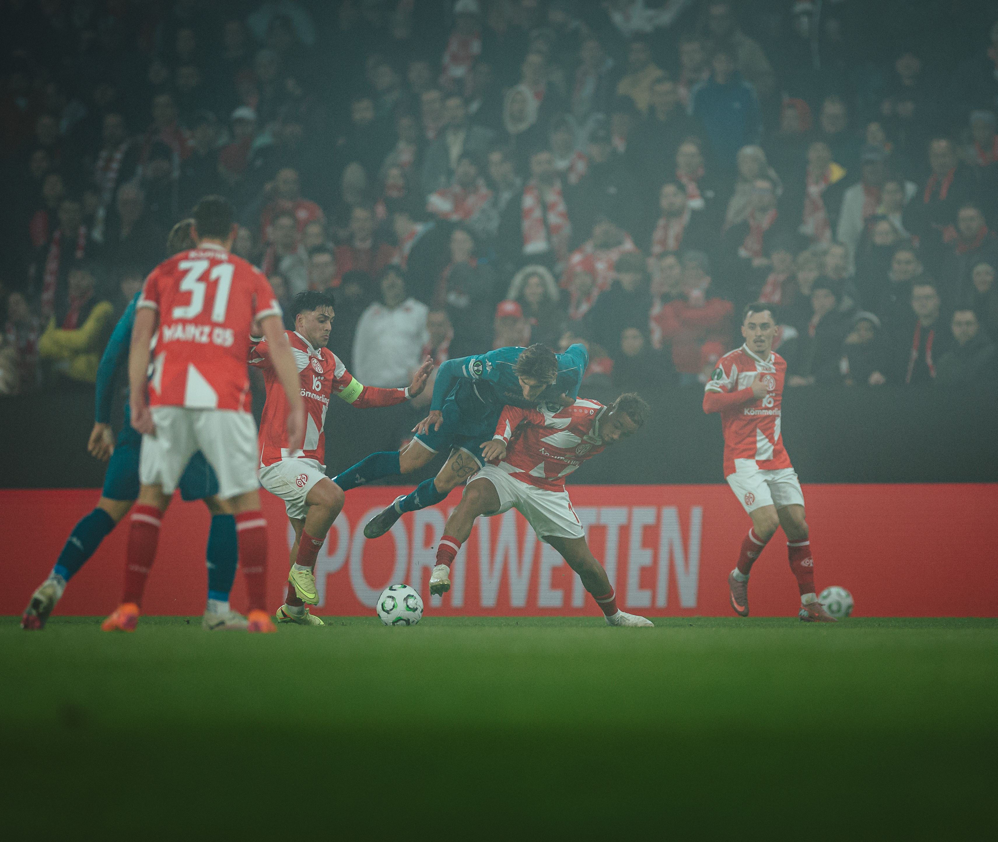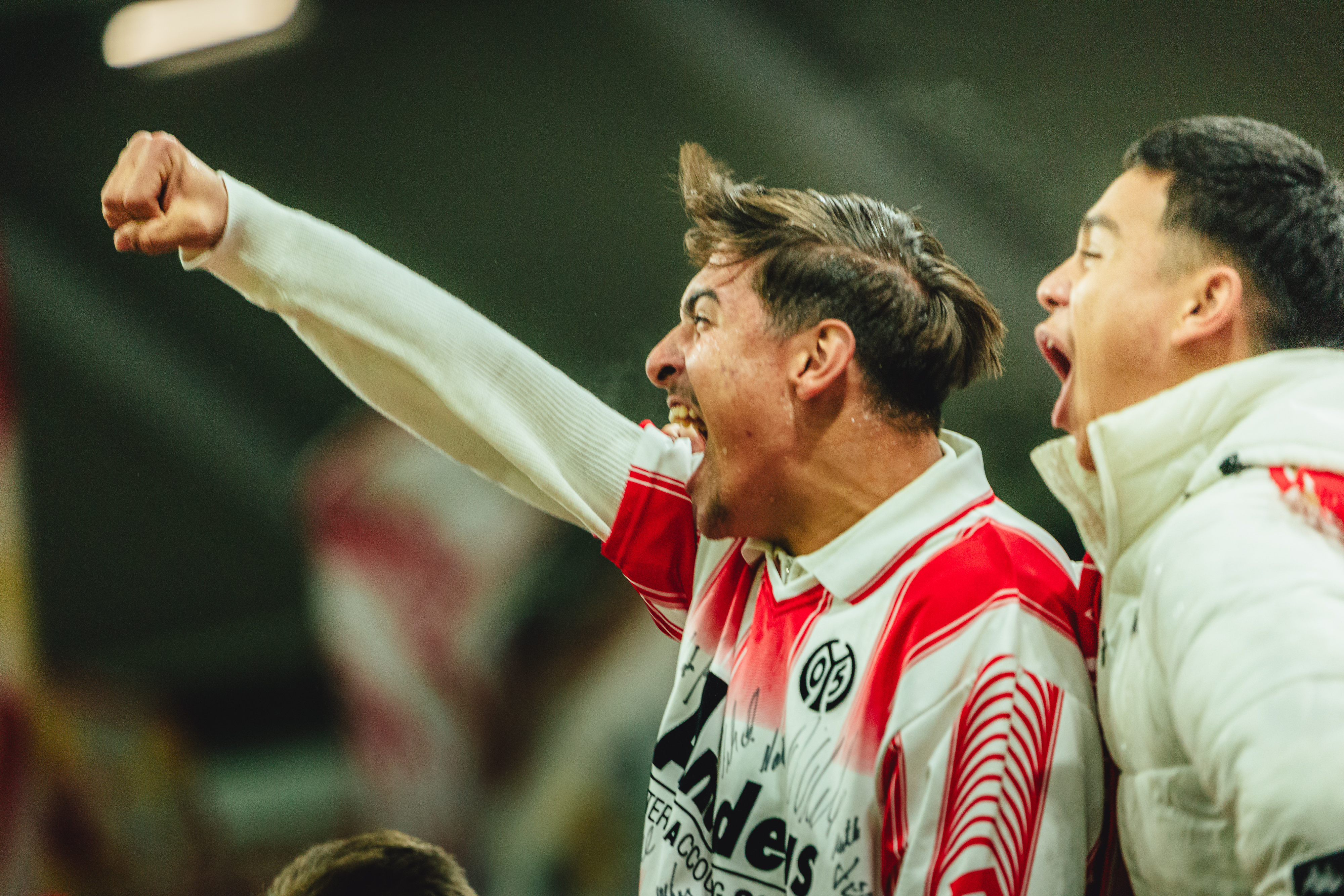 Mit dem inzwischen verdienten Remis ging es in die Schlussphase, in der der FSV in Minute 77 kräftig durchatmen durfte: Dodo hatte eine Flanke ins Zentrum gebracht, der eingewechselte Moise Kean setzte den Ball aber per Kopf - völlig alleingelassen - nebens Tor. Kurz darauf hatte auch Amiri Feierabend, den Regisseur ersetzte in den letzte zehn Minuten William Böving. Auf das Remis verständigt hatten sich die Teams hier längst noch nicht, denn auch auf der anderen Seite wurde es kurz darauf wieder ernst. Zunächst wurde ein Sano-Schuss nach schönem Solo des Japaners geblockt, und nur Sekunden später landete ein Versuch Bövings über dem Querbalken (beides 84.). Danach dauerte es bis tief hinein in die fünfminütige Nachspielzeit, bis die Mainzer Arena komplett eskalierte. Kurz zuvor hatte bereits Weiper den Lucky Punch auf dem Fuß gehabt, war aber am Keeper gescheitert, der gegen den mustergültigen Kopfball Lees nach Flanke von Sano machtlos war -2:1 in der 94. Minute! Wenig später war Schluss, die Arena ein Tollhaus, die 05ER feierten den ersten Heimsieg seit dem 4:1 gegen Trondheim im August und kommen nach drei Conference-League-Partien auf die Maximal-Ausbeute von neun Zählern.