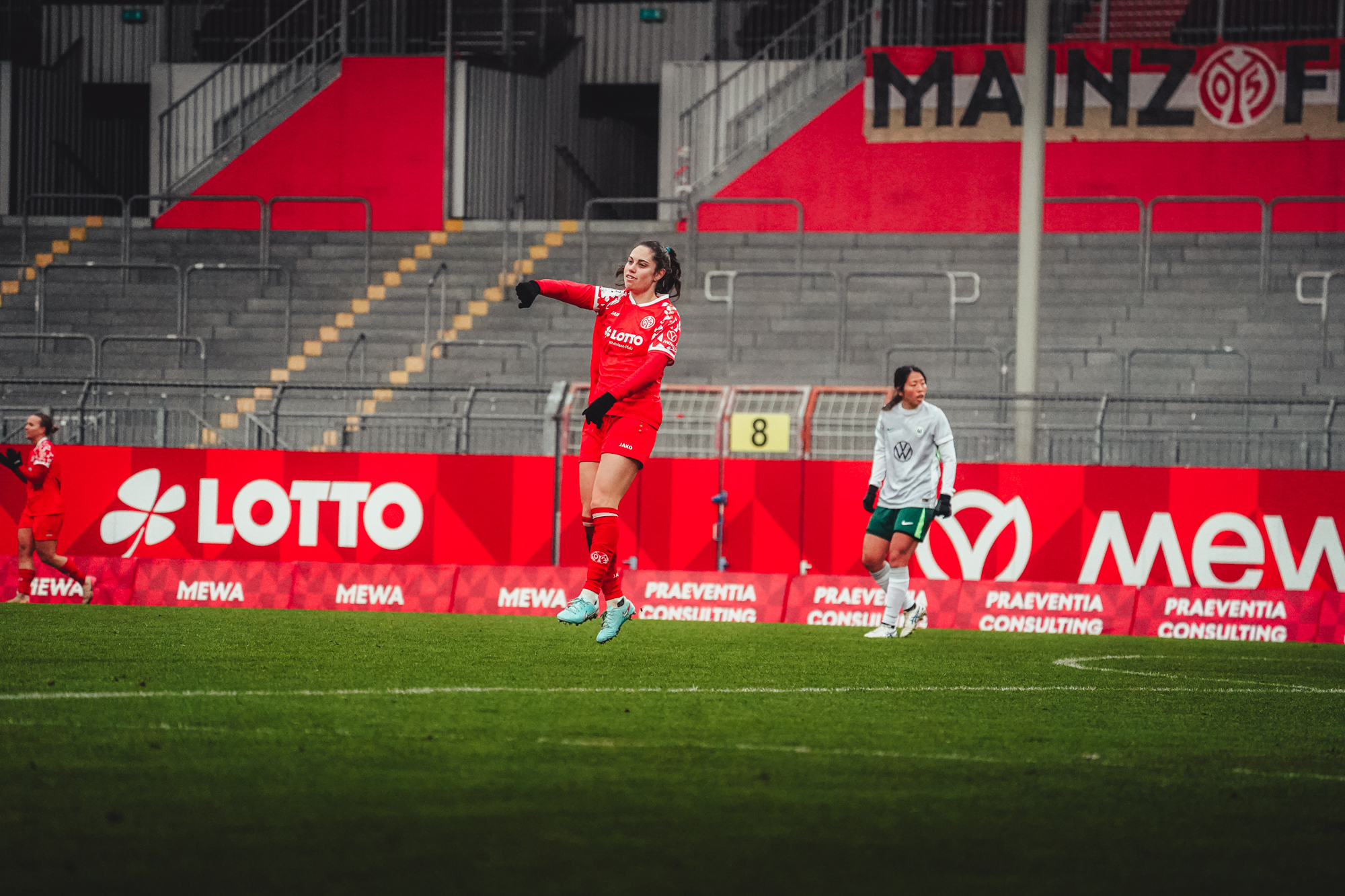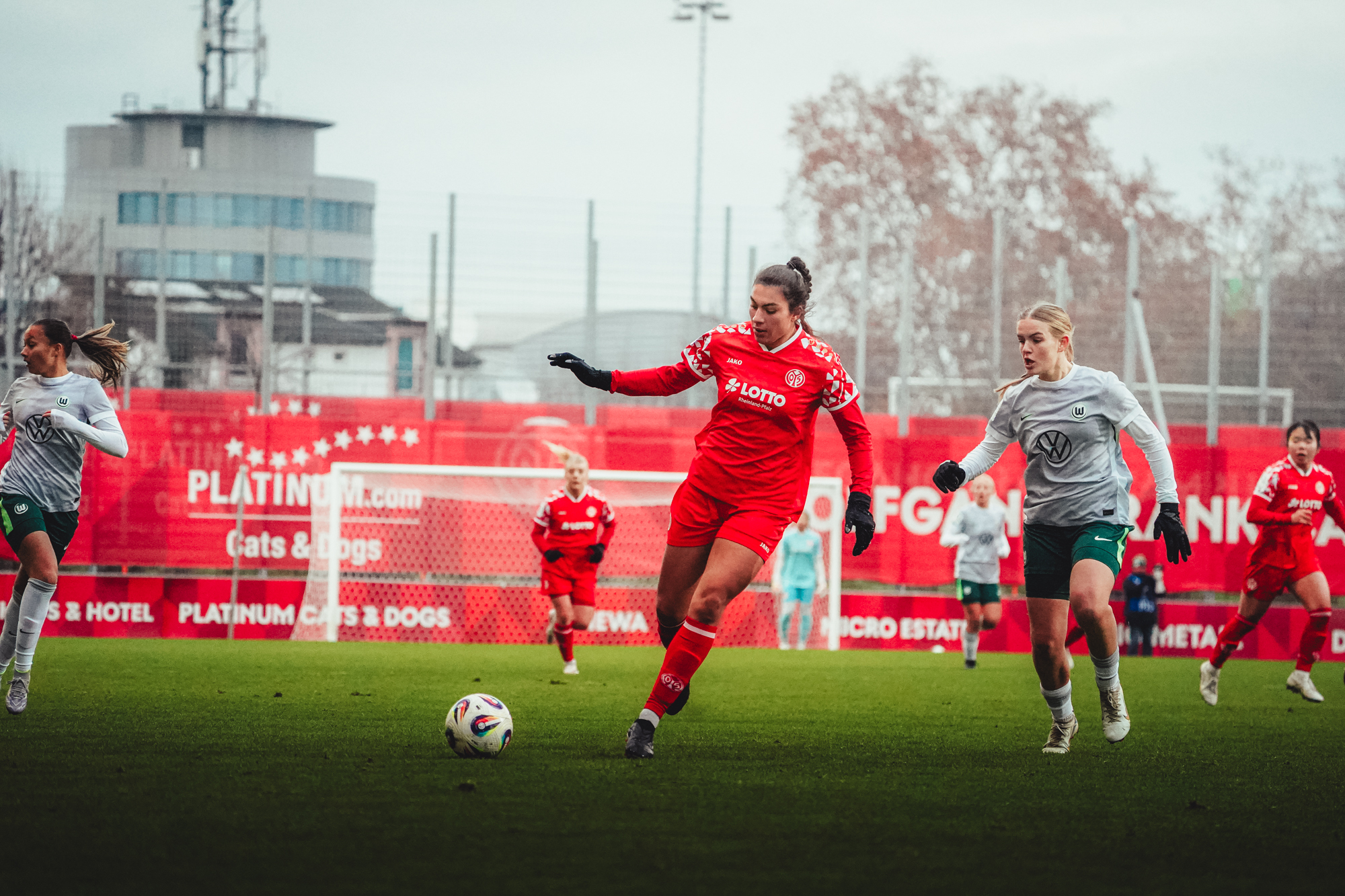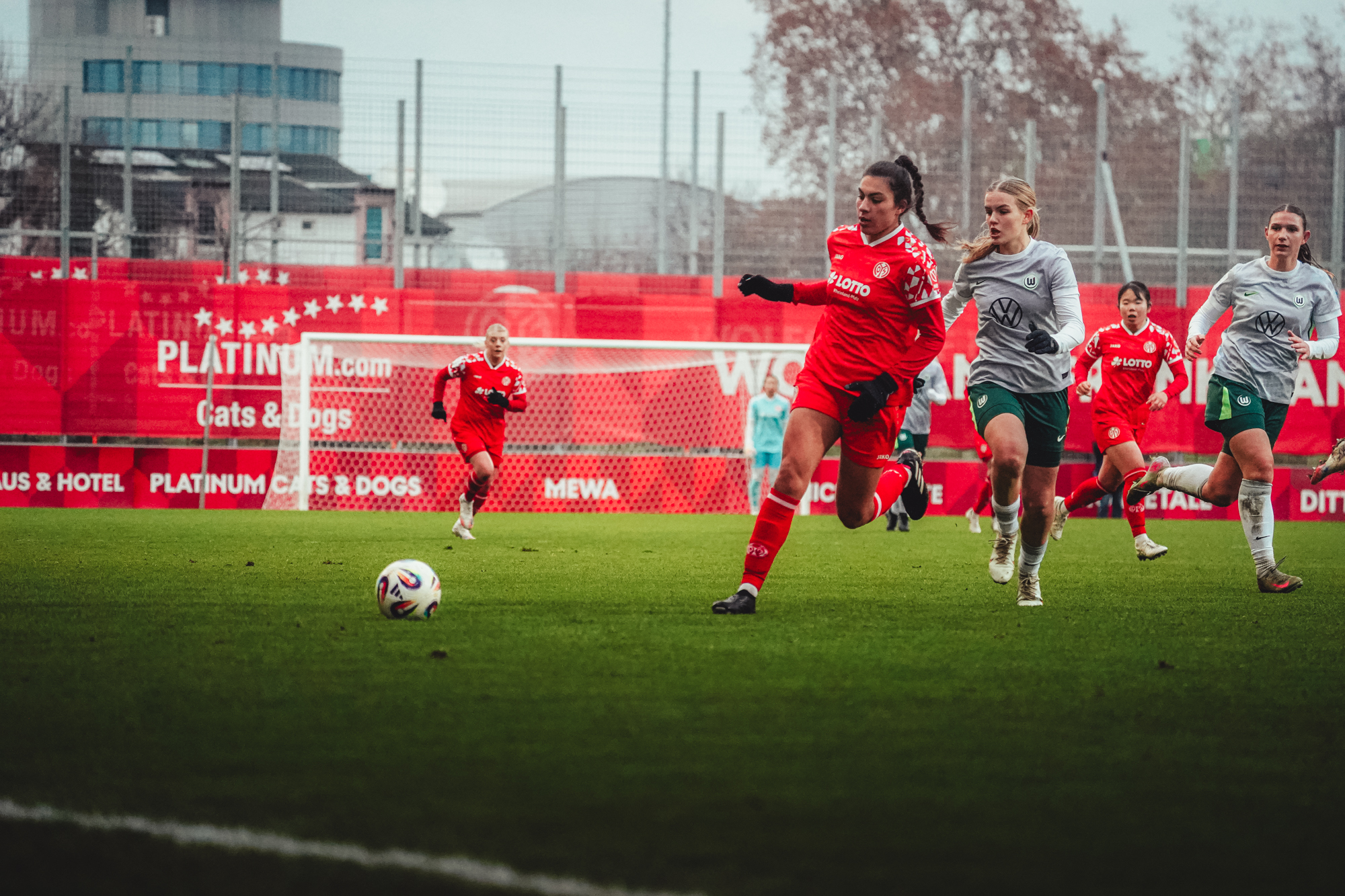 Beide Teams waren von Beginn an auf Betriebstemperatur, was angesichts winterlicher Temperaturen keine schlechte Idee war. So war für beste Unterhaltung gesorgt in den ersten 45 Minuten, in der kaum Zeit zum Durchatmen blieb. Kaum drei Minuten waren gespielt, da stocherte Kurishima den Ball im Nachsetzen zur frühen Führung über die Linie - 1:0 (3.). Bei einem Schuss Junolds aus 18 Metern die zuvor chancenlose Nelly Smolarczyk aber zur Stelle und parierte im Nachfassen (5.). In der Anfangsphase hielten die Wolfsburgerinnen gut dagegen und setzten ihrerseits Nadelstiche: Lisa Beyer prüfte Mamiko Matsumoto als erstes, die 05-Torhüterin war jedoch zur Stelle (7.). In der 14. Minute war dann allerdings auch die Japanerin machtlos. Der VfL hatte über die linke Mainzer Defensiv-Seite leichtes Spiel, Matsumoto konnte gegen Beyers Versuch aus spitzem Winkel zwar noch abwehren, bevor Saelen den Rebound aus vier Metern über die Linie drückte. Ein Nackenschlag, von dem sich die Gastgeberinnen unbeeindruckt zeigten: Denn der FSV, der nach vorne unheimlich druckvoll agierte, hatte die prompte Antwort aber parat. Eine Kurishima-Flanke von links verlängerte Nadine Anstatt im Zentrum aufs Tor, wo Smolarczyk nur abprallen lassen konnte, so dass sich Bouziane bedankte und aus ganz kurzer Distanz die erneute Führung besorgte (17.).