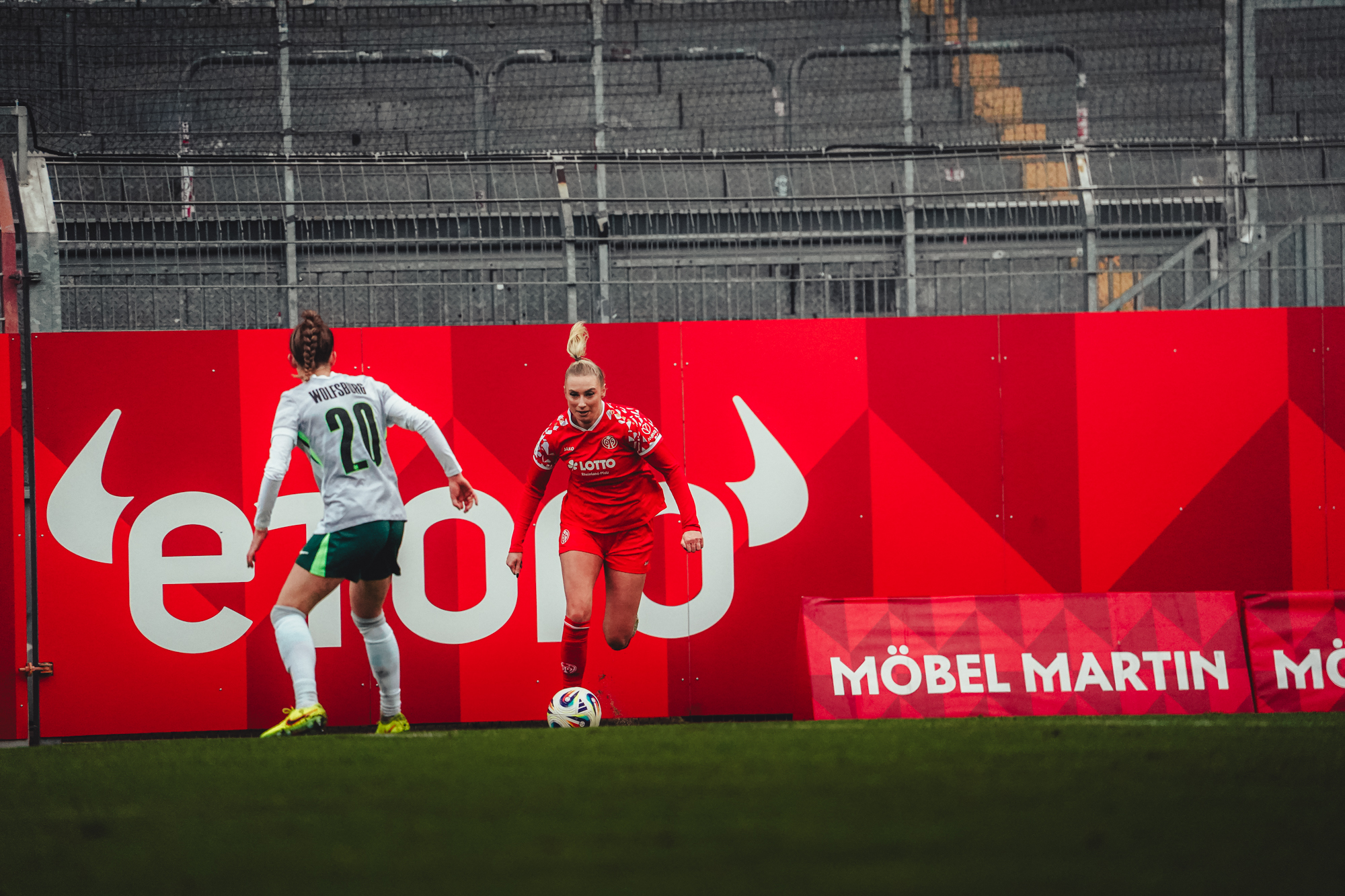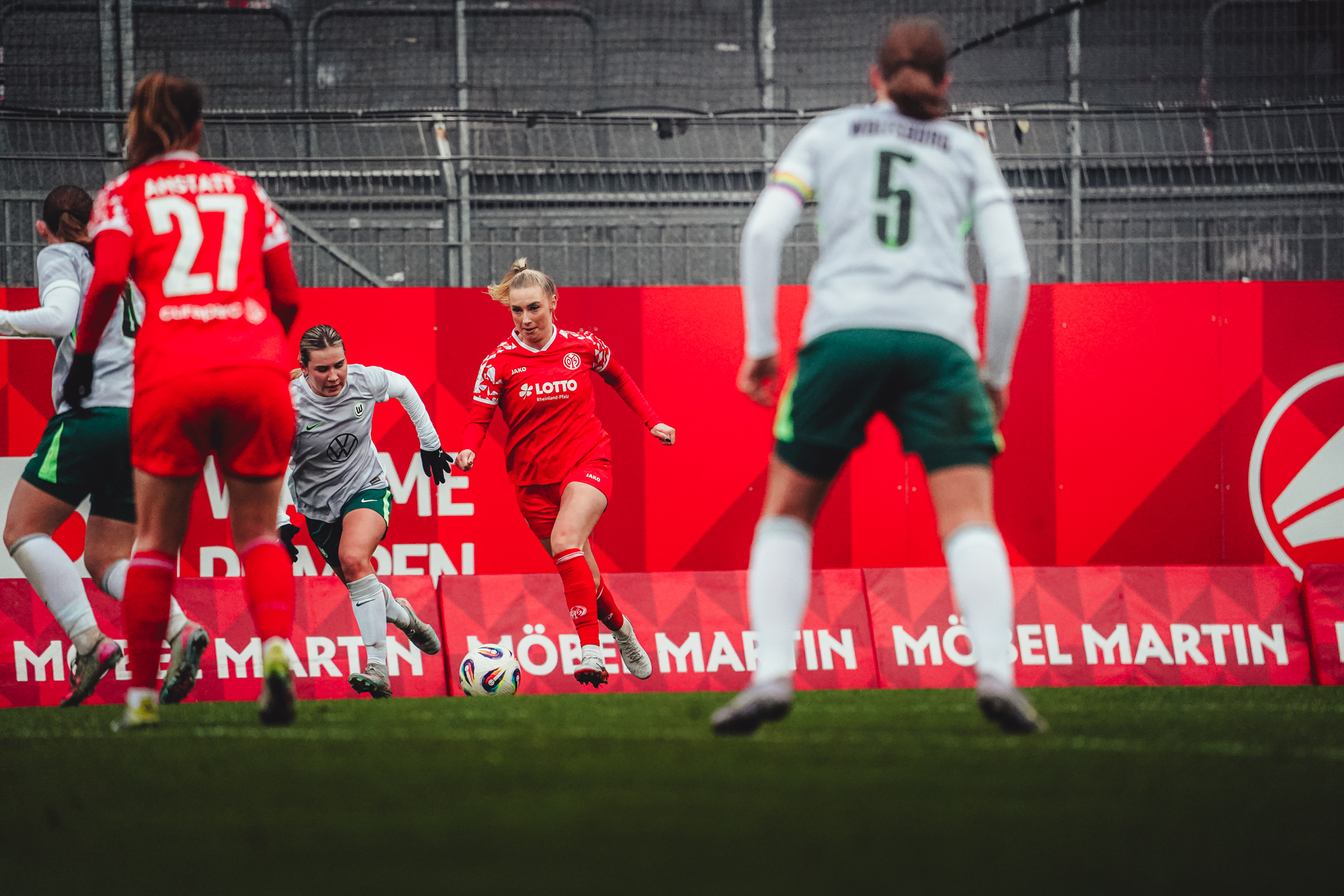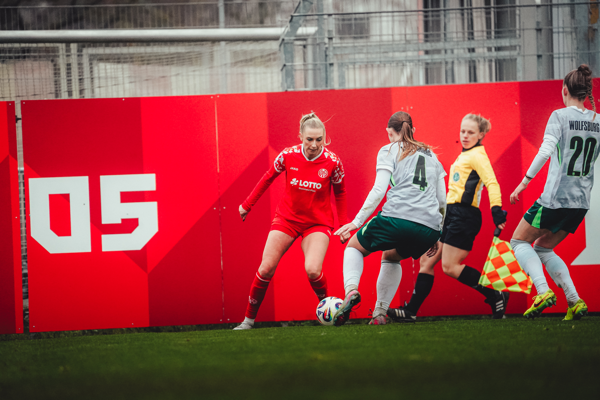 Beide Teams waren von Beginn an auf Betriebstemperatur, was angesichts winterlicher Temperaturen keine schlechte Idee war. So war für beste Unterhaltung gesorgt in den ersten 45 Minuten, in der kaum Zeit zum Durchatmen blieb. Kaum drei Minuten waren gespielt, da stocherte Kurishima den Ball im Nachsetzen zur frühen Führung über die Linie - 1:0 (3.). Bei einem Schuss Junolds aus 18 Metern die zuvor chancenlose Nelly Smolarczyk aber zur Stelle und parierte im Nachfassen (5.). In der Anfangsphase hielten die Wolfsburgerinnen gut dagegen und setzten ihrerseits Nadelstiche: Lisa Beyer prüfte Mamiko Matsumoto als erstes, die 05-Torhüterin war jedoch zur Stelle (7.). In der 14. Minute war dann allerdings auch die Japanerin machtlos. Der VfL hatte über die linke Mainzer Defensiv-Seite leichtes Spiel, Matsumoto konnte gegen Beyers Versuch aus spitzem Winkel zwar noch abwehren, bevor Saelen den Rebound aus vier Metern über die Linie drückte. Ein Nackenschlag, von dem sich die Gastgeberinnen unbeeindruckt zeigten: Denn der FSV, der nach vorne unheimlich druckvoll agierte, hatte die prompte Antwort aber parat. Eine Kurishima-Flanke von links verlängerte Nadine Anstatt im Zentrum aufs Tor, wo Smolarczyk nur abprallen lassen konnte, so dass sich Bouziane bedankte und aus ganz kurzer Distanz die erneute Führung besorgte (17.).