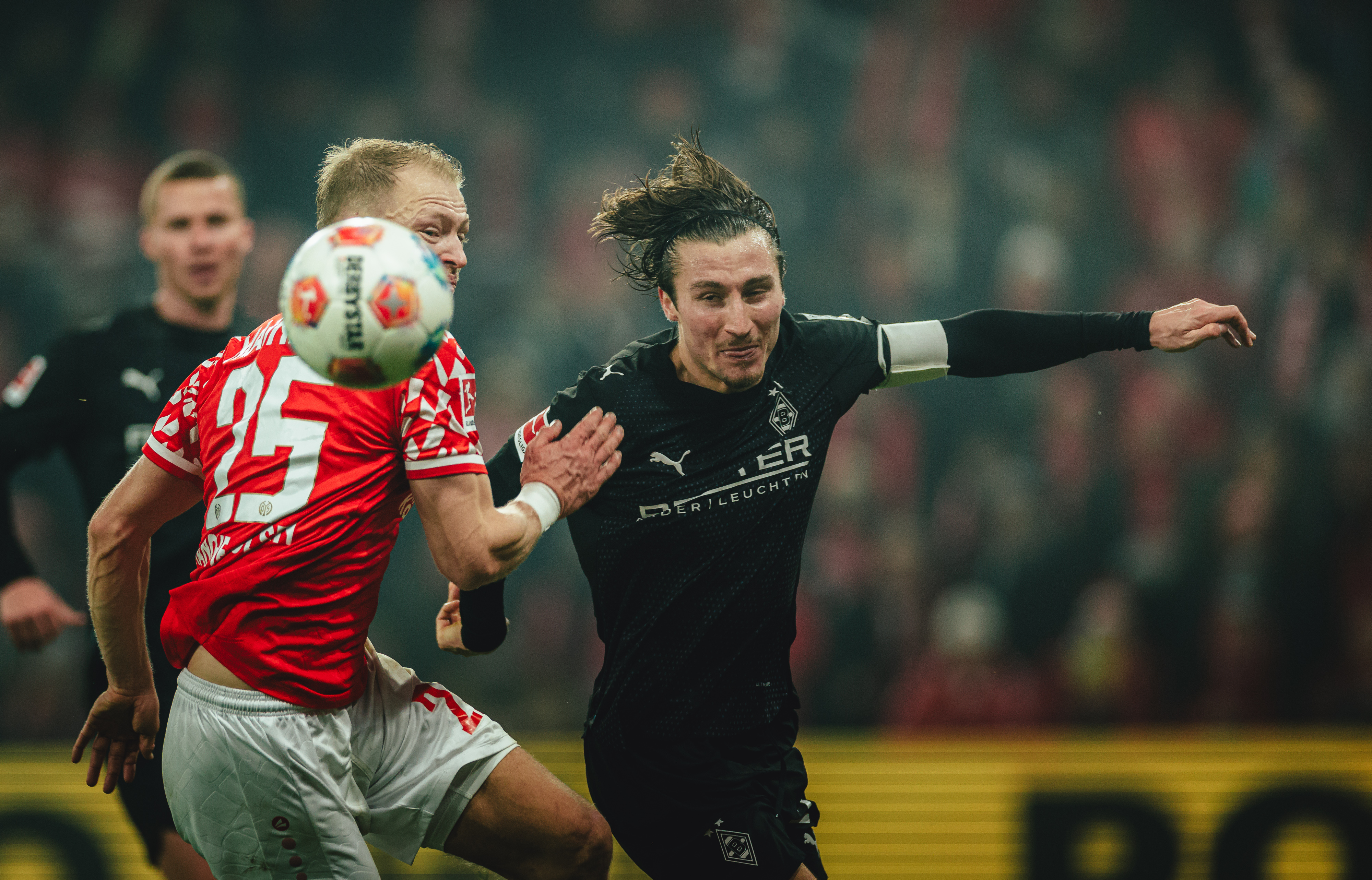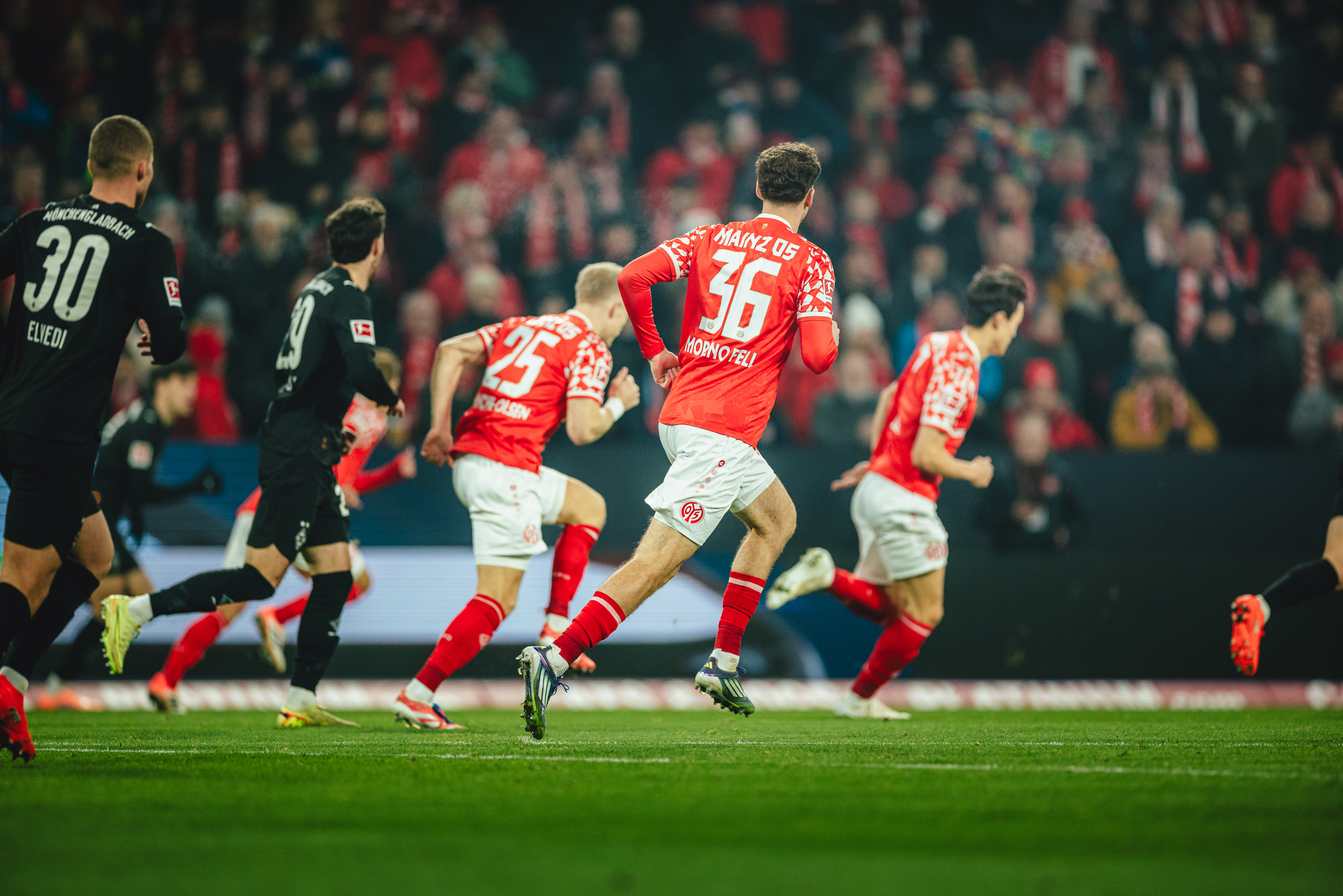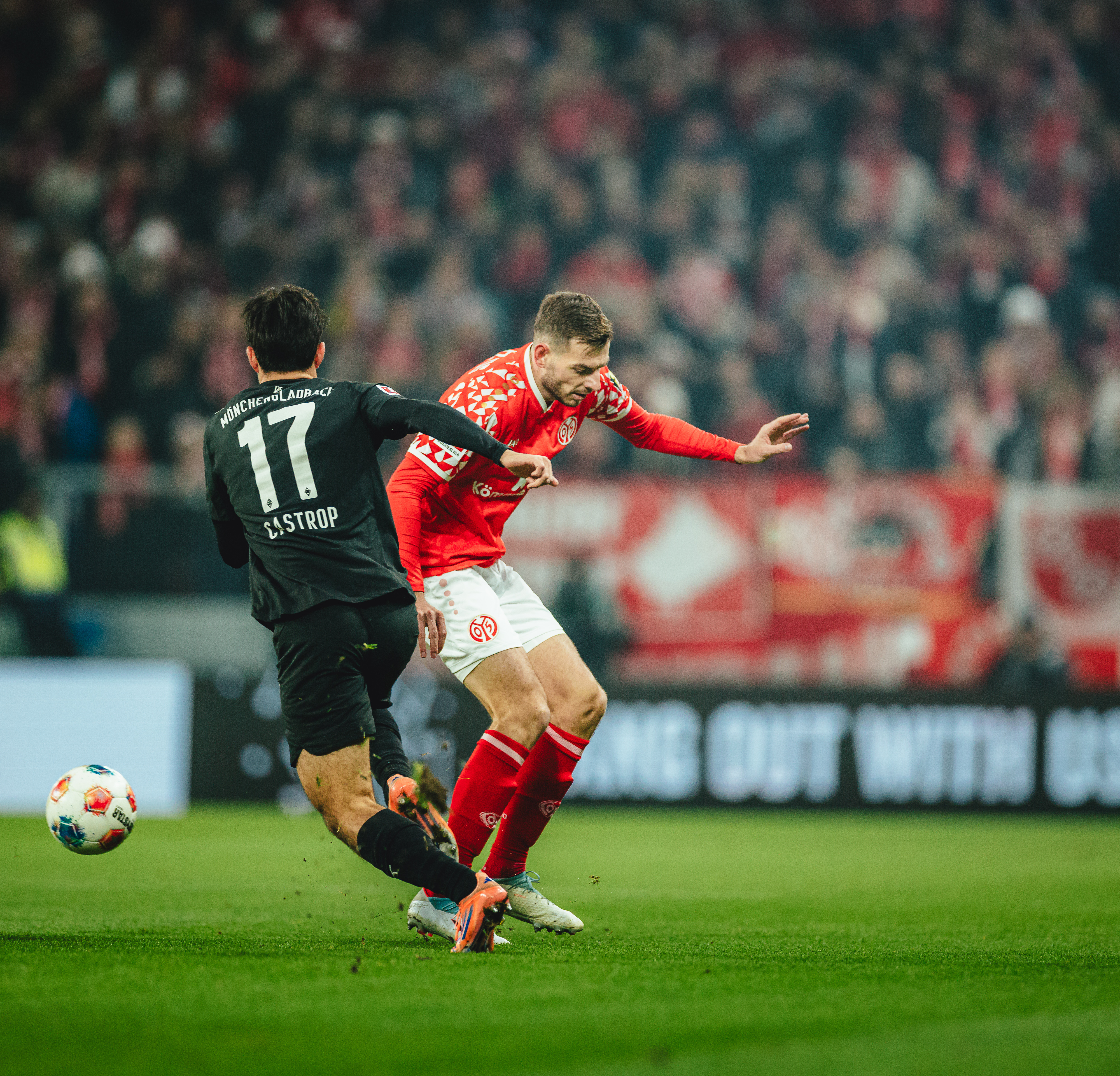 Was sich früh herauskristallisieren sollte, war, dass die Doppelspitze mit Moreno und Weiper die hinterste Fohlen-Reihe beschäftigen sollte an diesem Abend. Konsequent suchten beide die Nähe der Innenverteidiger und lauerten auf Räume. Die Gladbacher, die nach dem Trainerwechsel nicht genau wissen konnten, was sie erwartet, begannen verhaltend und schienen das Geschehen erst einmal beobachten zu wollen. So tat sich in beiden Strafräumen lange wenig in der Anfangsphase. Erst, als die Mainzer im Anschluss an eine eigene Ecke in einen Konter liefen, wurde es das erste Mal so richtig gefährlich. Jens Castrop hatte Batz aus sechs Metern bereits überwunden, doch Leitsch klärte mit dem Kopf Zentimeter vor der Torlinie (16.). Nach dem darauffolgenden Eckstoß folgte dann der vermeintlich ganz große Schock aus 05-Sicht. Haris Tabakovic verlängerte die Hereingabe auf den zweiten Pfosten, wo ausgerechnet Leitsch das Leder per Kopf ins eigene Tor beförderte. Ein Treffer, der letztlich nicht zählen sollte, weil der Videoassistent Benjamin Brand auf ein Handspiel in der Entstehung aufmerksam machte (17.). Es waren Szenen, die der FSV erst einmal verdauen musste. Vier Minuten später kam Tabakovic selbst per Kopf zum Abschluss, verfehlte das 05-Tor aber knapp (21.). Die Verstärkung aus der U23 deutete aber durchaus an, auch in der Bundesliga Akzente setzen zu können.