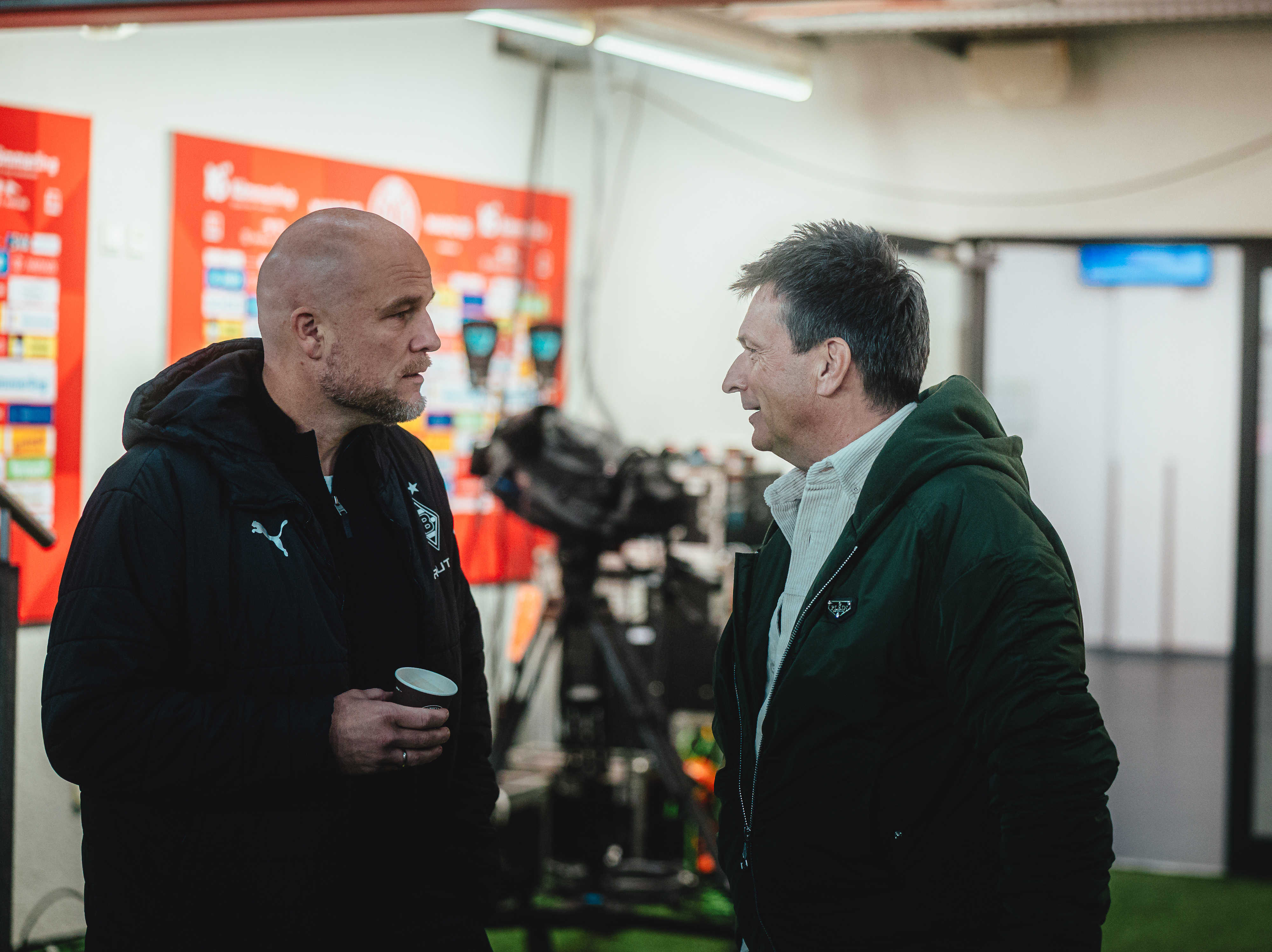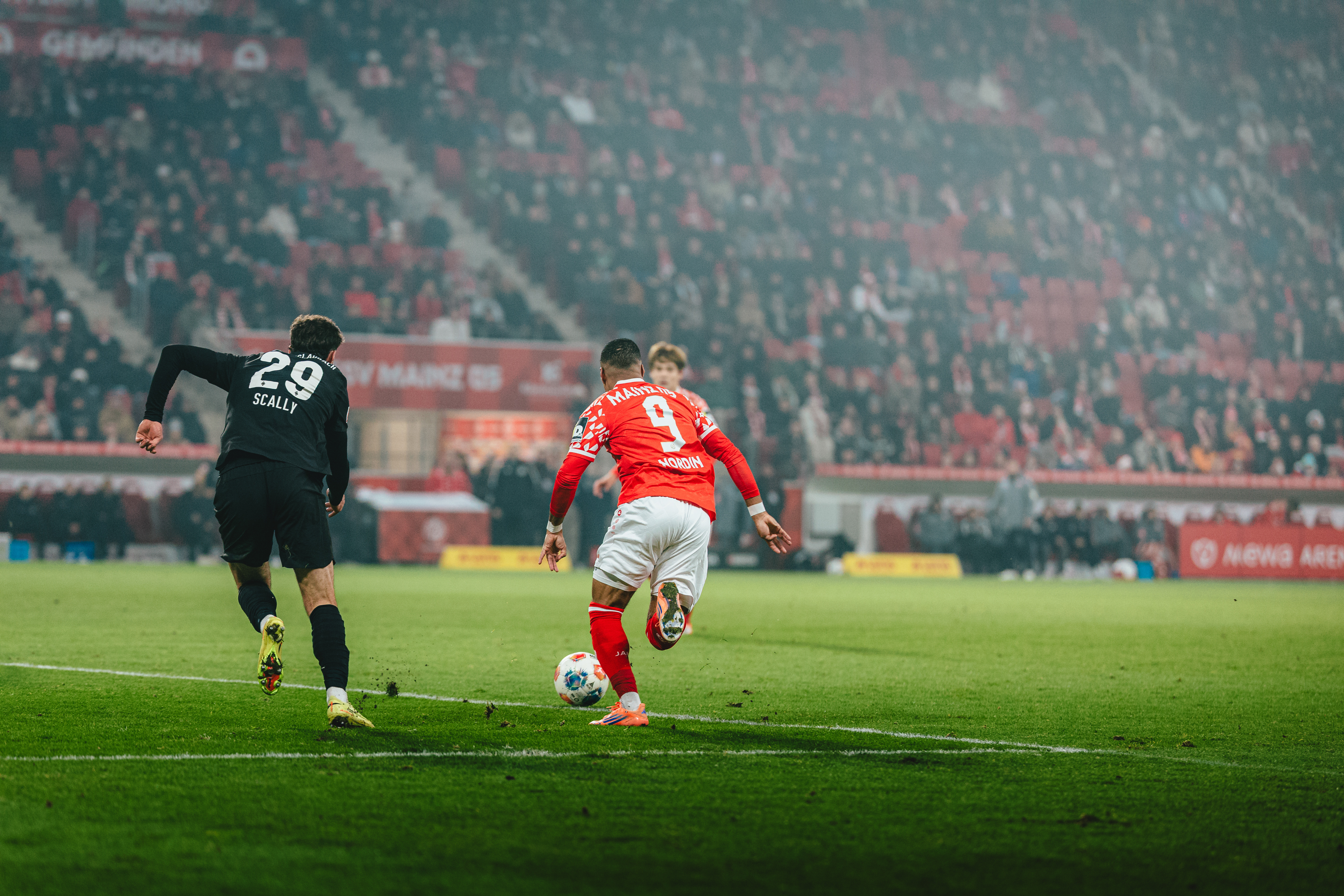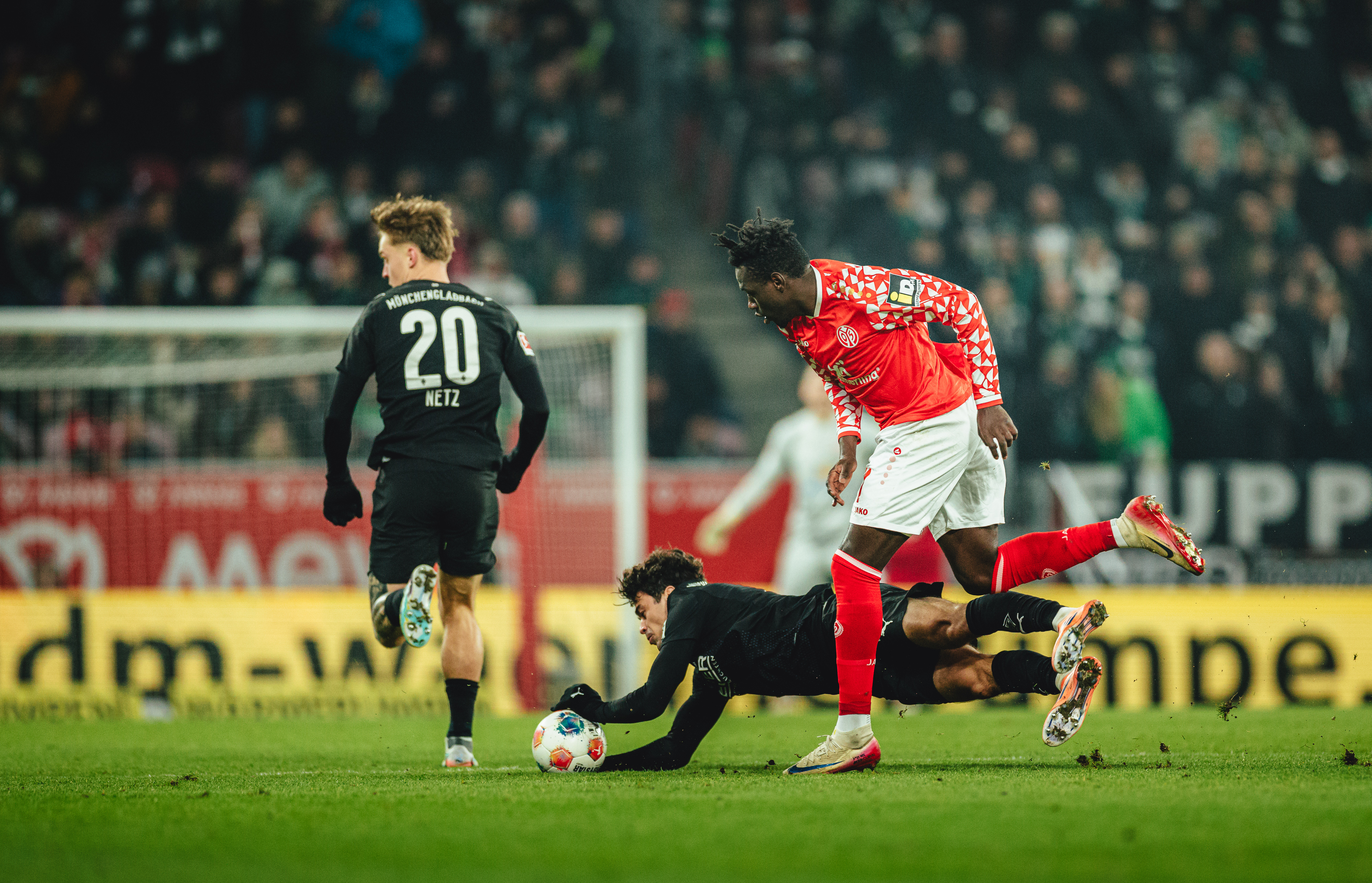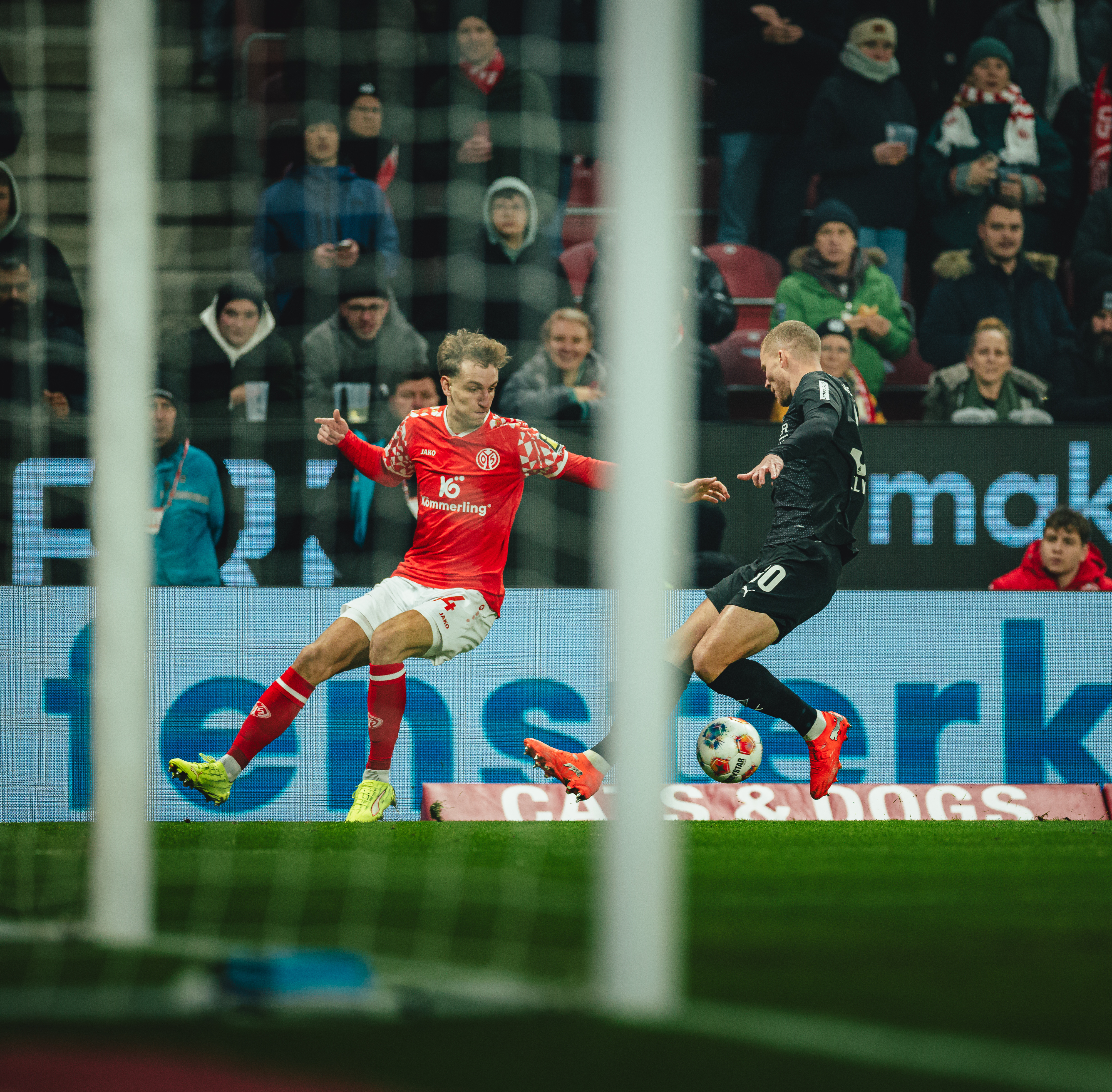 Was sich früh herauskristallisieren sollte, war, dass die Doppelspitze mit Moreno und Weiper die hinterste Fohlen-Reihe beschäftigen sollte an diesem Abend. Konsequent suchten beide die Nähe der Innenverteidiger und lauerten auf Räume. Die Gladbacher, die nach dem Trainerwechsel nicht genau wissen konnten, was sie erwartet, begannen verhaltend und schienen das Geschehen erst einmal beobachten zu wollen. So tat sich in beiden Strafräumen lange wenig in der Anfangsphase. Erst, als die Mainzer im Anschluss an eine eigene Ecke in einen Konter liefen, wurde es das erste Mal so richtig gefährlich. Jens Castrop hatte Batz aus sechs Metern bereits überwunden, doch Leitsch klärte mit dem Kopf Zentimeter vor der Torlinie (16.). Nach dem darauffolgenden Eckstoß folgte dann der vermeintlich ganz große Schock aus 05-Sicht. Haris Tabakovic verlängerte die Hereingabe auf den zweiten Pfosten, wo ausgerechnet Leitsch das Leder per Kopf ins eigene Tor beförderte. Ein Treffer, der letztlich nicht zählen sollte, weil der Videoassistent Benjamin Brand auf ein Handspiel in der Entstehung aufmerksam machte (17.). Es waren Szenen, die der FSV erst einmal verdauen musste. Vier Minuten später kam Tabakovic selbst per Kopf zum Abschluss, verfehlte das 05-Tor aber knapp (21.). Die Verstärkung aus der U23 deutete aber durchaus an, auch in der Bundesliga Akzente setzen zu können.