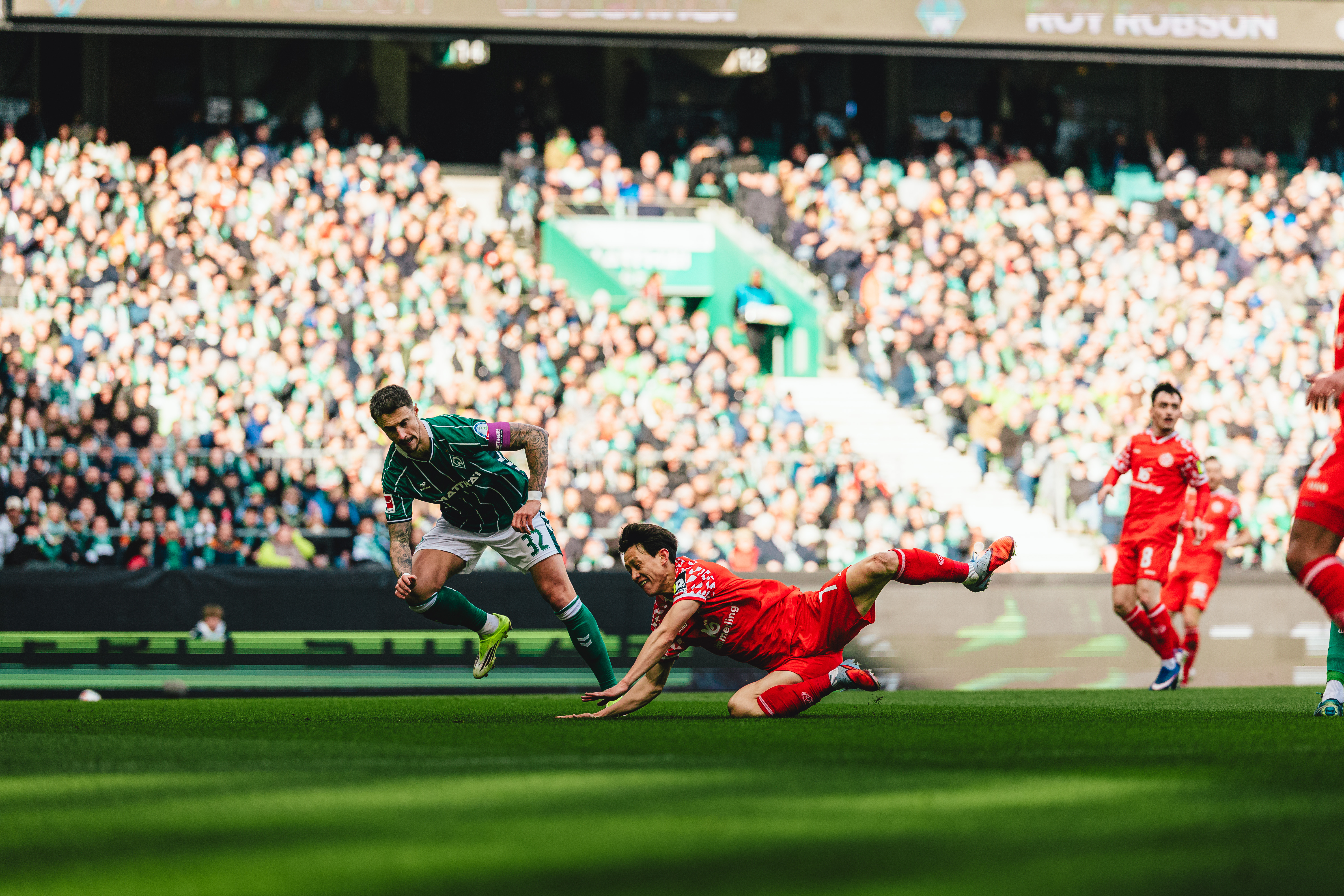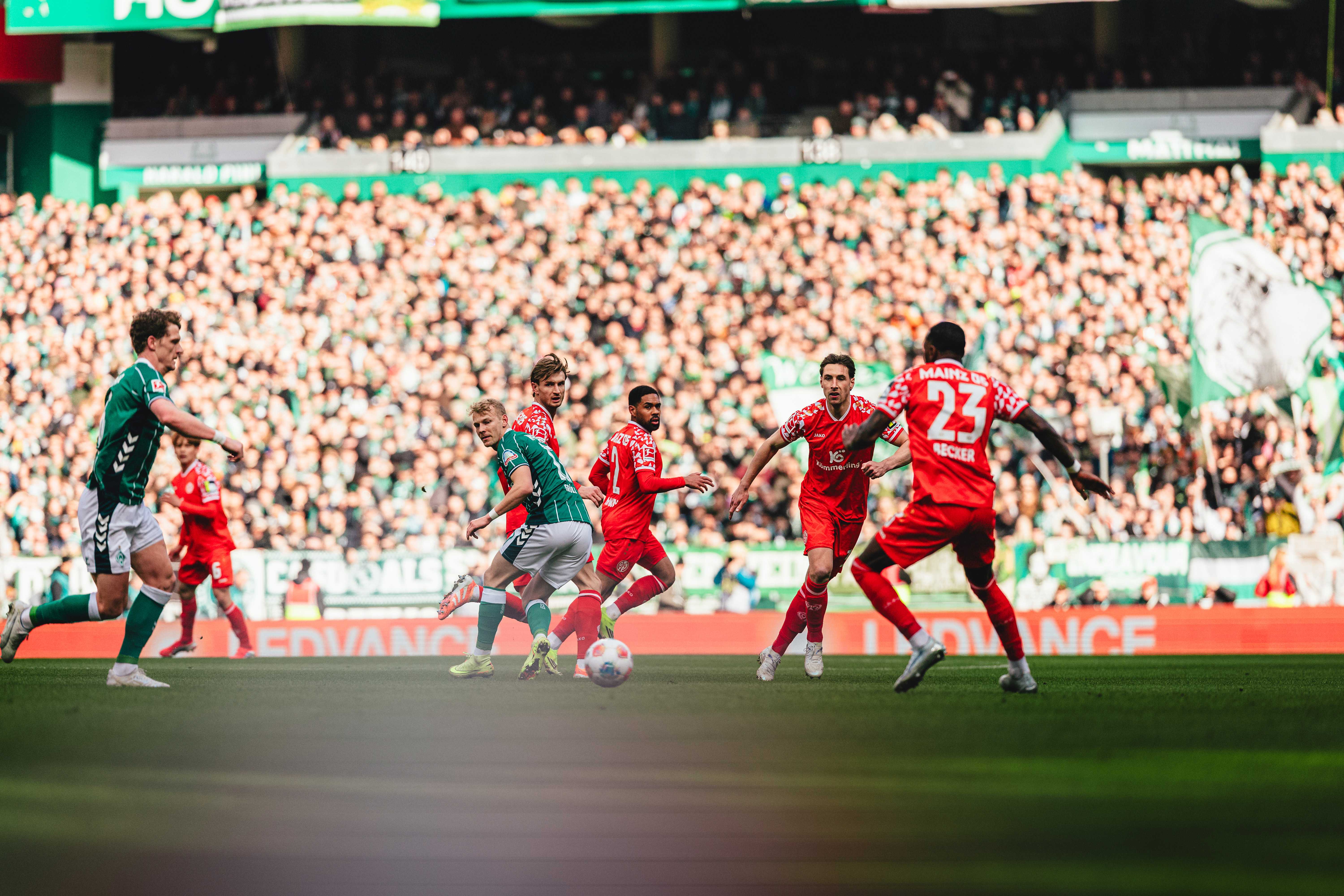 Beide Mannschaften hatten ihre Phasen gehabt, bevor die Begegnung im Anschluss diese Chance etwas verflachte. Bremen war bemüht darum, die Kontrolle zu übernehmen, was aber nur selten gelang. Der FSV stand stabil, war nun zwar weniger aktiv, attackierte aber weiter temporär hoch, so dass die Werderaner stehts auf der Hut sein mussten. Und so tat sich in Teil zwei dieses ersten Durchgangs auch kaum noch Nennenswertes in beiden Strafräumen.