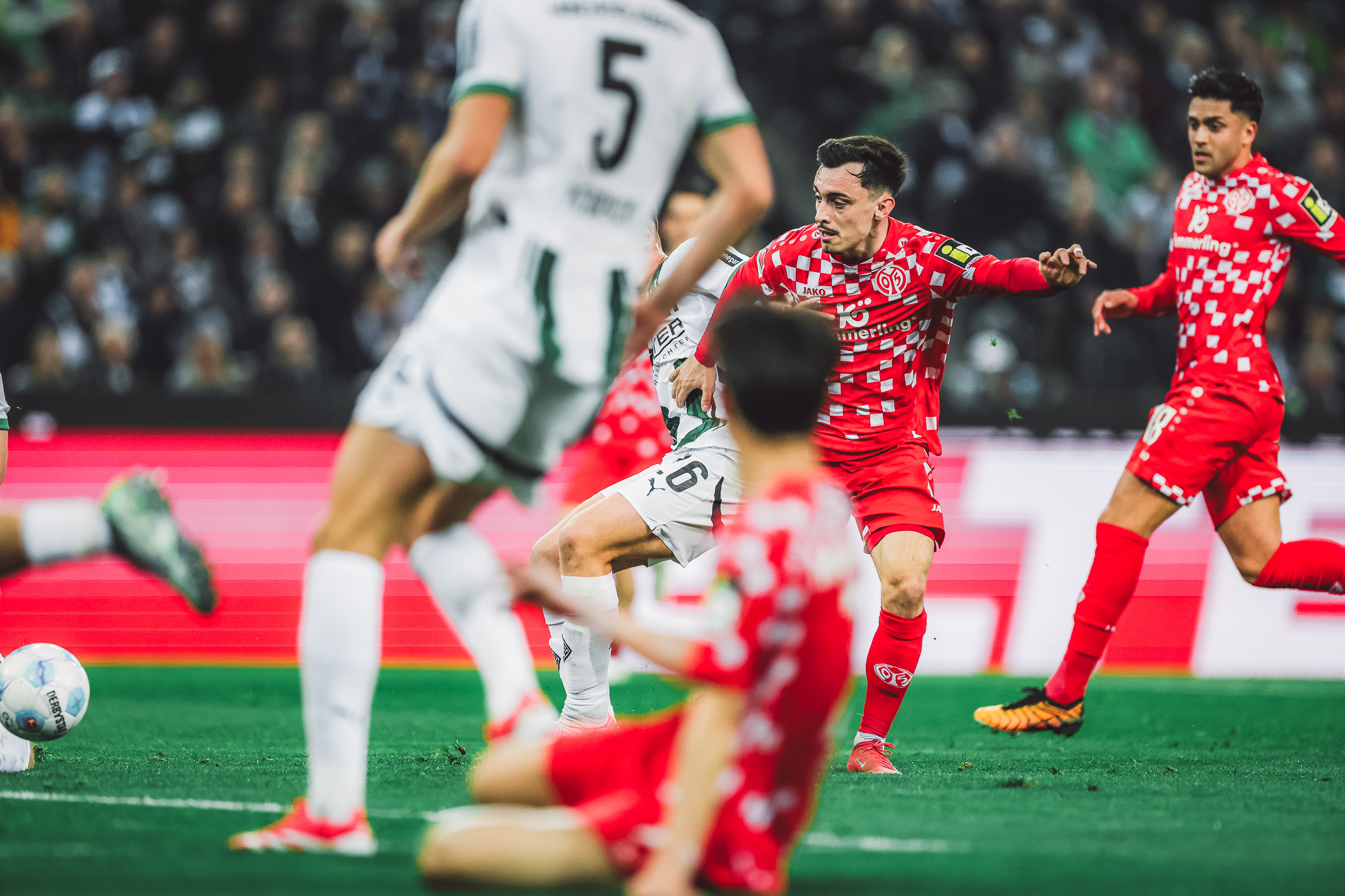 Und die nächste Gelegenheit sollte sich wieder den Gladbachern bieten, die immer aktiver wurden. Diesmal kam Torjäger Kleindienst über links und legte zurück auf den Ex-Mainzer Kevin Stöger, dessen Schuss aus 14 Metern das Tor aber deutlich verfehlte (31.). Der FSV fand in dieser Phase nicht zu seinem Spiel, verlor die Mehrzahl an Zweikämpfen und allen voran entscheidende zweite Bälle, die in dieser Begegnung nicht unbedeutend sein sollten. Jonny Burkardt versuchte es nach 36 Minuten mal von der Strafraumgrenze, so richtig zwingend endete aber auch diese Aktion nicht - Omlin pflückte den abgefälschten Schuss des Nationalspielers sicher. Die Mainzer Geduld mit sich selbst sollte sich dennoch auszahlen. Denn der nächste Angriff der Rheinhessen, die sich in den letzten zehn Minuten vor der Pause wieder fingen, sollte Früchte tragen, und wieder war Burkardt beteiligt: Kaishu Sano hatte den Kapitän im Mittelfeld bedient, der Angreifer schickte Jae-sung Lee auf links tief, die flache Hereingabe des Südkoreaners erreichte den durchstartenden Nebel, der aus zehn Metern zur 05-Führung vollendete (39.). Es war ein äußerst effizienter Auftritt des FSV in diesem ersten Durchgang. Und weil die Rot-Weißen hinten auch bis zum Pausenpfiff von Schiedsrichter Sascha Stegemann nichts mehr anbrennen ließen, nahmen sie den knappen Vorsprung mit in die Katakomben.