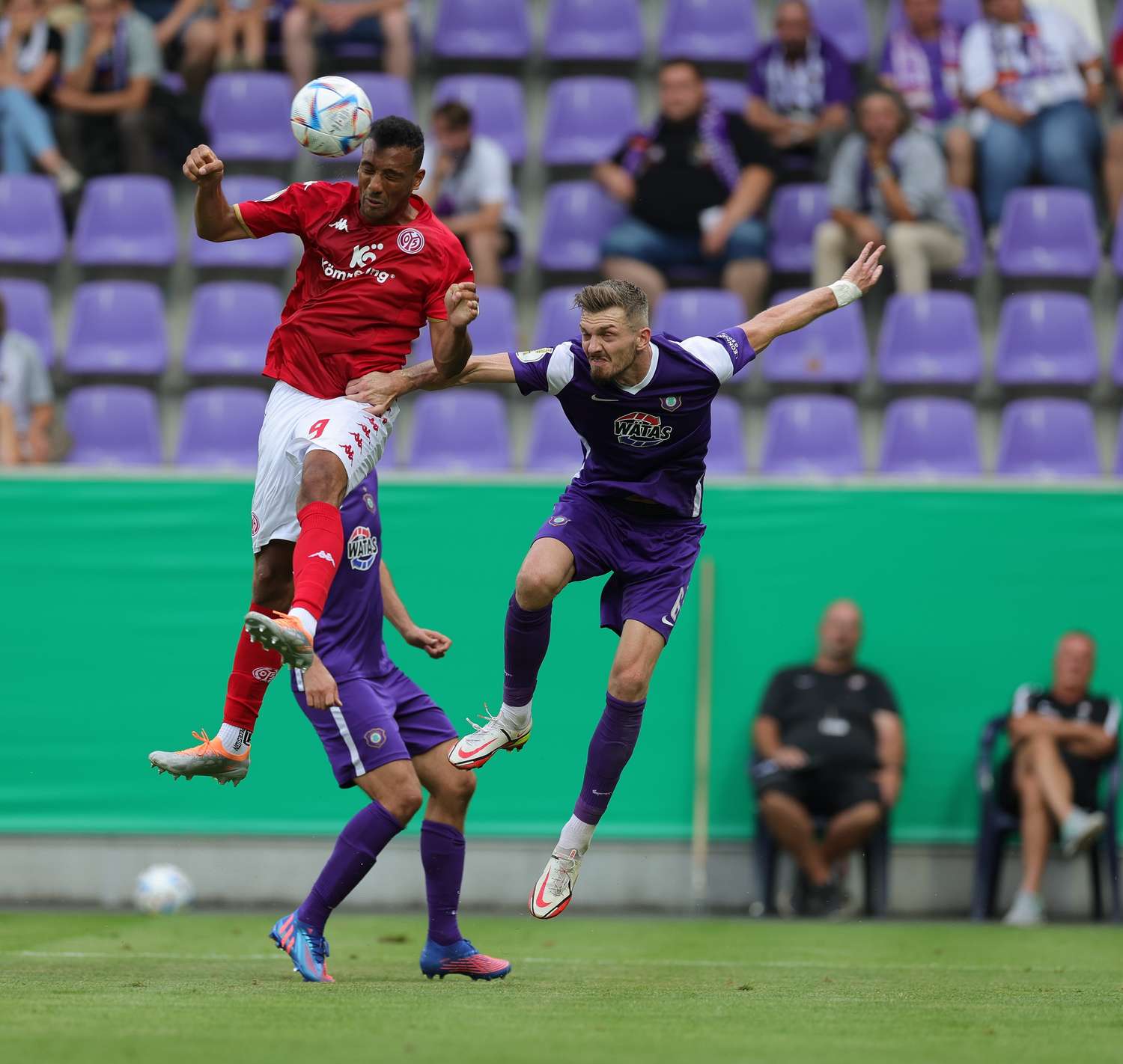 Offensiv mutig legte der Bundesligist los und erspielte sich bereits in den ersten fünf Minuten der Partie gute Möglichkeiten, bei denen allerdings die Präzision fehlte. Zunächst war es Lee, der seinen Schuss aus 15 Metern in halblinker Position verzog. Karim Onisiwos Versuch nach Ablage von Aarón wurde von der Auer Verteidigung noch geblockt, Jonathan Burkardt zielte etwas zu hoch und Aarón verzog ebenfalls deutlich. Ein ordentlicher Start des FSV beim FC Erzgebirge, der in Person von Marvin Stefaniak in Form eines Freistoßes von der Strafraumgrenze erstmals in Erscheinung trat. Gefährlicher wurden dann erneut die 05ER, doch der neue Kapitän Silvan Widmer platzierte seinen Kopfball nach Burkardt-Flanke freistehend aus zehn Metern knapp neben den rechten Pfosten.