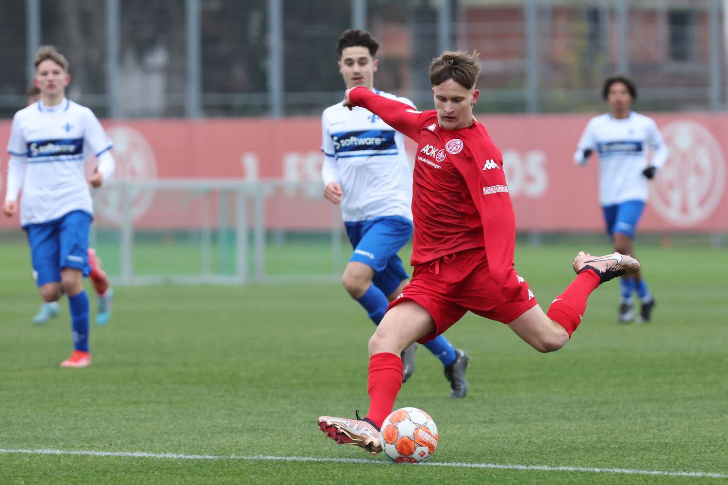 Am Sonntagmittag musste sich die Mainzer U17 im letzten Heimspiel des Jahres dem SV Darmstadt 98 in der B-Junioren-Bundesliga Süd/Südwest mit 0:1 (0:0) geschlagen geben. Das entscheidende Tor für die "Lilien" erzielte Mateo Zelic in der 78. Spielminute im Anschluss an einen Standard. "Wir waren heute nicht klar genug, um ein eigenes Tor zu erzielen. Deswegen ist die Niederlage zwar unglücklich, mehr als ein Unentschieden hätte ich heute aber auch nicht gesehen", resümiert der Mainzer U17-Coach Sören Hartung nach der Partie.