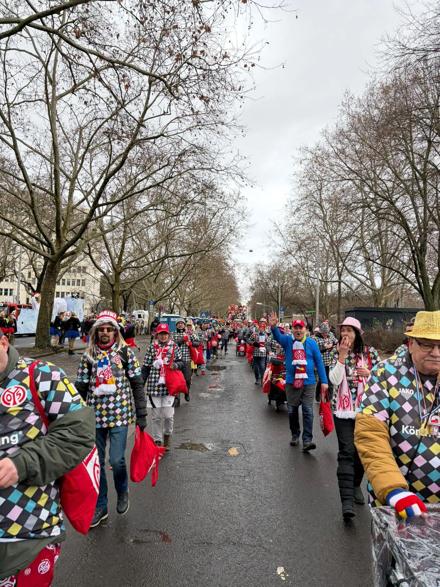 Der diesjährige Rosenmontag zeigte sich wettertechnisch ganz närrisch: Der Morgen begann mit Schnee, später kam die Sonne hervor, und kurz vor dem Finale gab es sogar noch etwas Regen. Doch all das konnte die Stimmung nicht trüben – im Gegenteil. Für die Fanabteilung des 1. FSV Mainz 05 war es einmal mehr ein großartiges Erlebnis, den eigenen Verein als Fußgruppe im Rosenmontagszug zu vertreten.