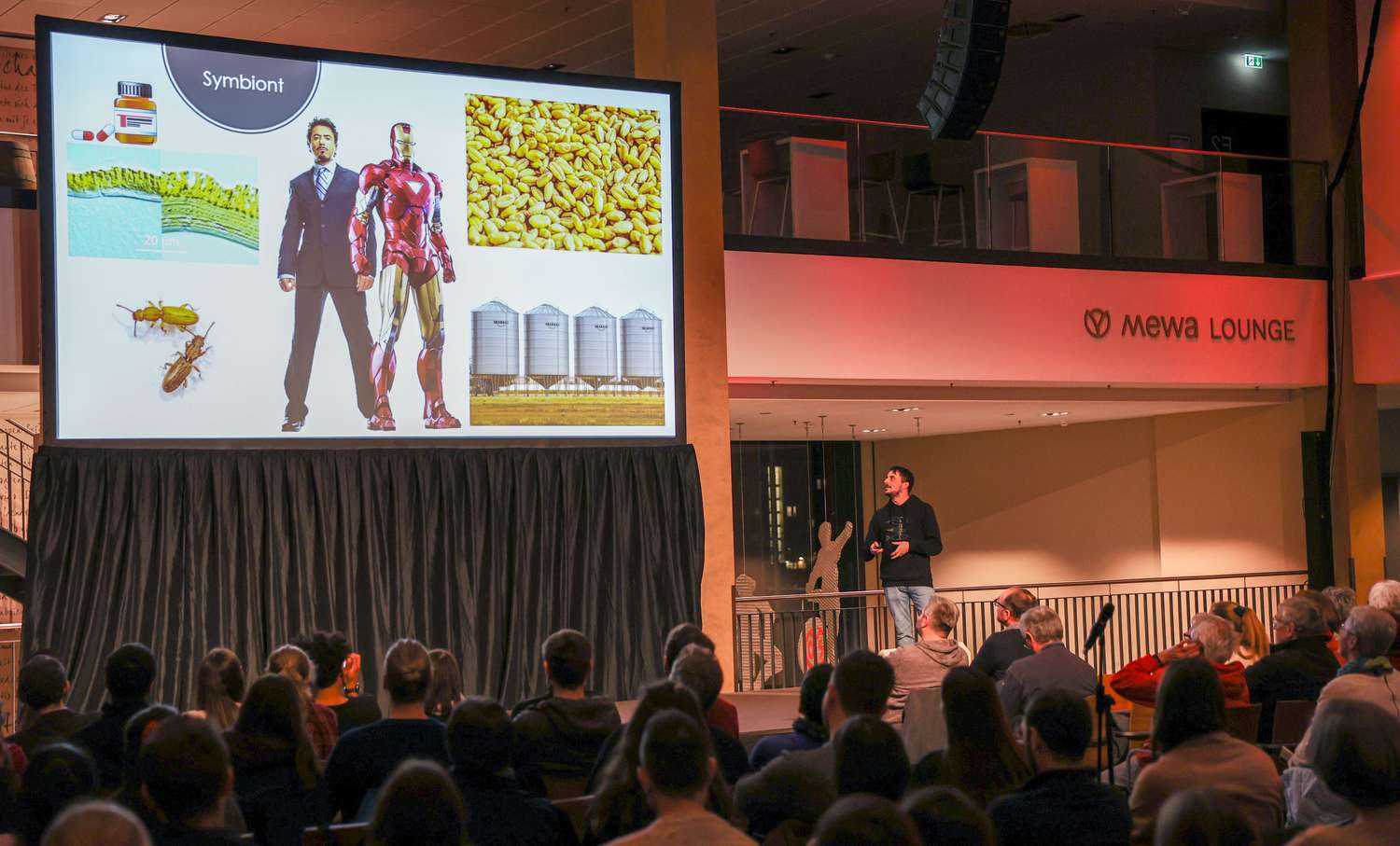 Wie oft kann man nach Wladiwostok fahren, um so viel CO² auszustoßen, wie der Bau der MEWA ARENA verursacht hat? Was hat ein Schokoladenautomat mit Solarzellen zu tun? Sollte man aus der Atmosphäre gebundenes CO² als Kraftstoff nutzen? Warum macht der Mensch aus einem Naturereignis eine Katastrophe? Und weshalb ist Glyphosat die Achillesferse des Getreideplattkäfers? Diese und weitere Fragen wurden von fünf Wissenschaftlerinnen und Wissenschaftlern in jeweils zehnminütigen Powerpoint-Vorträgen zu ihren "ofenfrischen Forschungsprojekten“ (Moderator Rainer Holl) auf der Bühne geklärt.