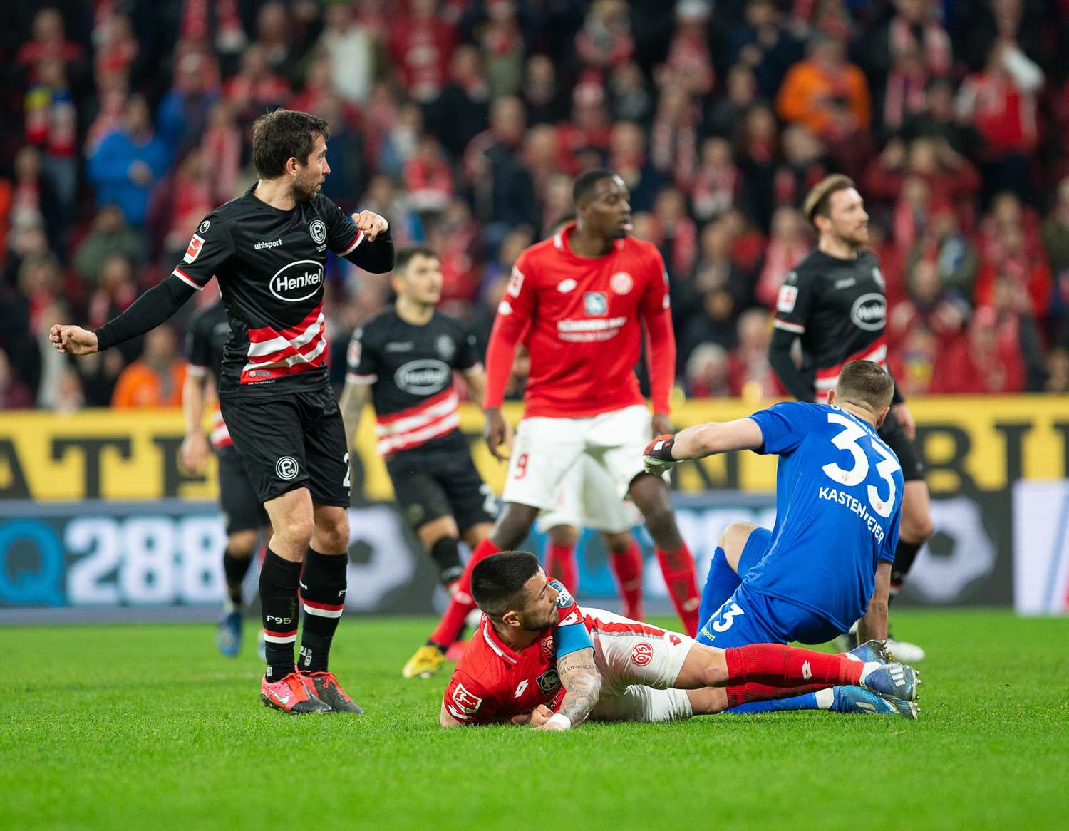 Die erste Gelegenheit bot sich den Gästen, als Markus Suttner nach einem Eckstoß von der Strafraumgrenze frei zum Abschluss kam, aber knapp daneben zielte (3.). Nur rund 60 Sekunden später versuchte es Matthias Zimmermann per Dropkick, doch das Leder landete deutlich über dem Querbalken (4.). Die 05ER waren gewarnt, denn die Fortuna agierte offensiv und hatte in diesen Anfangsminuten mehr vom Spiel. Und so gehörte auch die ersten 100-prozentige Chance den Gästen. Ronaël Pierre-Gabriel verpasste eine Flanke von Kenan Karaman, Erik Thommy tauchte völlig frei vor Robin Zentner auf, verzog aber – Glück für die 05ER (7.). Die Mainzer taten sich äußerst schwer gegen den direkten Konkurrenten. Die Folge: Beierlorzer reagierte früh und stellte auf ein flaches 4-4-2 um, mit Ridle Baku und Robin Quaison auf den Außenpositionen. Offensiv blieb diese Maßnahme zunächst zwar ohne Wirkung, dafür stand der FSV defensiv stabiler, war aber dennoch weiter ein gutes Stück von seiner Normalform entfernt.