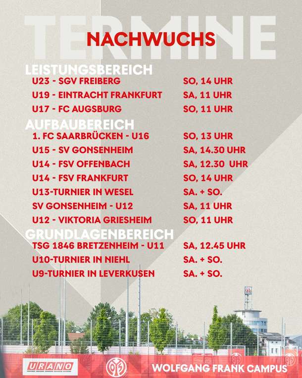 Für die ältesten Mainzer NLZ-Teams von der U23 bis zur U17 stehen am Wochenende Heimspiele auf dem Spielplan. Die U17 empfängt am Sonntag um 11 Uhr den FC Augsburg, ab 14 Uhr ist der SGV Freiberg bei der Mainzer U23 zu Gast. Bereits am Samstag (11 Uhr) lädt die U19 zum Derby gegen Eintracht Frankfurt. Auch für die jüngeren NLZ-Teams stehen in den kommenden Tagen zahlreiche Spiele und Turniere an, hier gibt es die Übersicht: