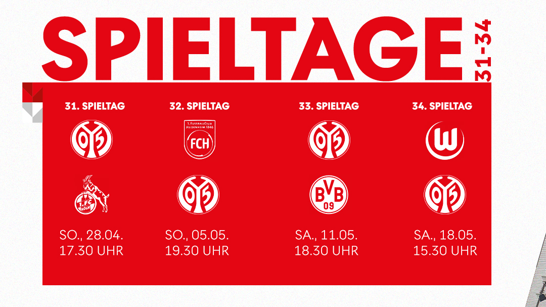 Die Deutsche Fußball-Liga (DFL) hat die letzten vier Spieltage der Bundesliga bis zum Saisonende zeitgenau terminiert. Ihre letzten Heimspiele absolvieren die 05ER am Sonntagnachmittag gegen den 1. FC Köln (28.04., 17:30 Uhr) und am Samstagabend gegen Borussia Dortmund (11.05., 18:30 Uhr). In Heidenheim ist der FSV am späten Sonntagabend (05.05., 19:30 Uhr) zu Gast. Der letzte Spieltag (18.05.), an dem die Rheinhessen zum VfL Wolfsburg reisen, findet für alle Klubs wie gewohnt samstags um 15:30 Uhr statt.