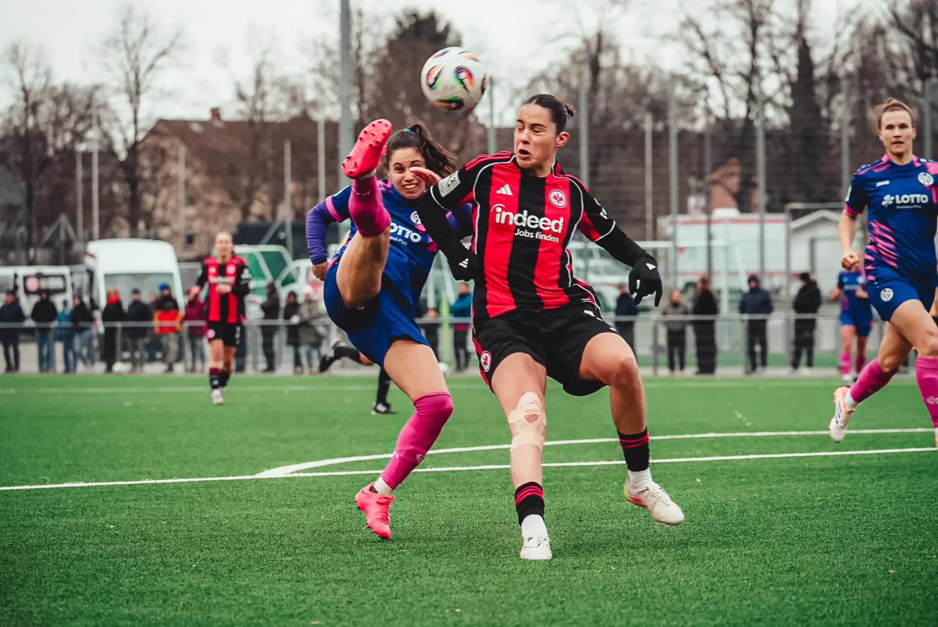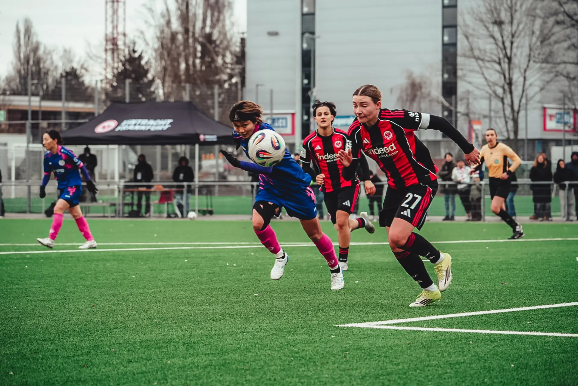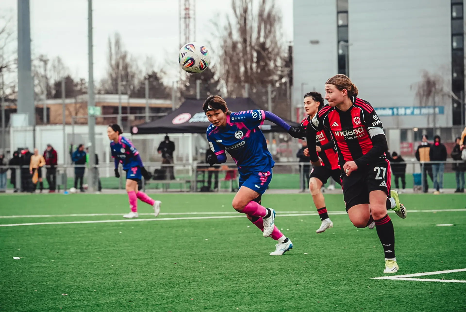 Das Bild der letzten Minuten vor dem Seitenwechsel setzte sich auch mit Beginn der zweiten Halbzeit fort: Die Rheinhessinnen waren die spielbestimmende Mannschaft und übten zunehmend Druck auf die Defensive der Eintracht aus, während die Gastgeberinnen Ballverluste des FSV nutzten, um selbst Offensivaktionen zu starten. Auch Standardsituationen spielten Frankfurt in dieser Phase in die Karten: Nach einem weit getretenen Freistoß kombinierten sich die Adlerträgerinnen in den Strafraum der 05-Frauen vor, wo Tessa Zimmermann aus spitzem Winkel zum Abschluss kam - Mamiko Matsumoto rettete in letzter Distanz für die Gäste (56.). Kurz nach den ersten beiden Wechseln aufseiten der Mainzerinnen - Tamar Goren und Sarah Khalifa wichen für Nadine Anstatt und Christine Kilian, die ihr Pflichtspieldebüt für die erste Frauenmannschaft feierte (beide 64.) - wurde der FSV ebenfalls durch einen Freistoß gefährlich. Vital Kats flankte den Ball von links außen in den Frankfurter Strafraum, wo Emma Junold aus kürzester Distanz zum Schuss kam - ihren Versuch konnte Janne Krumme im Tor der Eintracht jedoch parieren (65.).