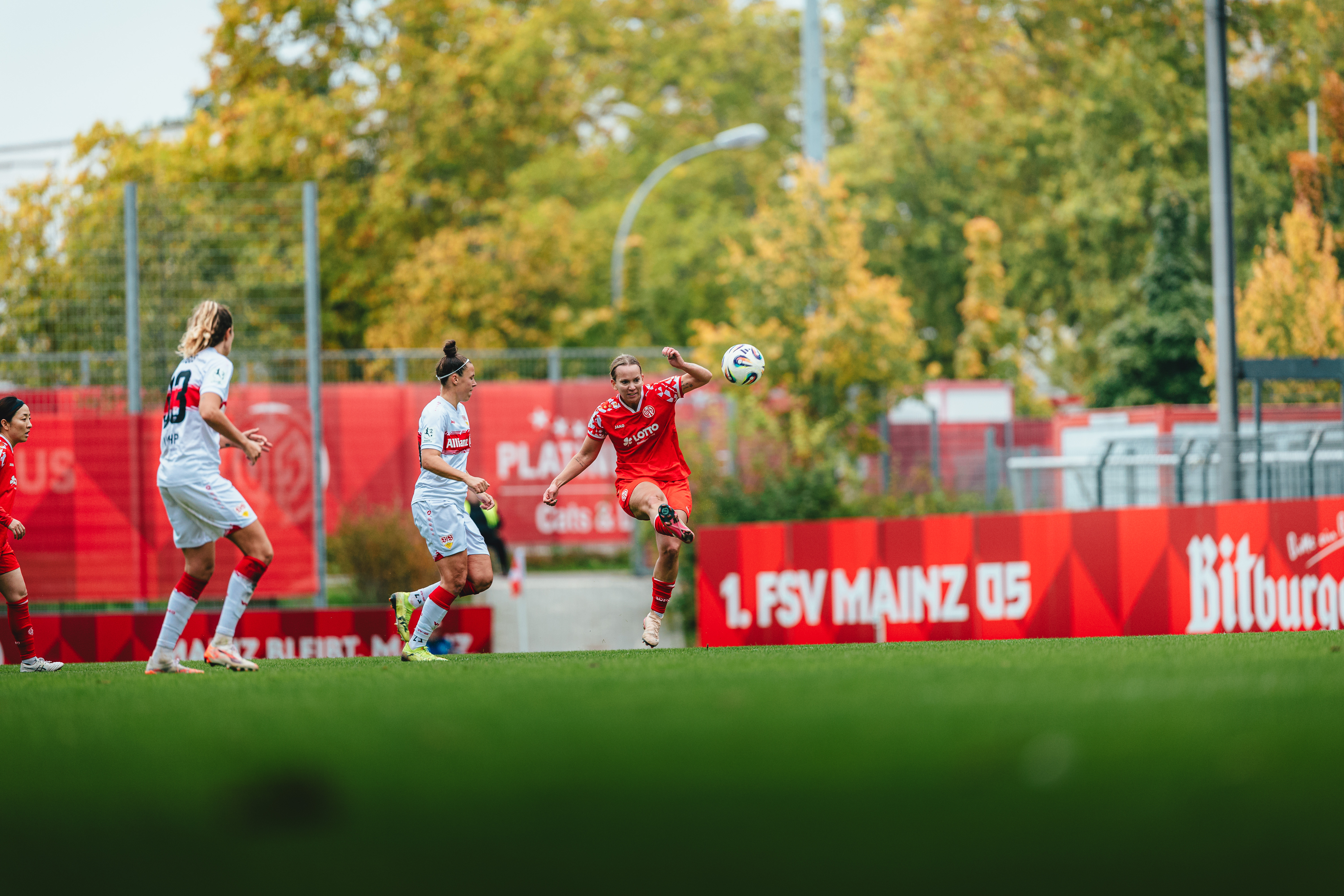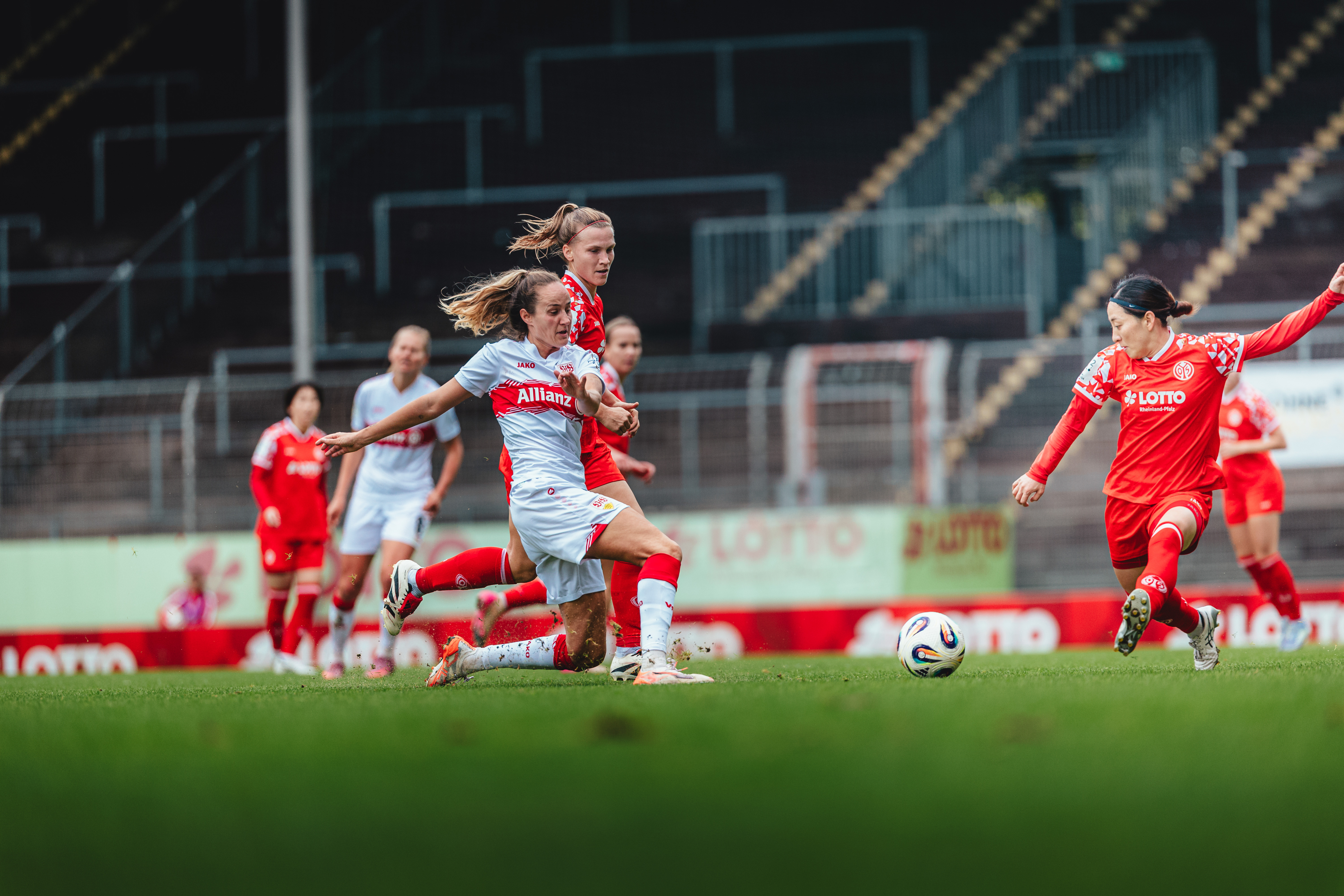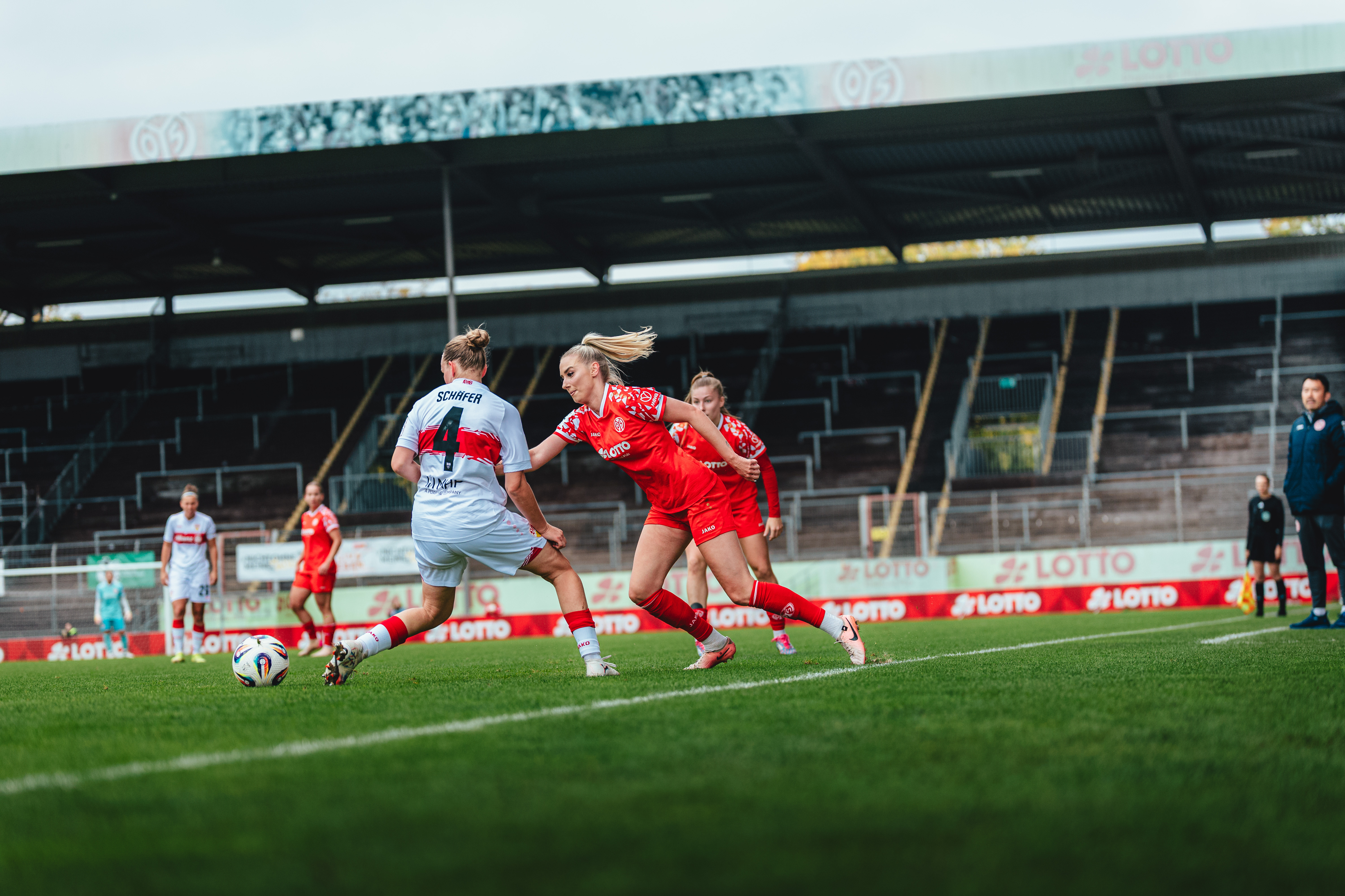 In einem unfassbaren Duell mit dem VfB Stuttgart unterliegen die Mainzerinnen am siebten Spieltag in der 2. Frauen-Bundesliga zuhause mit 4:5 (4:1). Nach einer grandiosen ersten Halbzeit, in der die 05-Frauen höchst konzentriert, griffig und effizient agierten und dank der Tore von Johanna Berg (16.), Nadine Anstatt (20., 30.) sowie Chiara Bouziane (32.) zwischenzeitlich mit 4:0 in Führung lagen, sorgte ein Eigentor der Gastgeberinnen kurz vor dem Pausenpfiff (41.) für einen Funken Hoffnung aufseiten der Stuttgarterinnen. Kurz nach dem Wiederanpfiff bekamen die Schwäbinnen einen Strafstoß zugesprochen, den Nicole Billa eiskalt verwandelte (48.) und die Partie somit wieder offener gestaltete. Nun mit mehr Selbstvertrauen im Rücken wurde der VfB mutiger und drückte auf ein weiteres Tor, welches Maximiliane Rall schließlich erzielte (73.). Kurz darauf sorgte eine Gelb-Rote Karte gegen Maja Pageler für eine Mainzer Unterzahl, die Stuttgart ausnutzte: Auf das 4:4 durch Linette Hofmann (82.) folgte tief in der Nachspielzeit tatsächlich das 4:5 durch die eingewechselte Rosa Rückert (90. +4), was gleichbedeutend mit dem Endstand war.