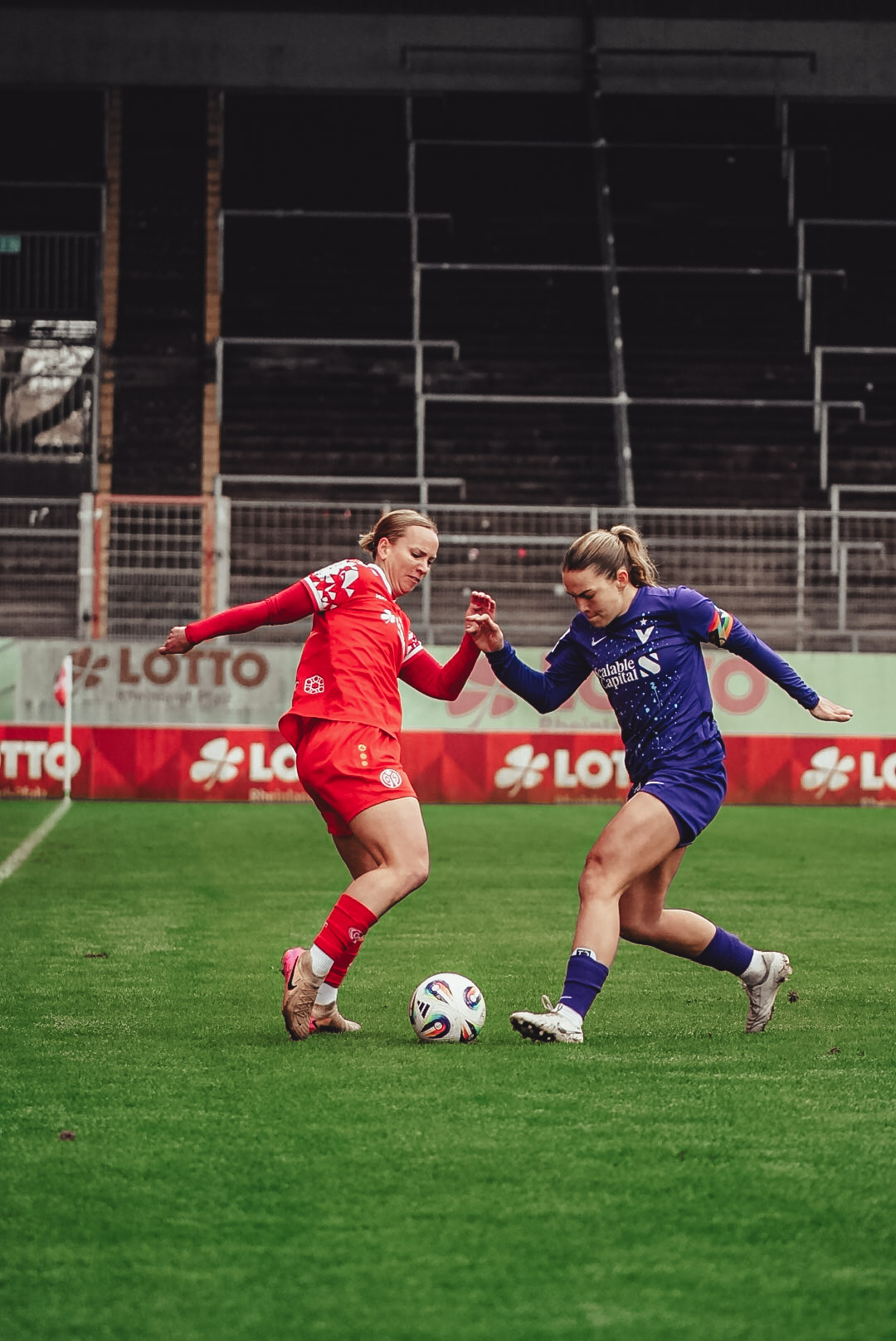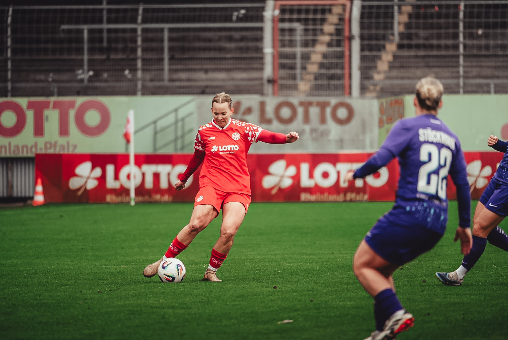 Die erste gefährliche Ecke des Spiels hatten die Berlinerinnen in der 36. Minute. Kurz darauf konnte Kats im Strafraum einer Abwehrspielerin der Gäste aus dem Hinterhalt den Ball abnehmen und kam selbst zum Abschluss – doch Torhüterin Wagner parierte (38.). Den darauffolgenden Konter vereitelten die 05ERINNEN souverän. Kurz vor dem Halbzeitpfiff kam Kats erneut aus einer sehr guten Freistoßposition nicht an der Berliner Mauer vorbei (45.+2). Torlos gingen beide Mannschaften in die Kabinen.