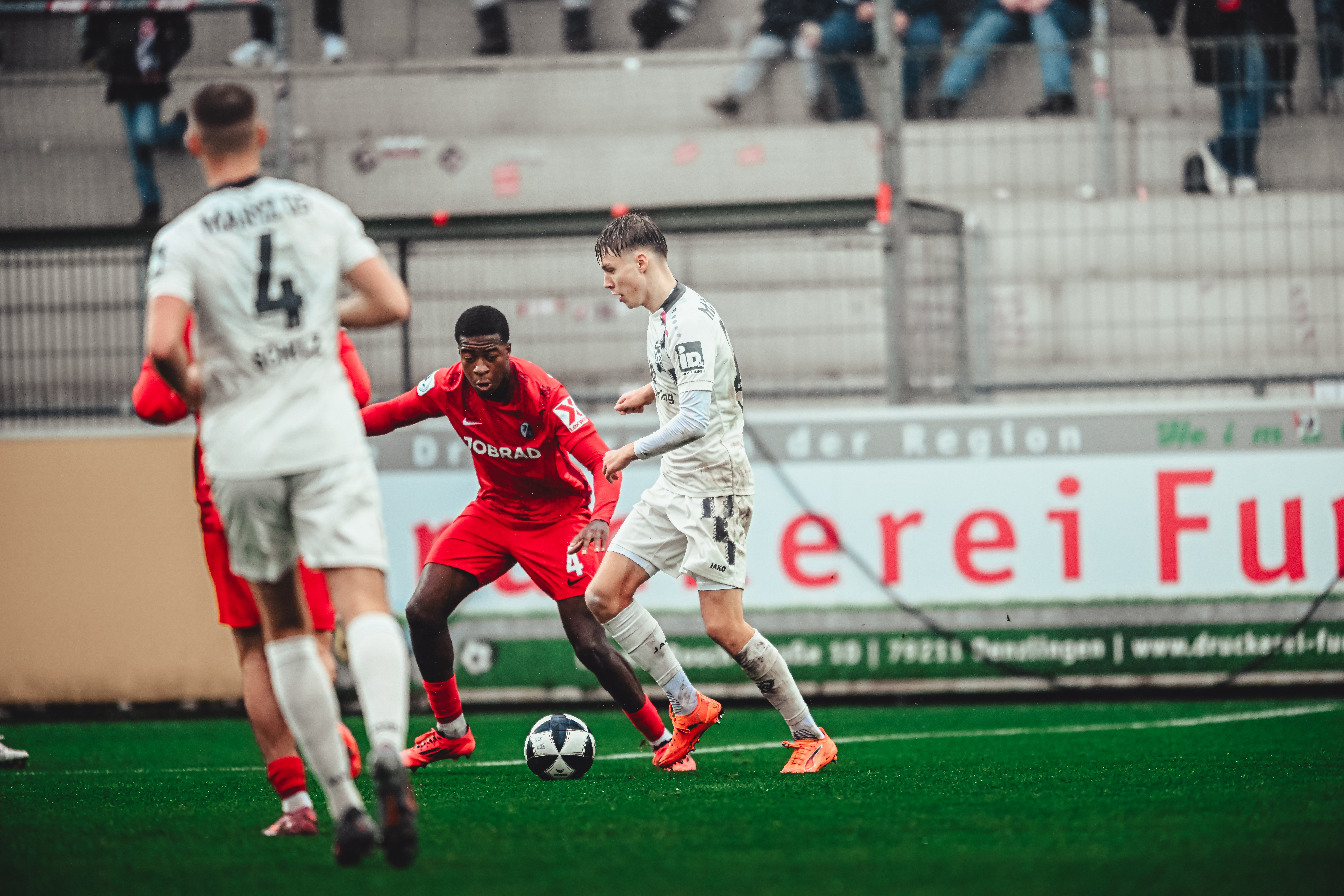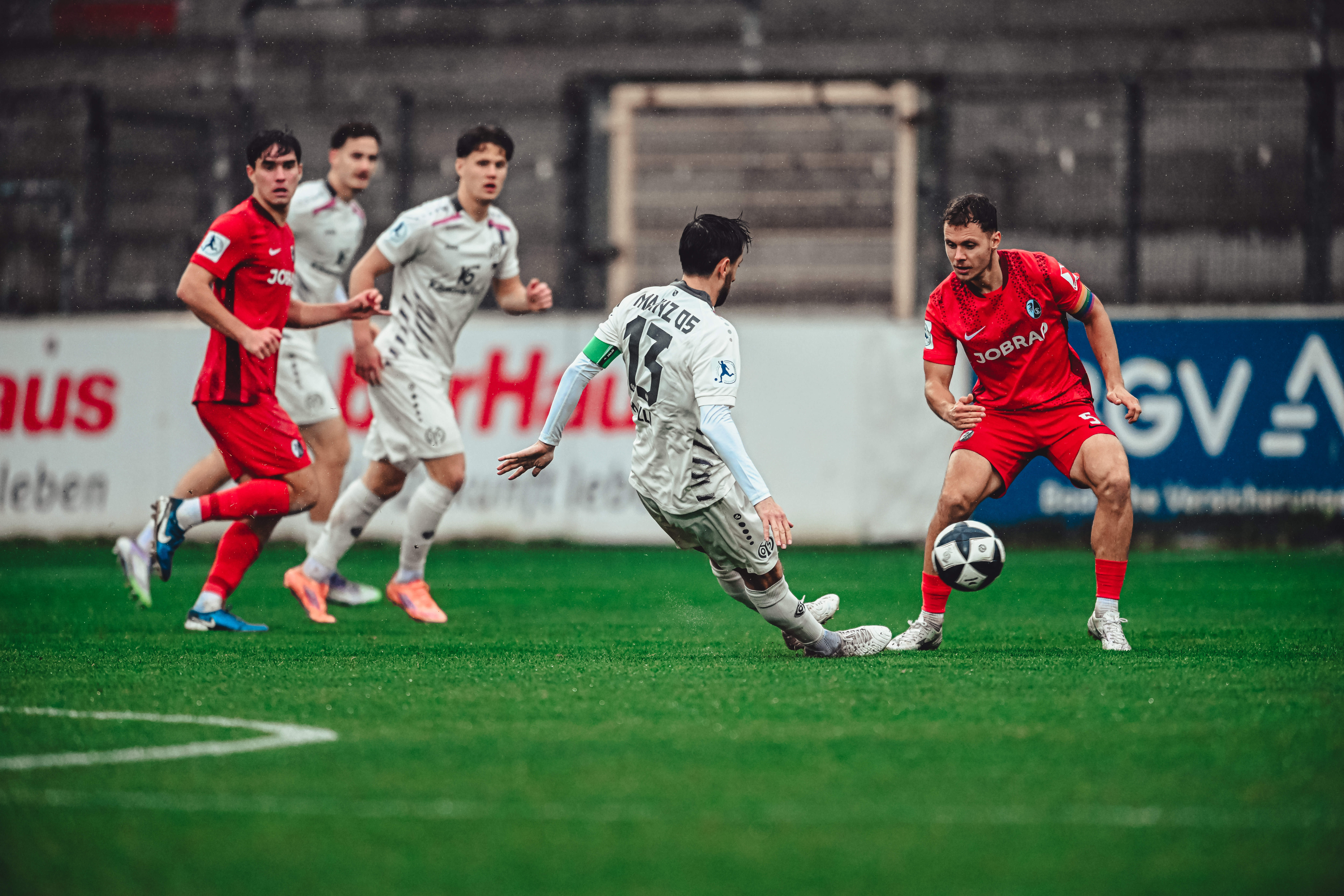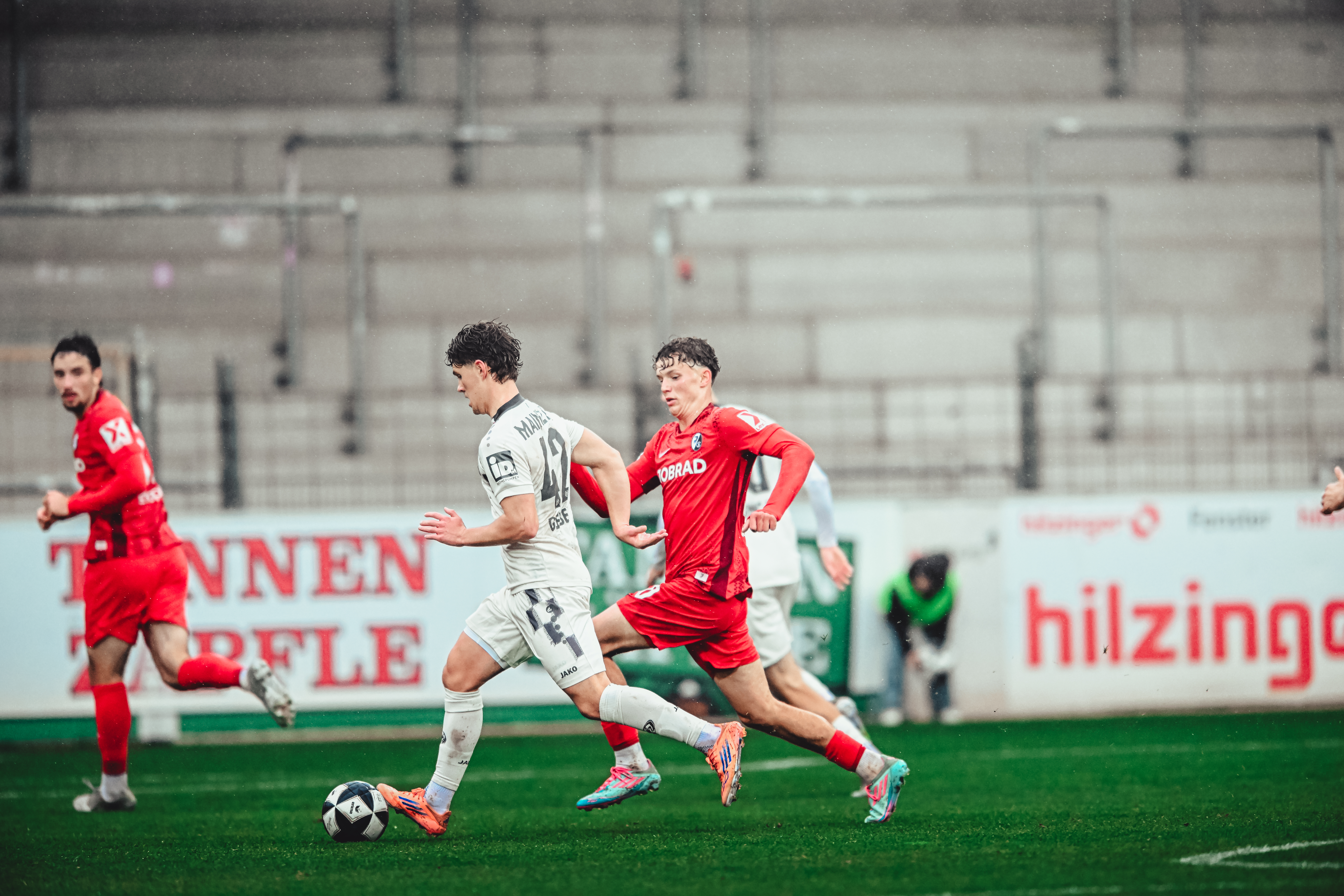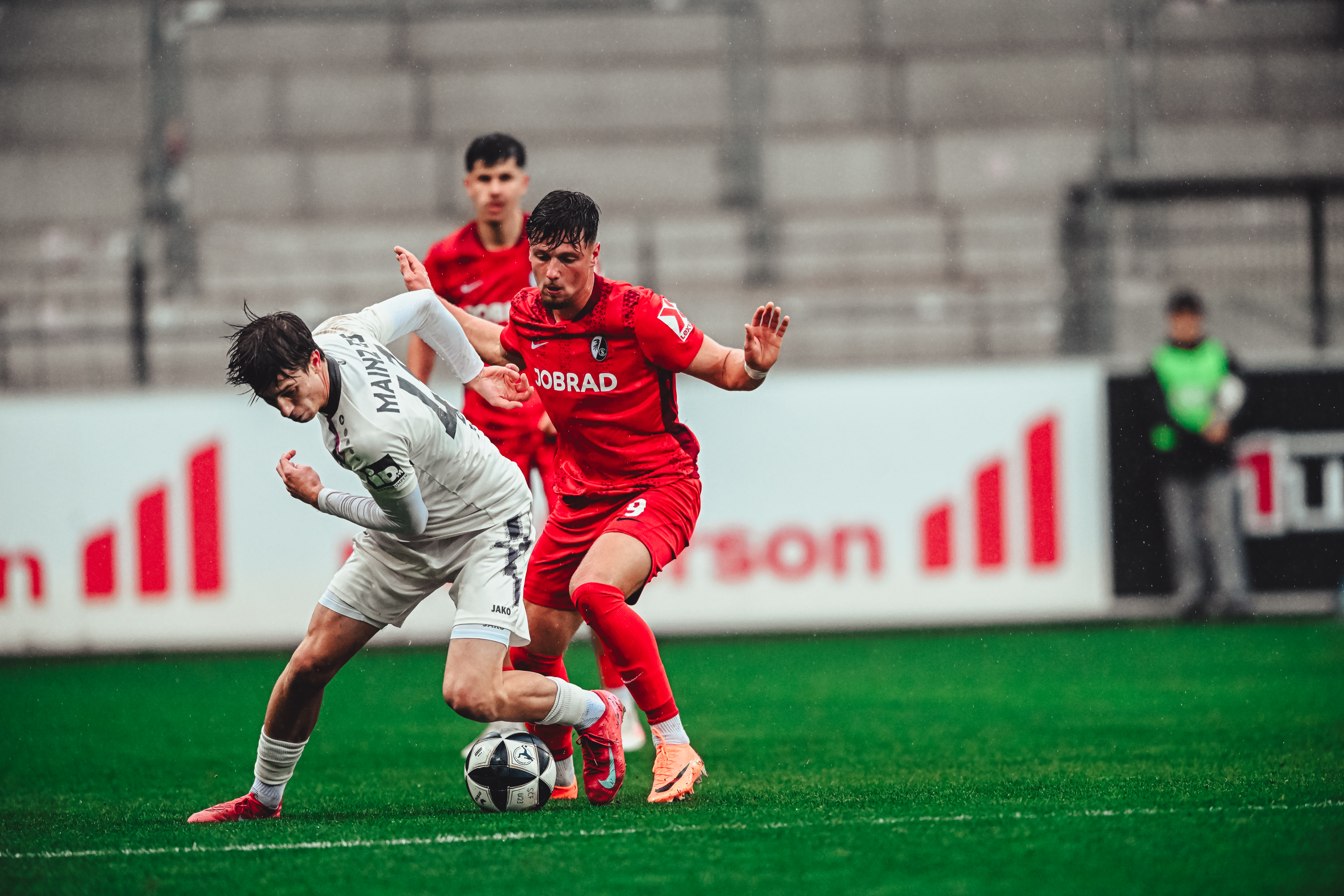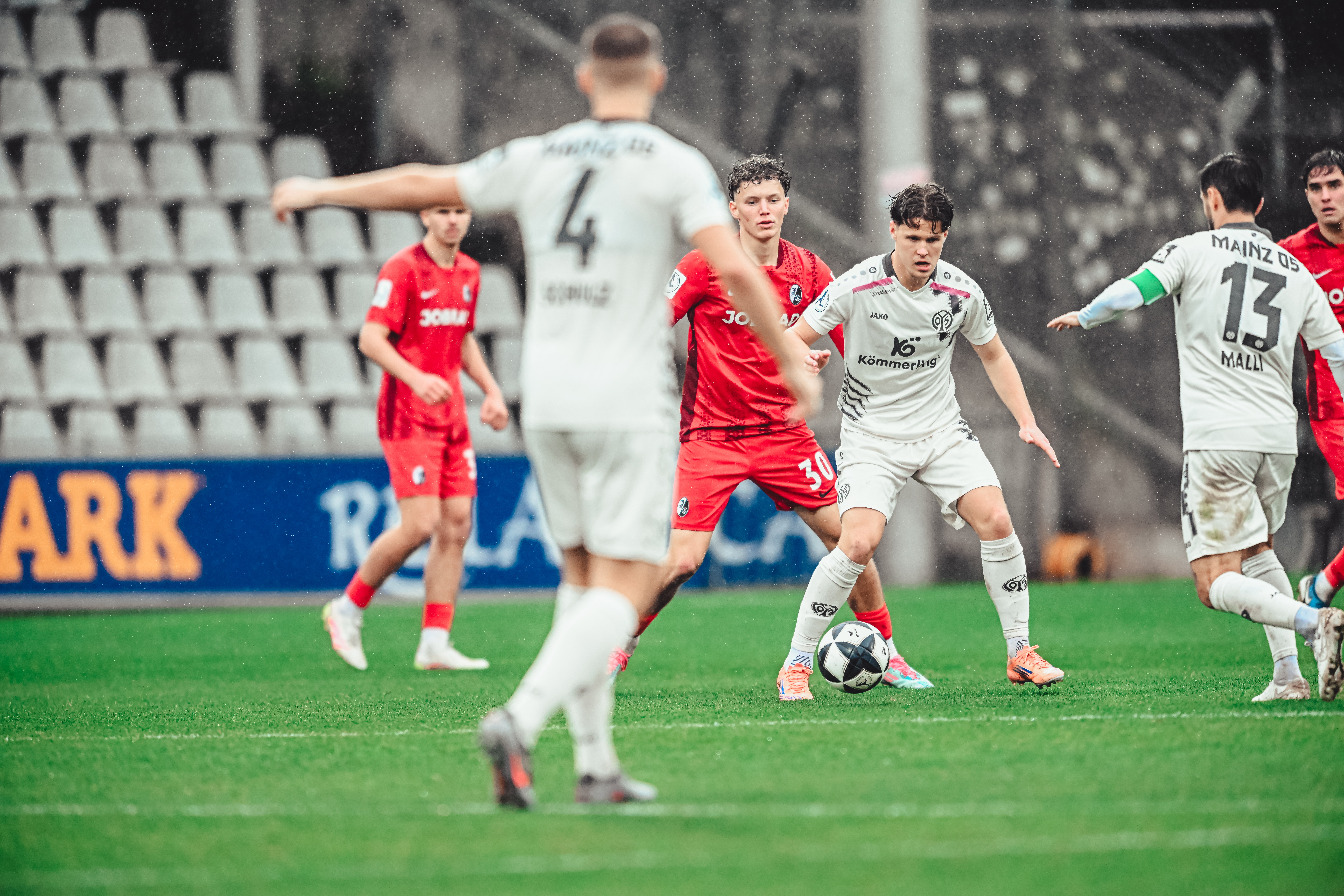Die höchste Mainzer Ausbildungsmannschaft verliert zum Abschluss der Hinrunde in der Regionalliga Südwest knapp mit 1:2 (0:1) bei der Zweitvertretung des SC Freiburg. Nachdem die 05ER in der ersten Halbzeit den Ton angaben und die Spielkontrolle größtenteils an sich reißen konnten, gingen die Breisgauer durch einen von Fabian Rüdlin verwandelten Foulelfmeter in Führung (29.), ehe Daniel Gleiber nach dem Seitenwechsel für den Ausgleich sorgte und auf 1:1 stellte (54.). Die Freiburger wurden anschließend aktiver und entfachten mehr Druck, während die Mainzer konzentriert verteidigten und über Konter Gefahr ausstrahlten, tief in der Schlussphase allerdings das Nachsehen gegenüber Freiburgs Jack James hatten, der für die erneute Führung aufseiten der Gastgeber sorgte (88.). Mit einigen offensiven Umstellungen ließen die Mainzer nichts unversucht, den erneuten Ausgleich zu erzielen, dennoch blieb es bei einem knappen Endergebnis von 1:2 und einer Niederlage für den FSV.